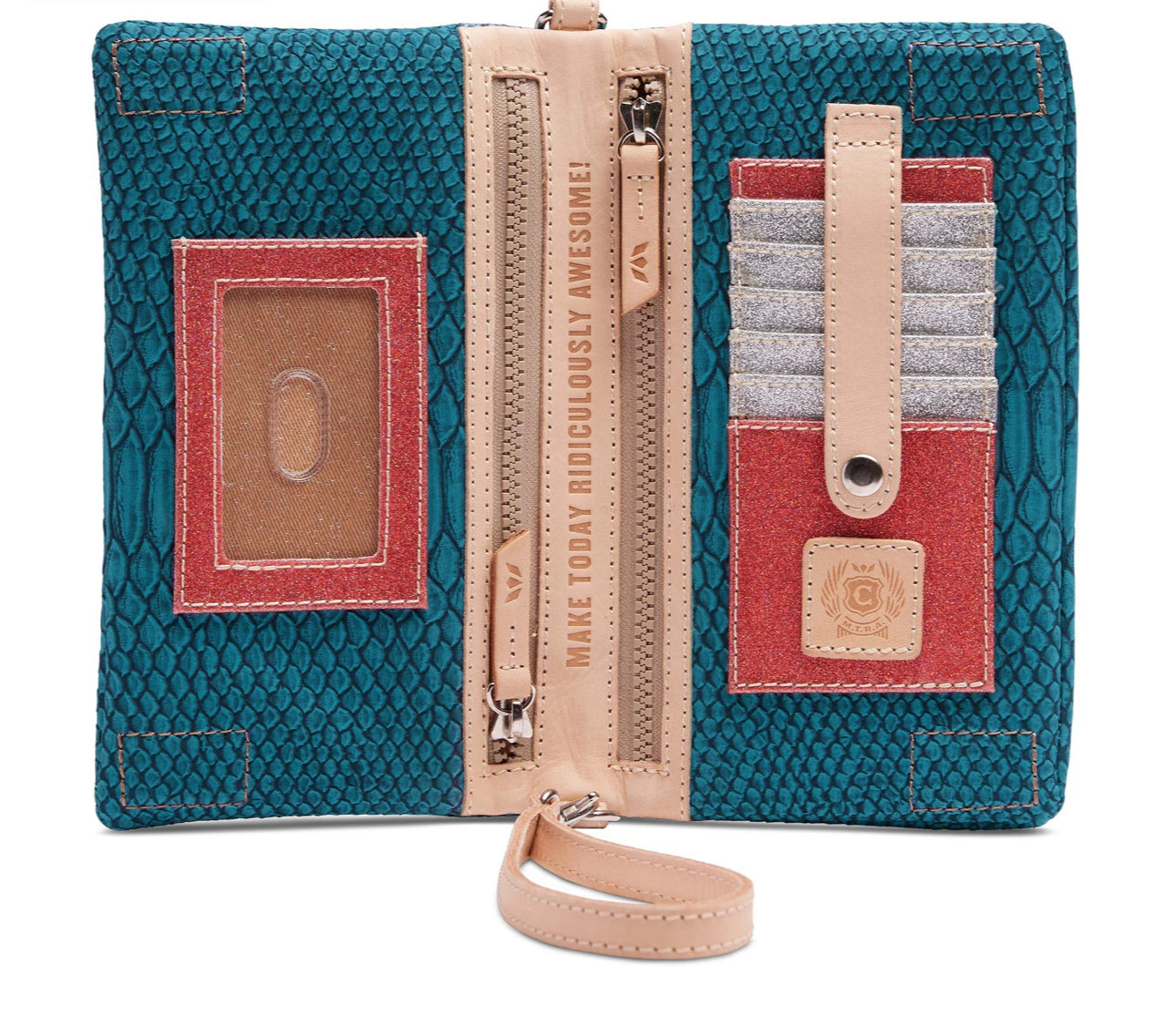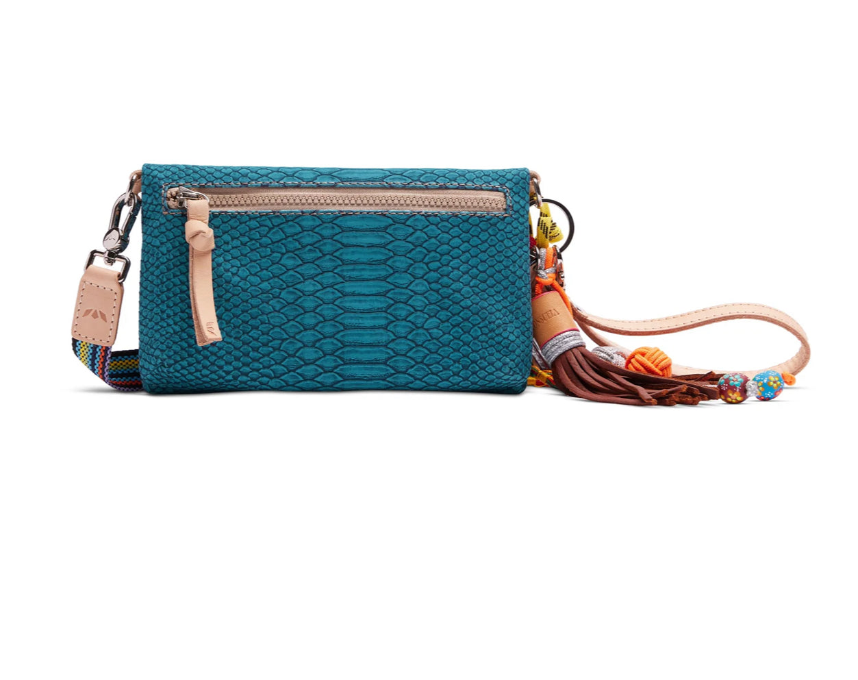 - Included detachable wristlet strap and adjustable woven crossbody strap