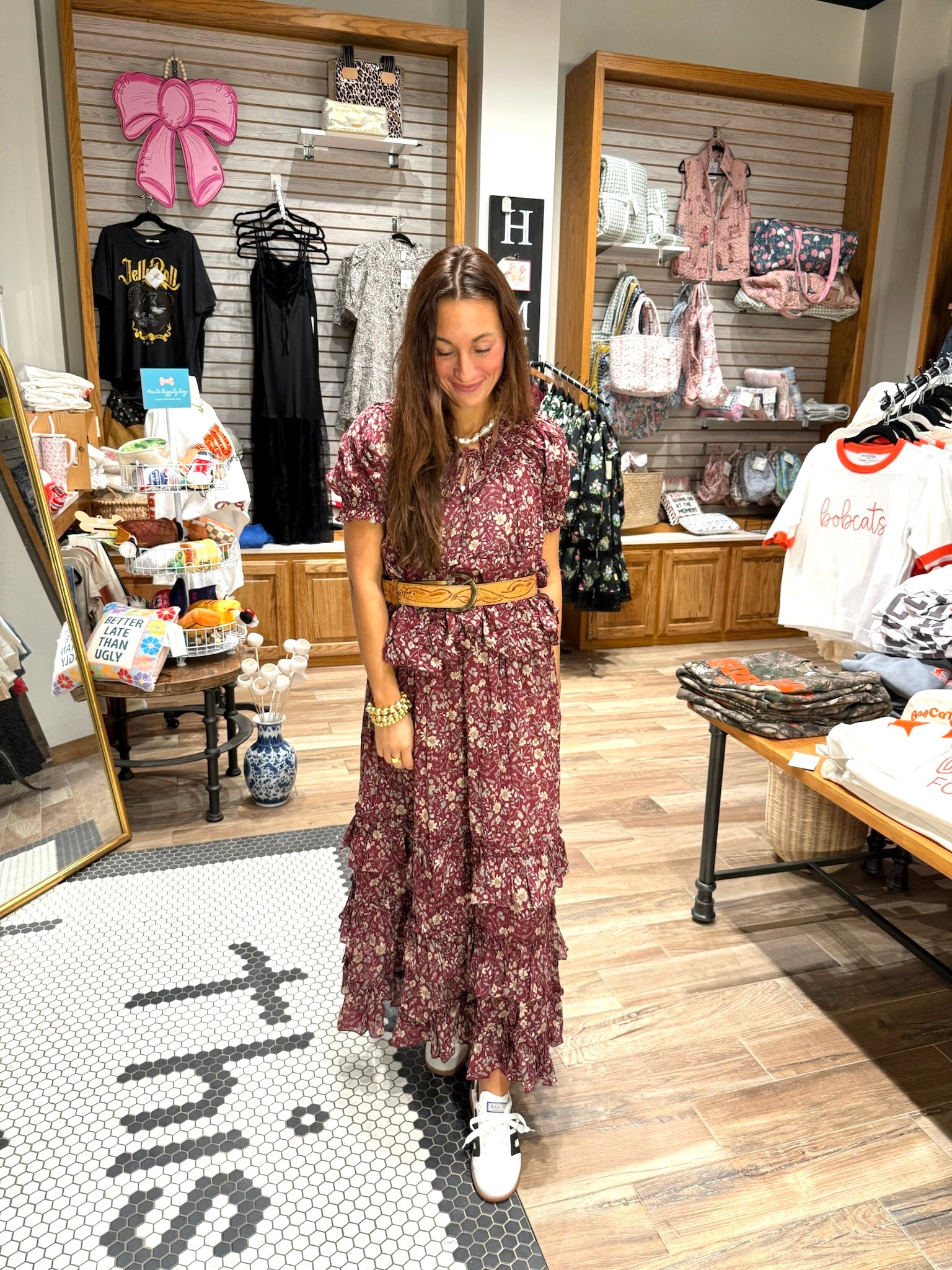 The Hillary maxi skirt features a dainty floral print in plum hues, perfect for transitioning to your fall wardrobe!