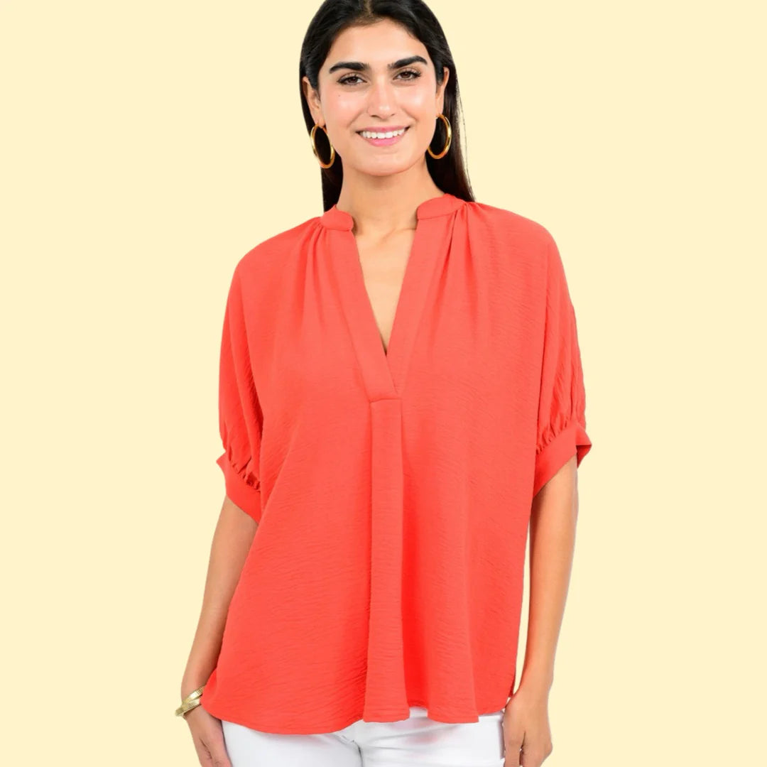 Bold and effortlessly chic, our Tuck Hem Top in a vibrant tomato hue brings a fresh pop of color to your wardrobe. Designed with a collared V-neck and playful puff sleeves, and a faux tuck front hem creates a polished, styled look.