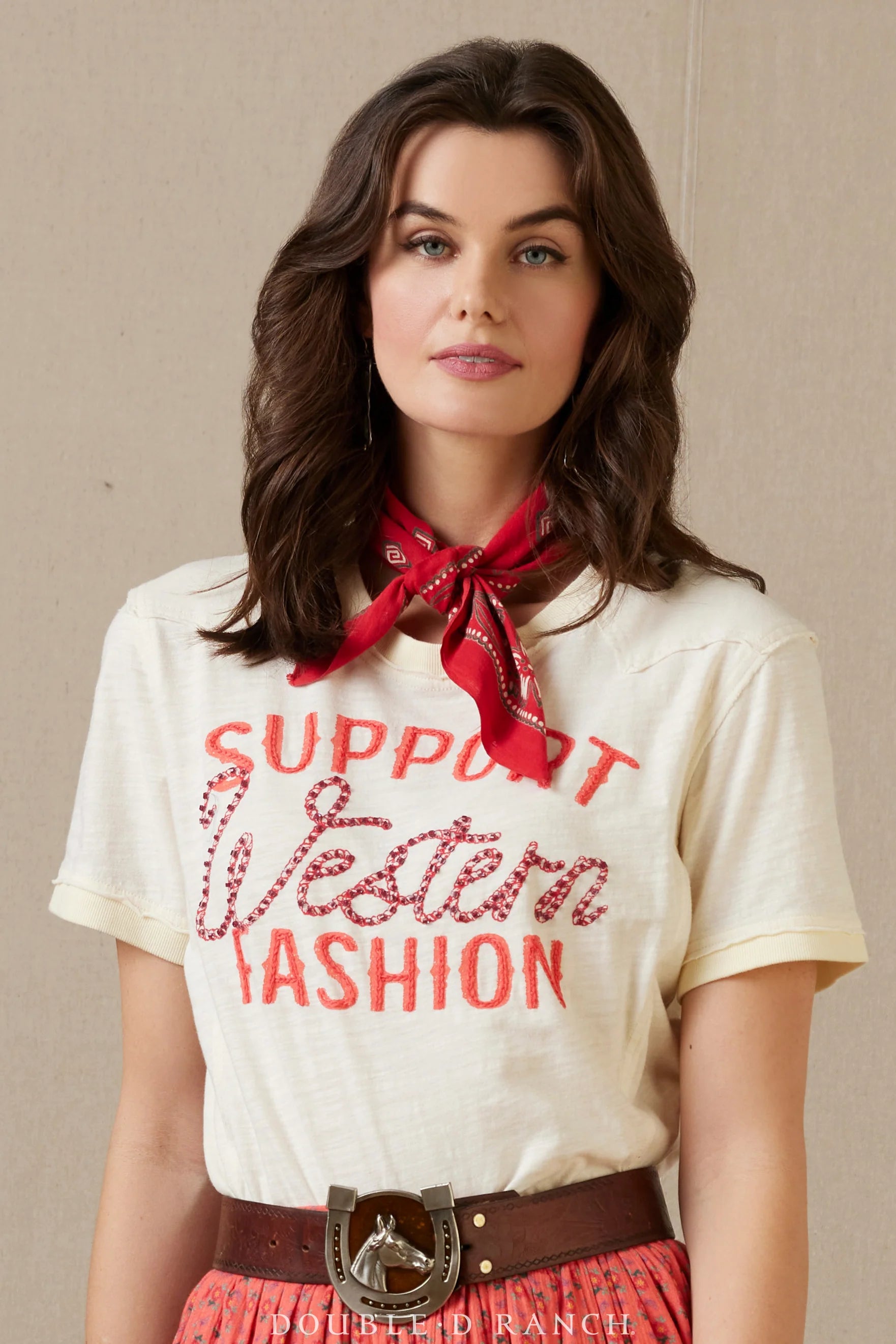 Listen, we know Western fashion isn’t going anywhere, but why not show it a little love? This colorful cotton tee can elevate your everyday outfit with subtle embellishments and a strong supportive statement.