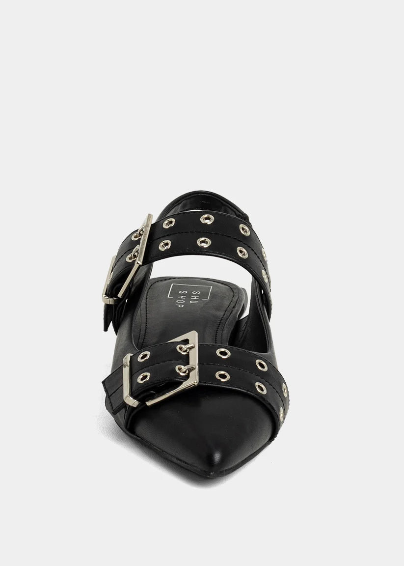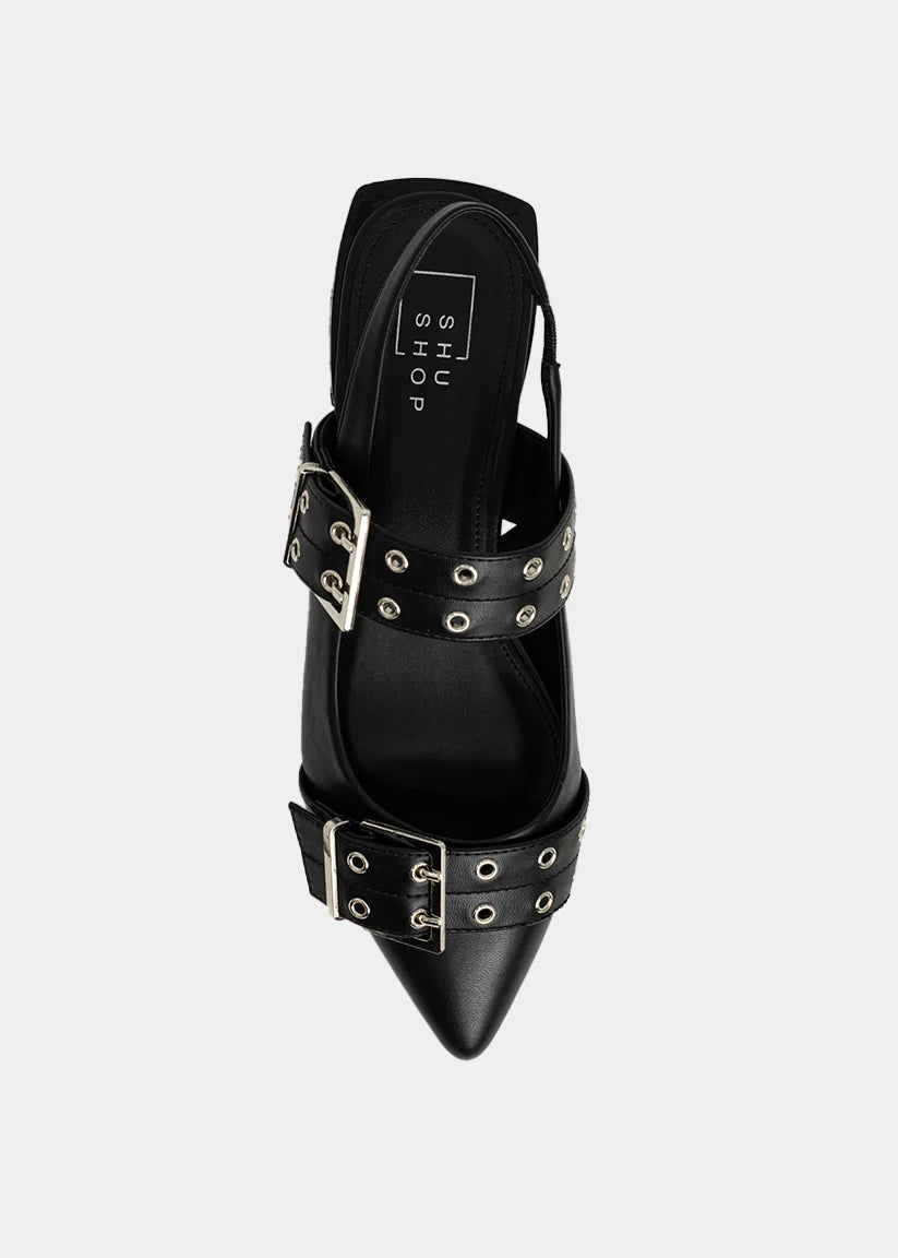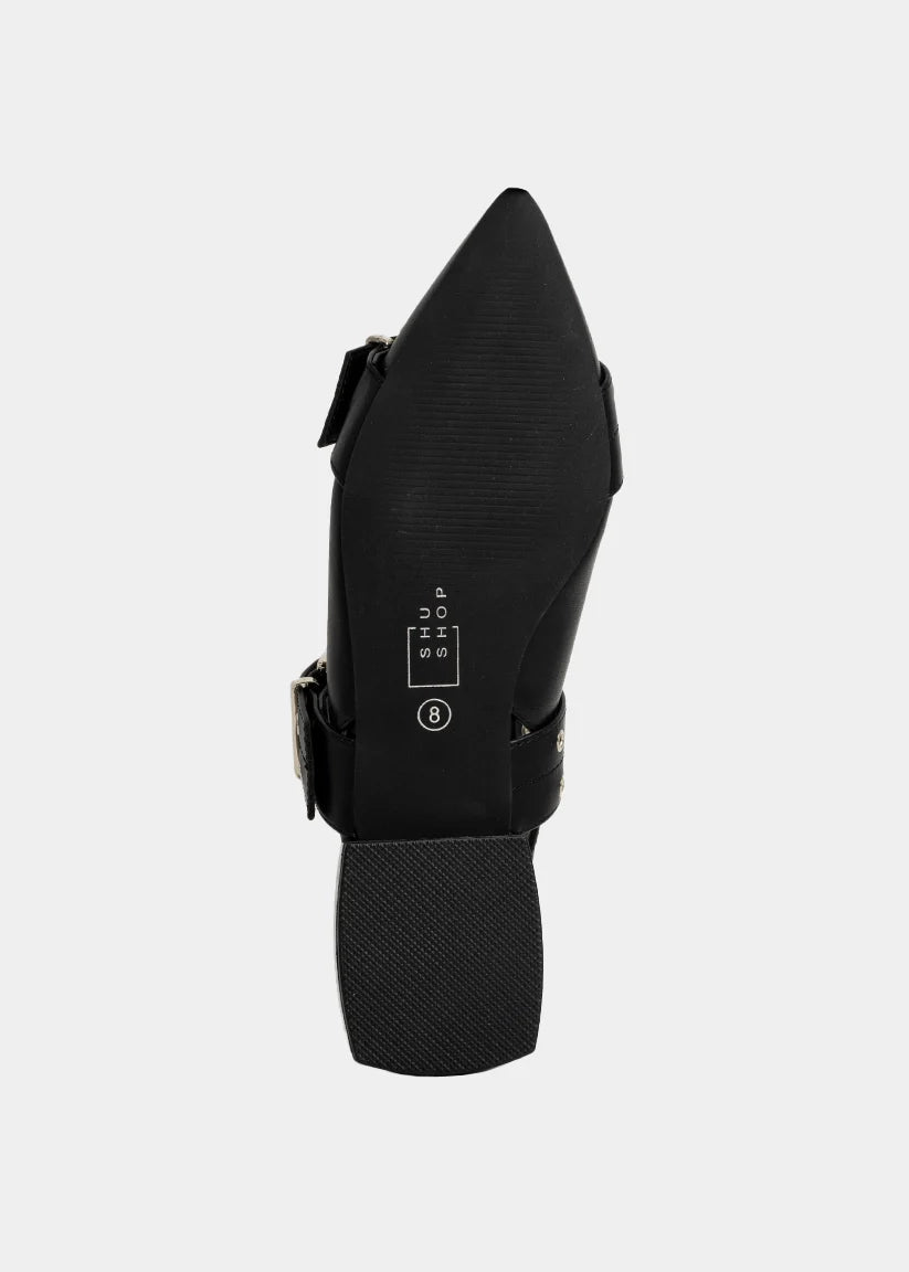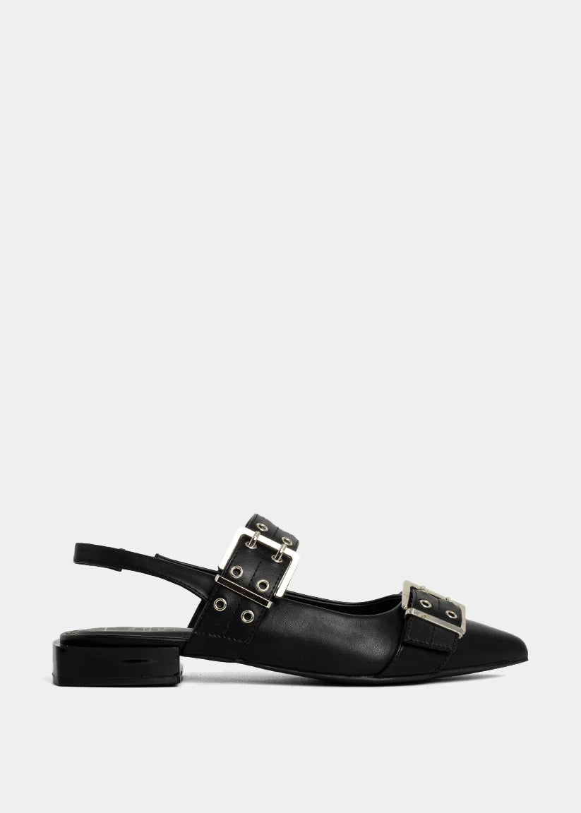 Sharp. Structured. Unapologetically cool. The ANGELA in Black is a modern flat that doesn’t play it safe. With bold oversized buckle straps, a pointed toe, and slingback silhouette, this pair blends edge and polish in equal parts. Whether you’re styling it for the office or after-hours, it brings instant attitude to your everyday look-no heels required. Because flats can be just as fierce.