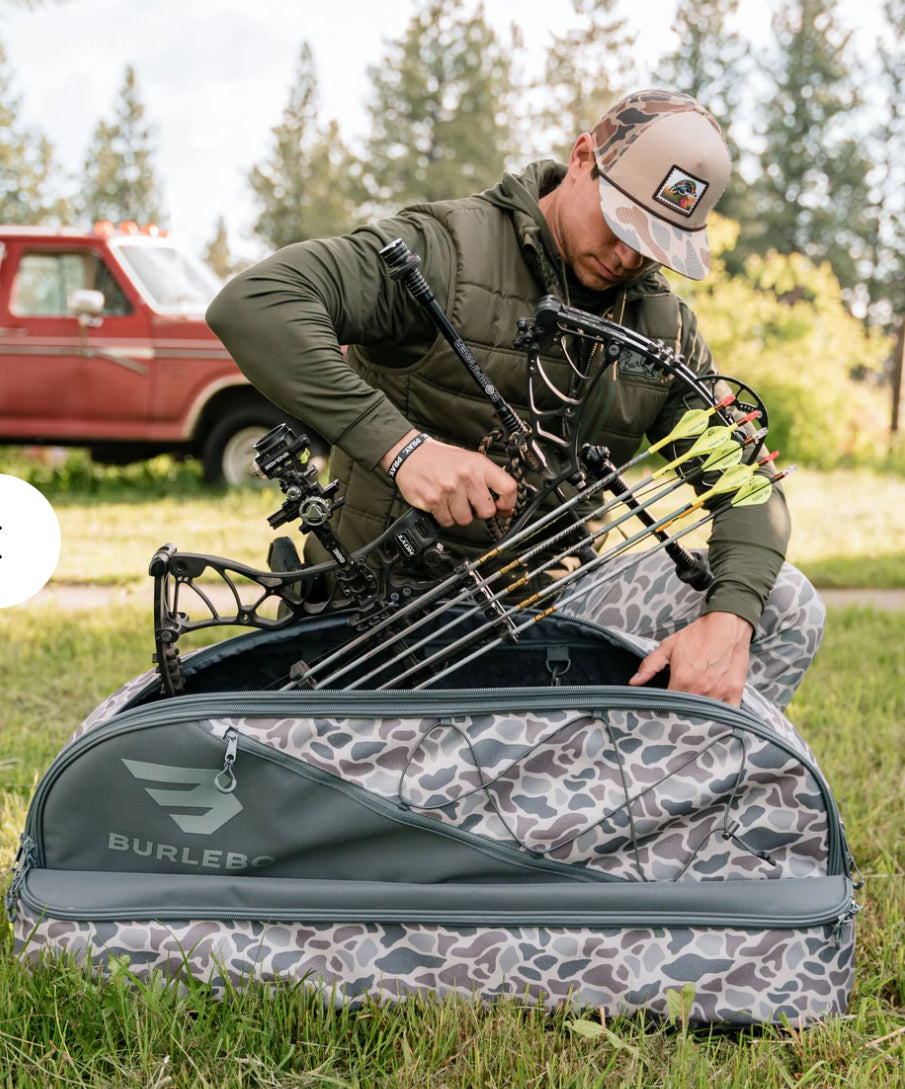 Main zippered compartment features a string and cam cradle with deep fleece lining and bow tie downs.