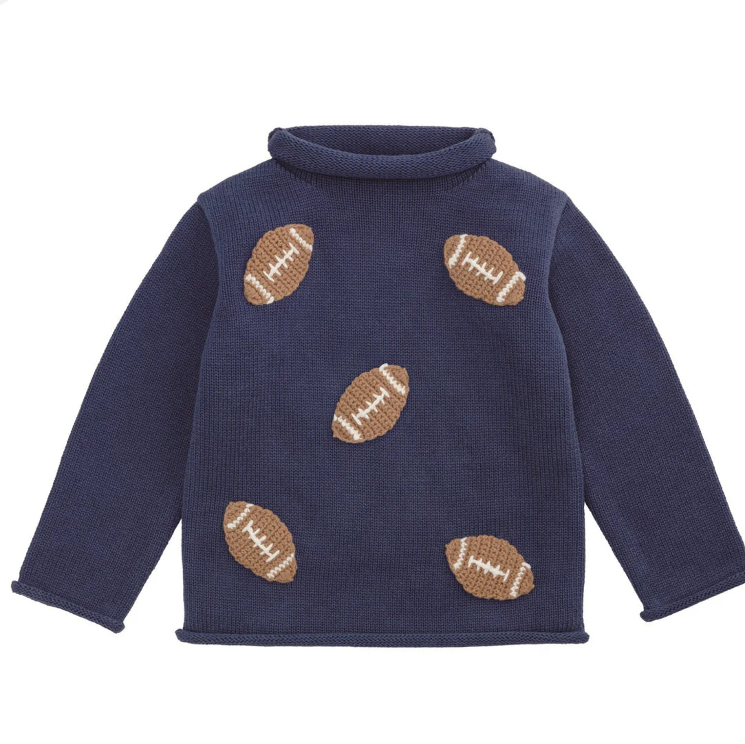 Cozy cotton yarn sweater featuring a rolled neck and adorable mini crochet footballs for a fun sporty vibe. 100% Cotton
