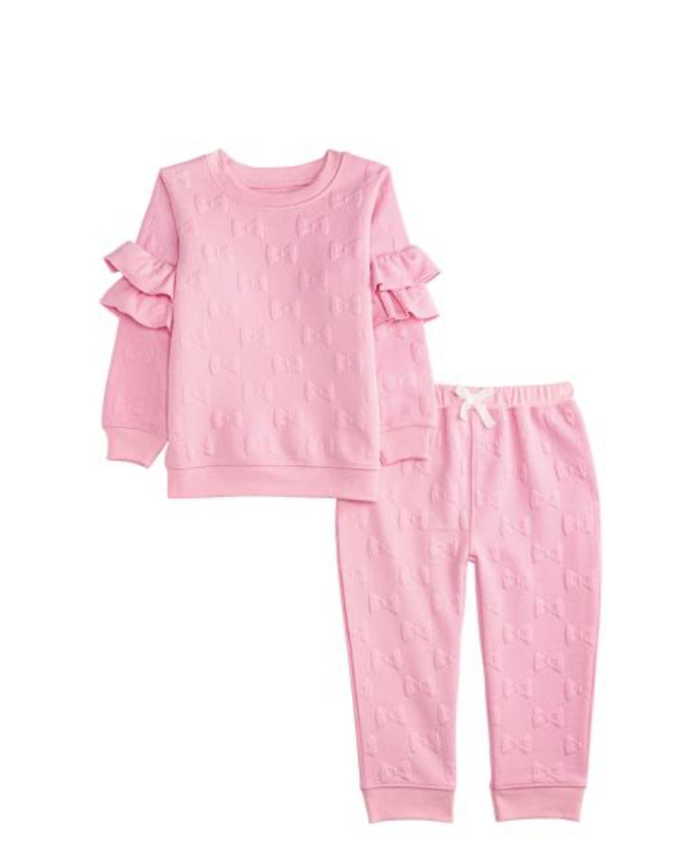 The Quilted Bow Toddler Jogger Set is a charming 2-piece ensemble designed for both style and comfort. The top showcases a delightful quilted bow jacquard pattern, adding a touch of elegance to your little one's wardrobe. Ruffle sleeves enhance the playful design, while the ribbed neckline, sleeve openings, and hem ensure a snug fit. The set includes coordinating pull-on pants, making it easy to dress your toddler for any occasion. Available in large sizes 4T-5T, this set is crafted from a soft and durable blend of 98% Polyester and 2% Spandex, providing flexibility and ease of movement for active toddlers. Perfect for playdates, outings, or casual wear, this jogger set combines practicality with adorable style.