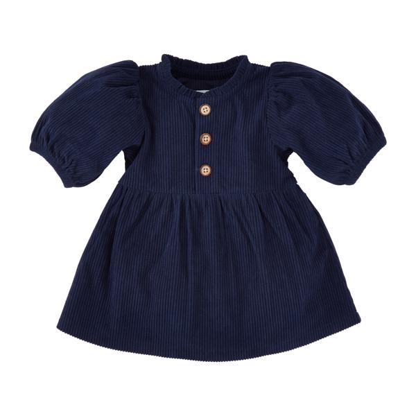 The Navy Corduroy Dress is a stylish and comfortable option for your little one. Made from soft corduroy fabric, this dress is perfect for cooler weather. It features three-quarter length sleeves, providing just the right amount of coverage. The dress also includes a coconut wood button placket, adding a unique and natural touch. With its classic navy color, this dress is versatile and can be dressed up or down for any occasion. Available in sizes 12-18 months, this corduroy dress is a must-have addition to your child's wardrobe.