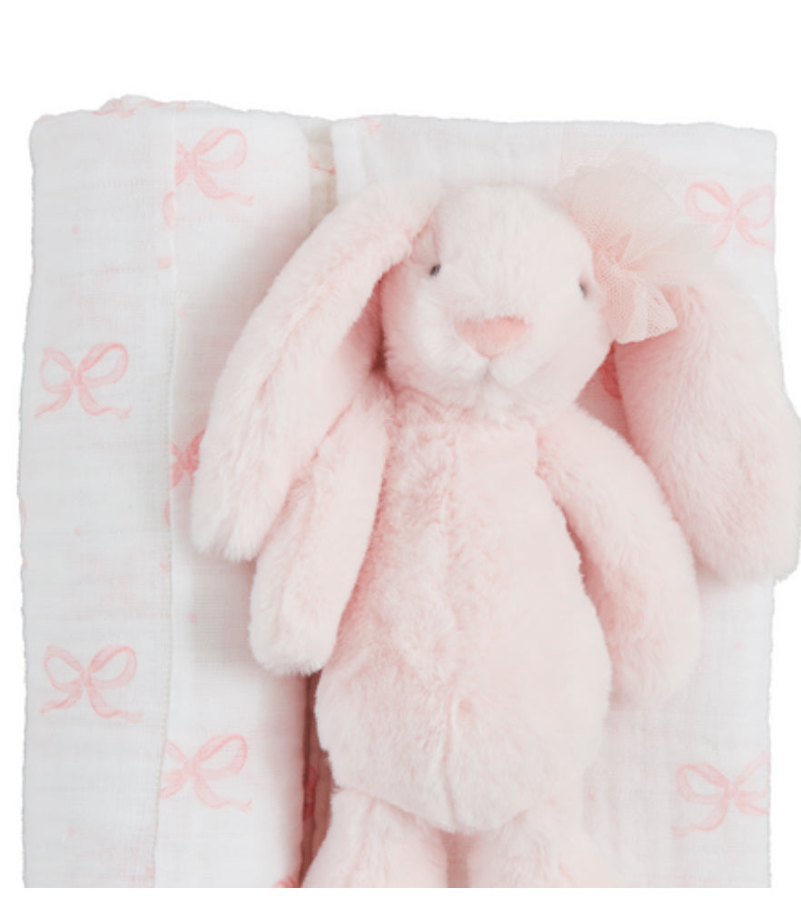 Bow Swaddle And Rattle Set is a delightful 2-piece collection perfect for new parents and their little ones. The set includes a generously sized muslin swaddle blanket, measuring 47 inches by 47 inches, crafted from 100% cotton for a soft and breathable feel, ideal for keeping your baby cozy and comfortable. Accompanying the swaddle is an adorable plush mini bunny rattle, measuring 5 3/4 inches, made from 100% polyester faux fur, providing a gentle and soothing sound to entertain and calm your baby. This charming set combines functionality with playful design, making it a thoughtful gift for baby showers or a lovely addition to your nursery essentials.