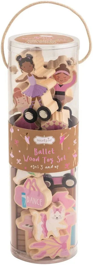 13-piece set includes: three ballerinas, stage, ballet bar, mirror, piano, cat and three ballet accessories. Ages 3+