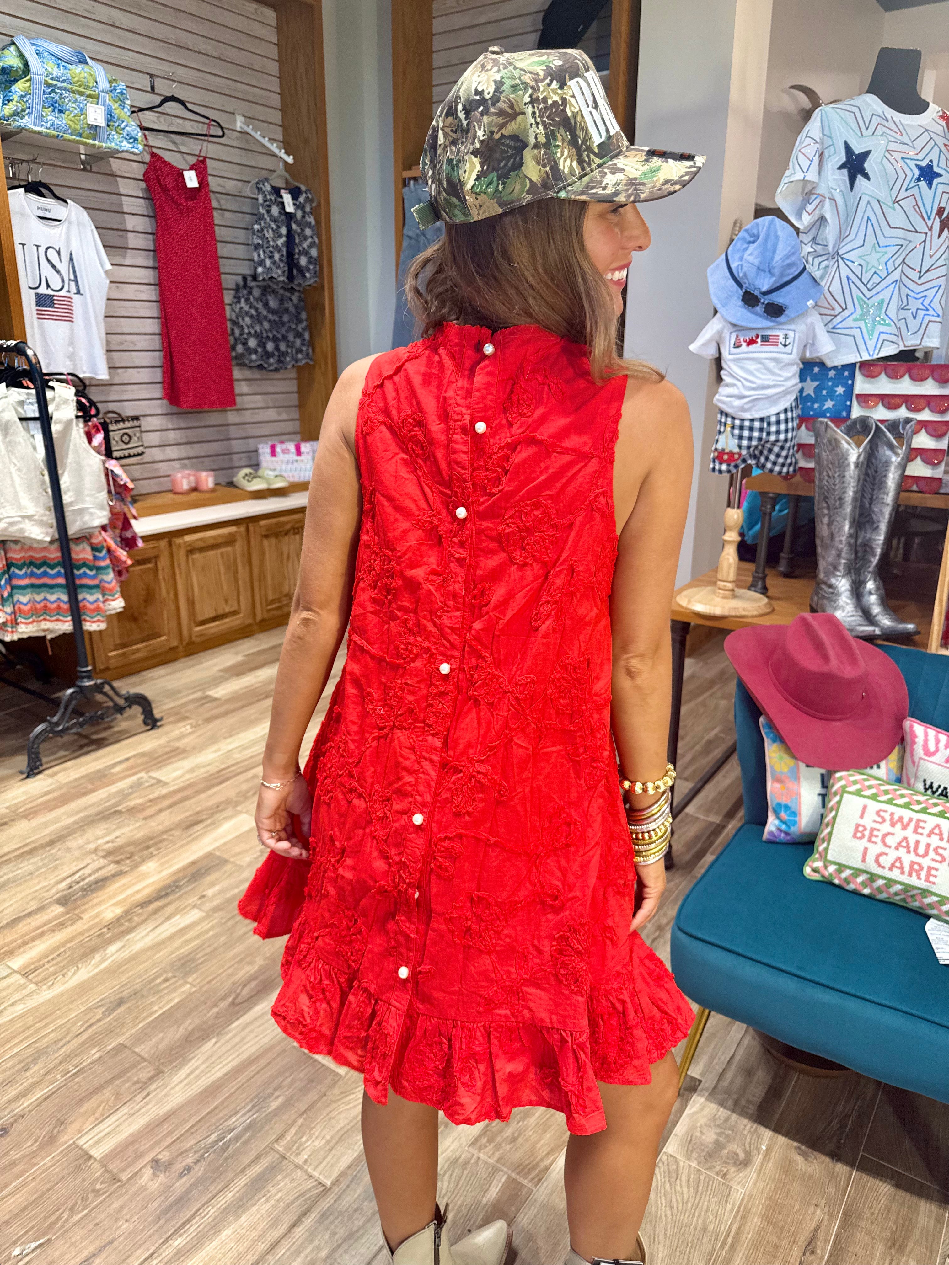 Solid ruffle hem sleeveless mini dress featuring pearl accent button closure at back. Pockets at sides. Lined. Woven. Non-sheer. Lightweight.