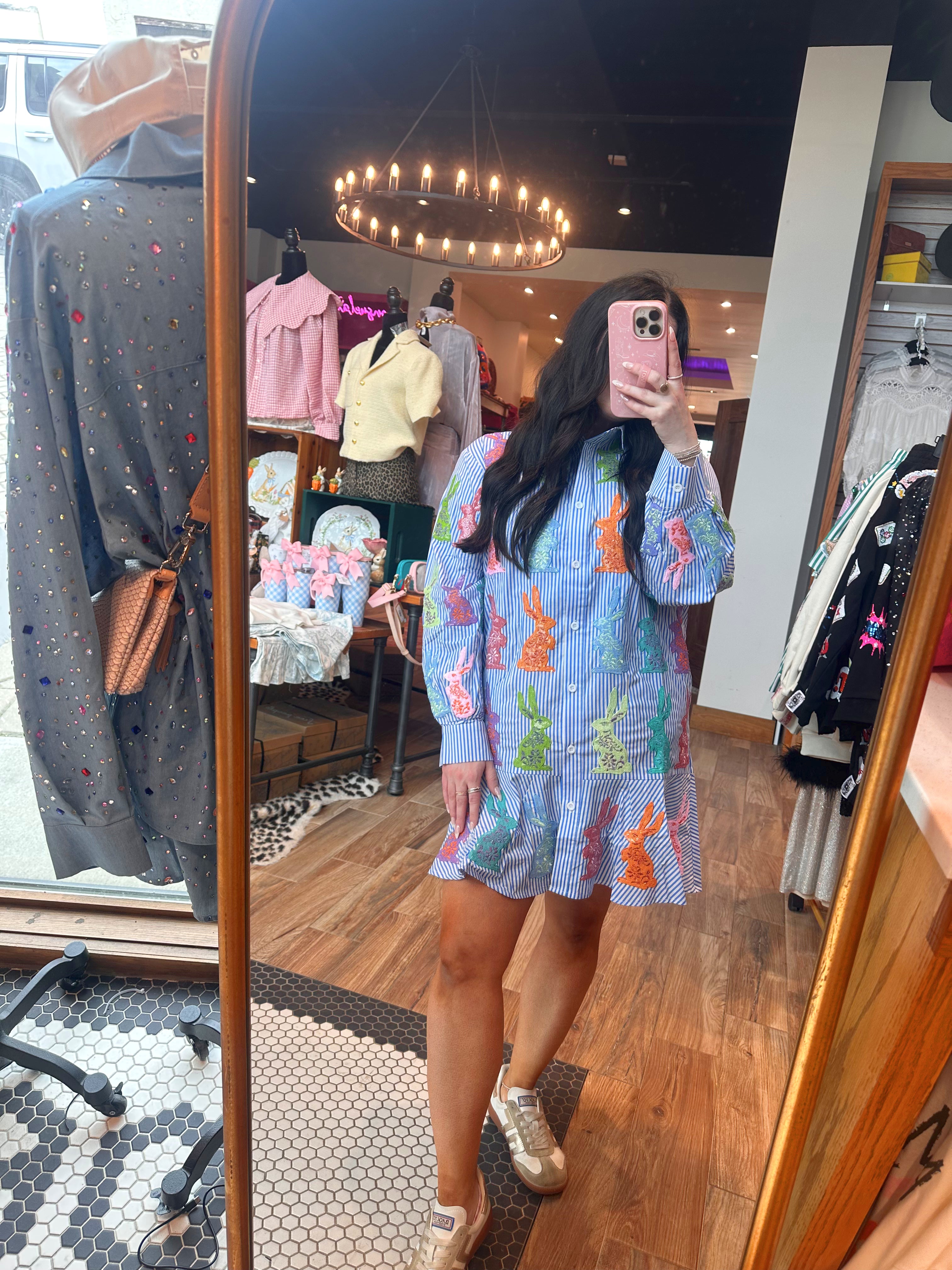 Blue & White Striped Multi Easter Bunny Button Up Cotton Dress