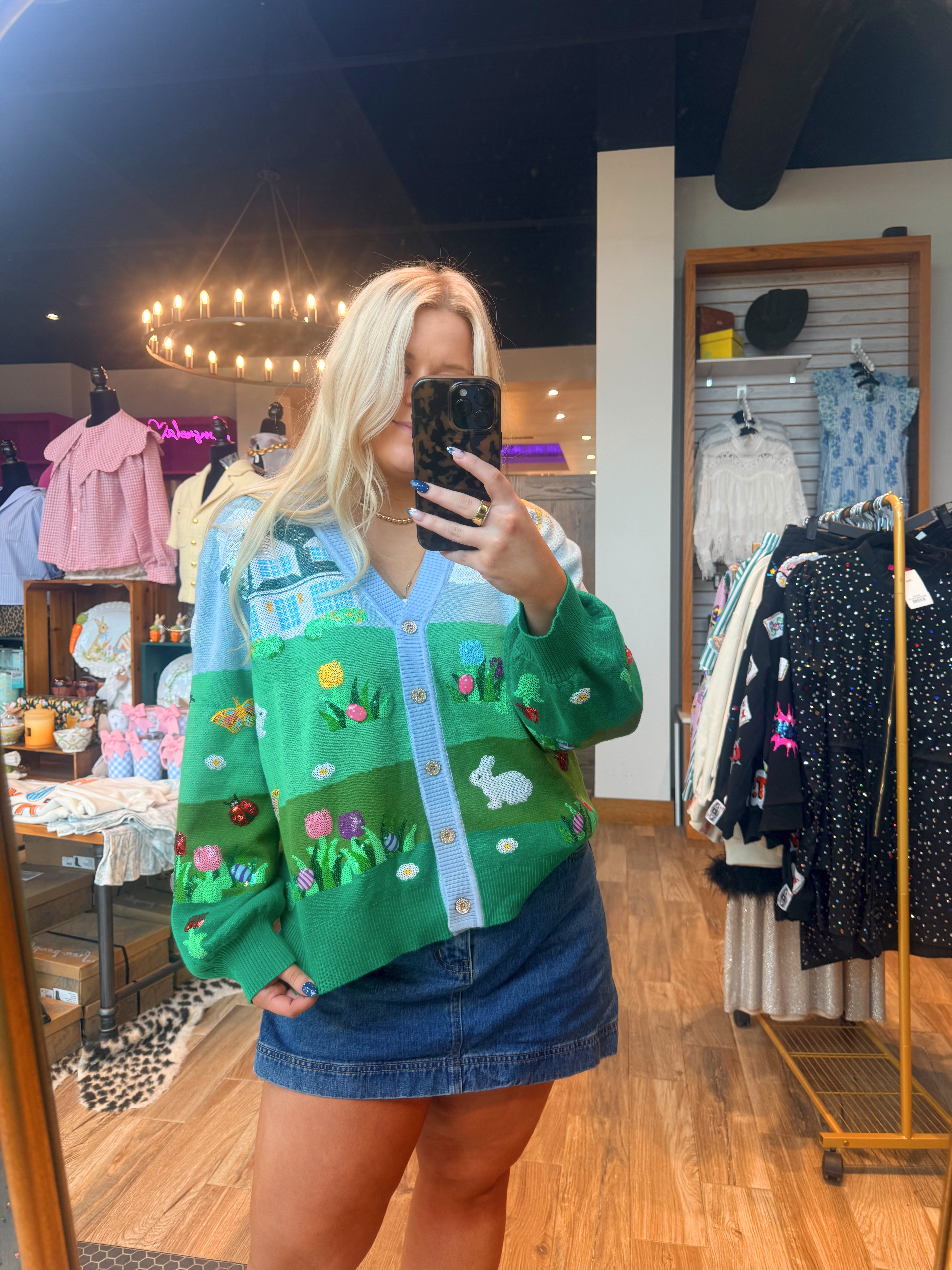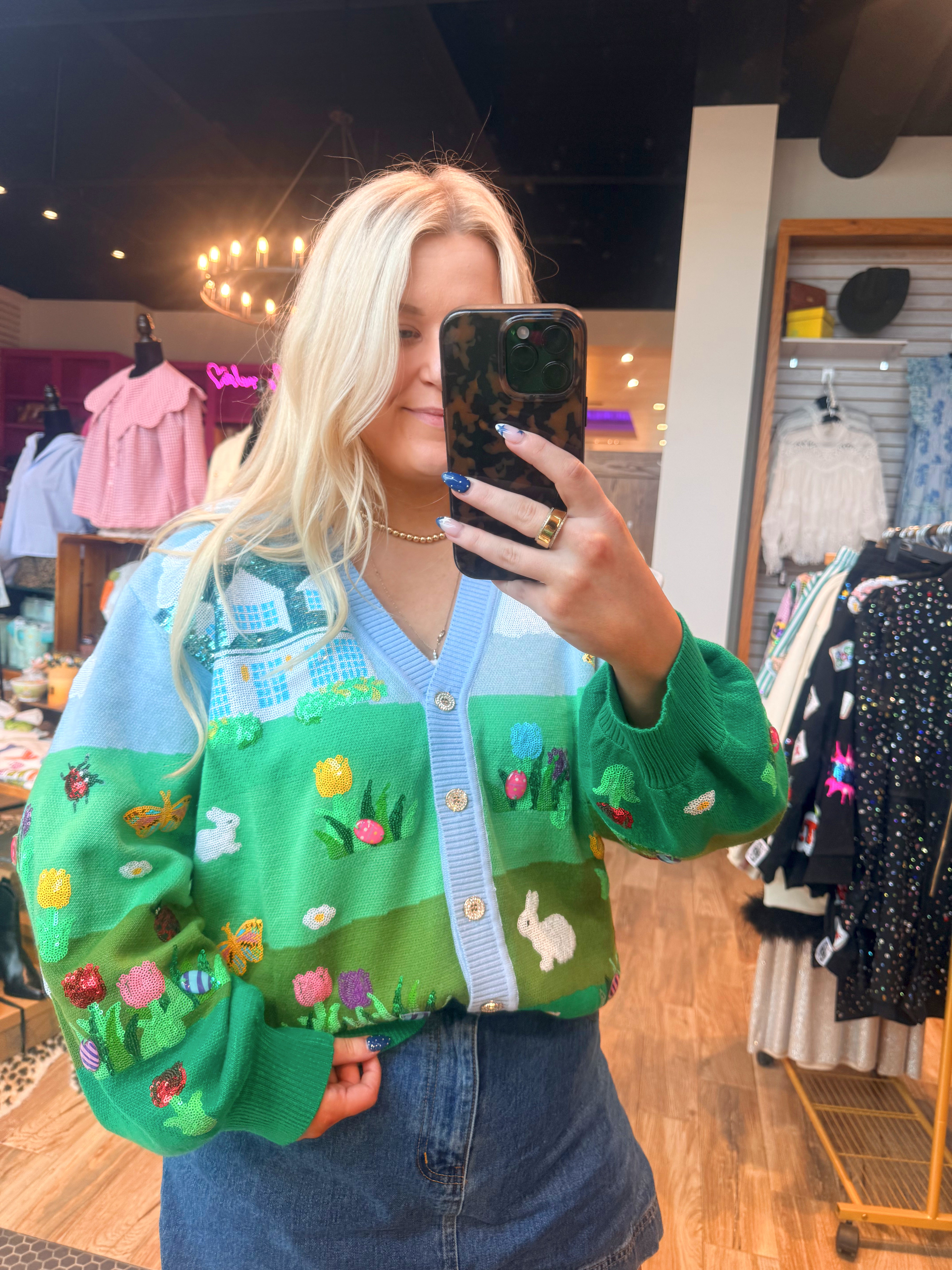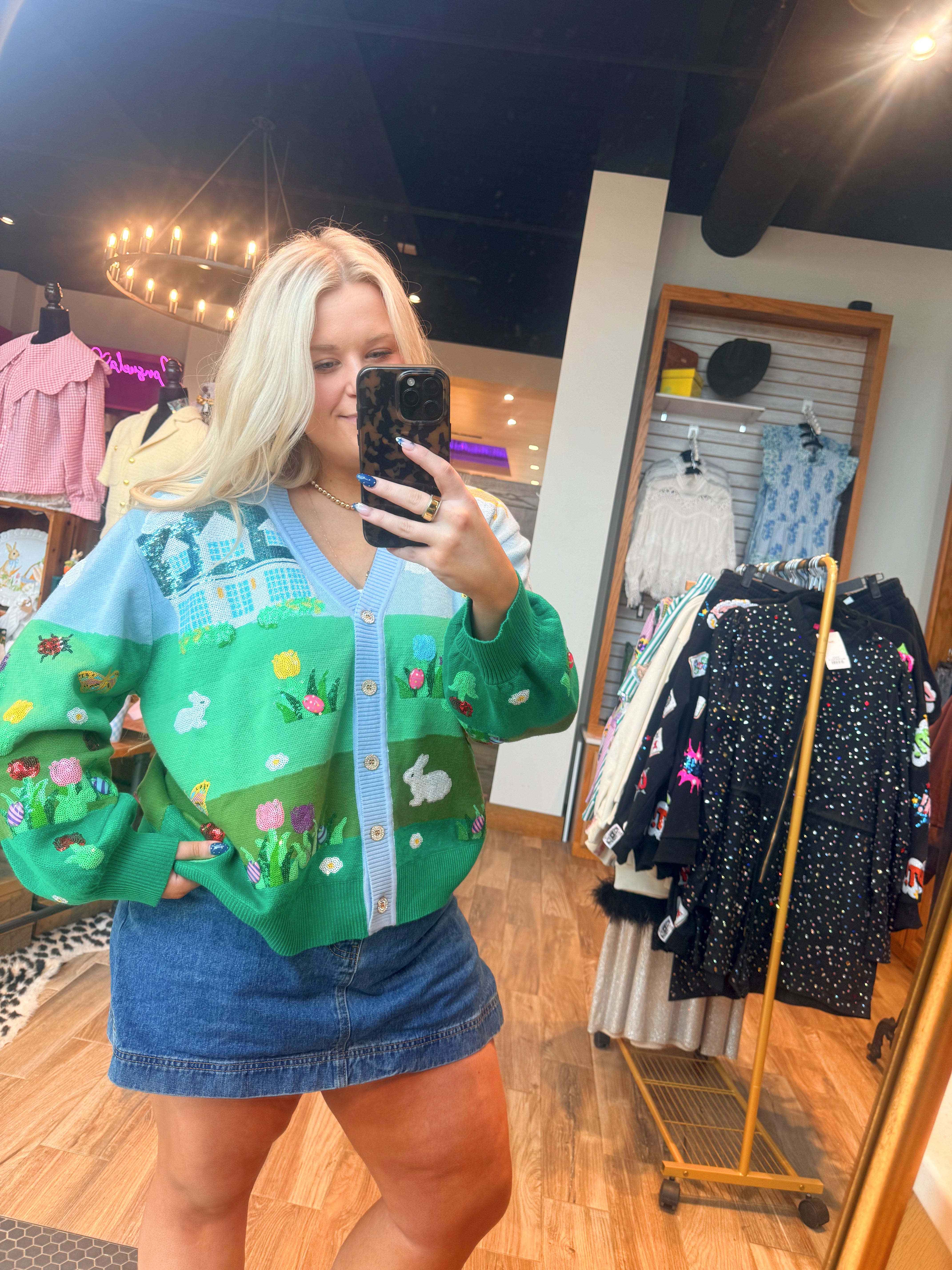 Easter Bunnies & Eggs In Yard Scene Button Up Cardigan