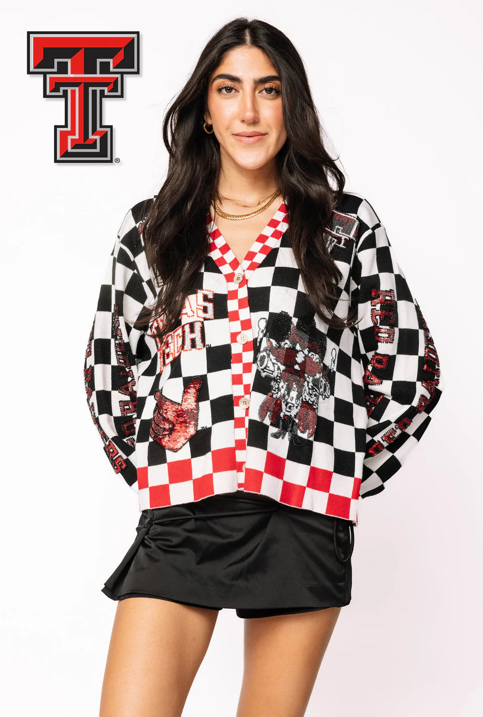 Show off your Texas Tech pride with this stylish cardigan featuring a classic checkered print and shimmering Texas Tech sequin icons scattered throughout. Designed for comfort and team spirit, it’s perfect for cheering on your Red Raiders in style while staying cozy. Elevate your game-day wardrobe with this standout piece that seamlessly blends bold design and fan loyalty.