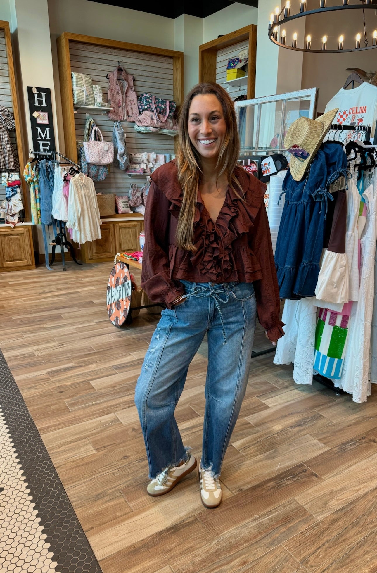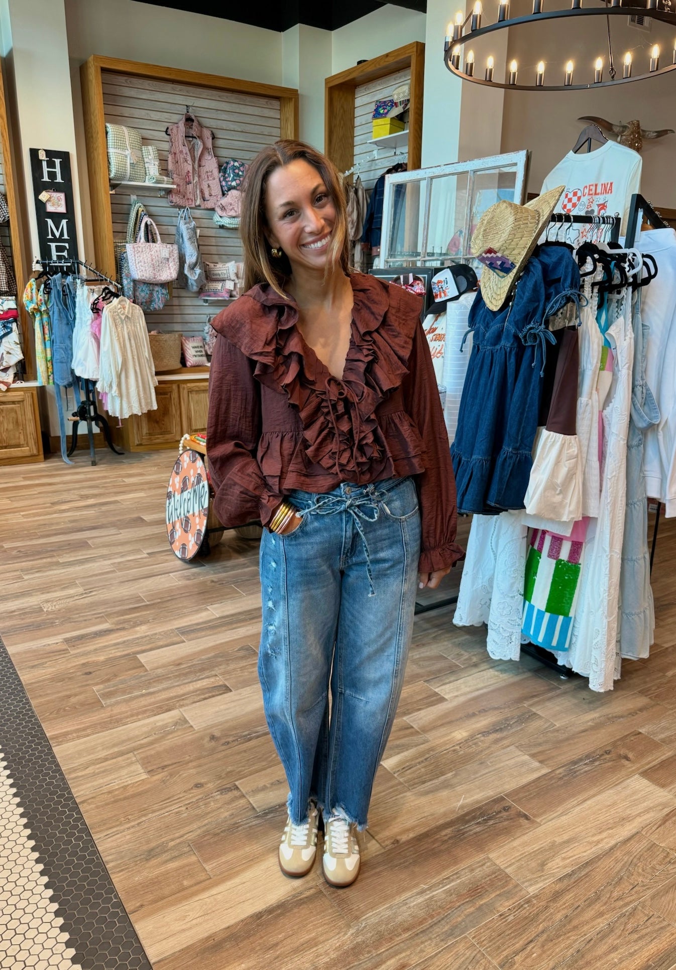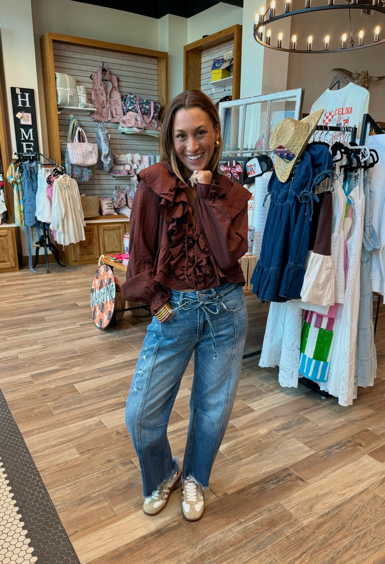 The Linely ruffled blouse is luxe with a rich chocolate brown and a v-neck ruffle detail with a slight crop hemline!