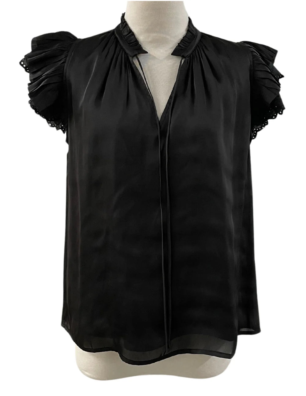 Get ready to turn heads in the Lucia Top! This relaxed fit blouse features two layers of ruffle sleeves, adding a playful touch to your wardrobe. The embroidered sleeves and V neckline add a touch of elegance, while the ruffle collar and neck ties make this top stand out from the rest. Made with a luxurious silky fabric, this top is perfect for any occasion.