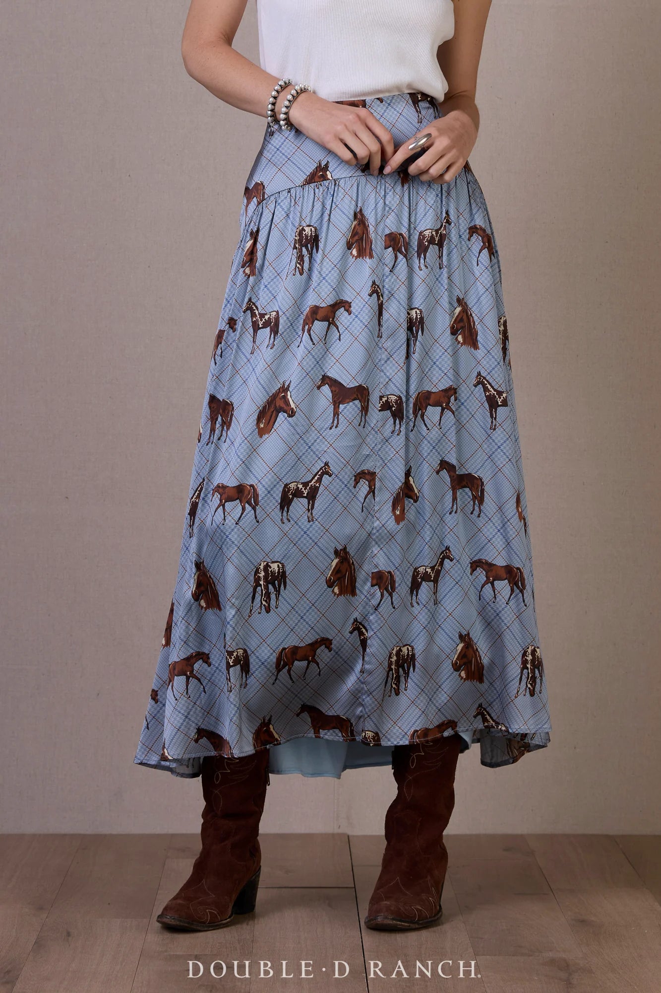 Well, what’s not to love about that winning combo? We are so pleased with how this print turned out, incorporating the underlying element of a subtle askew glen plaid and adorned with imagery of the collection’s cornerstone: horses. It all came together elegantly and works beautifully in this flowy, feminine silk skirt.