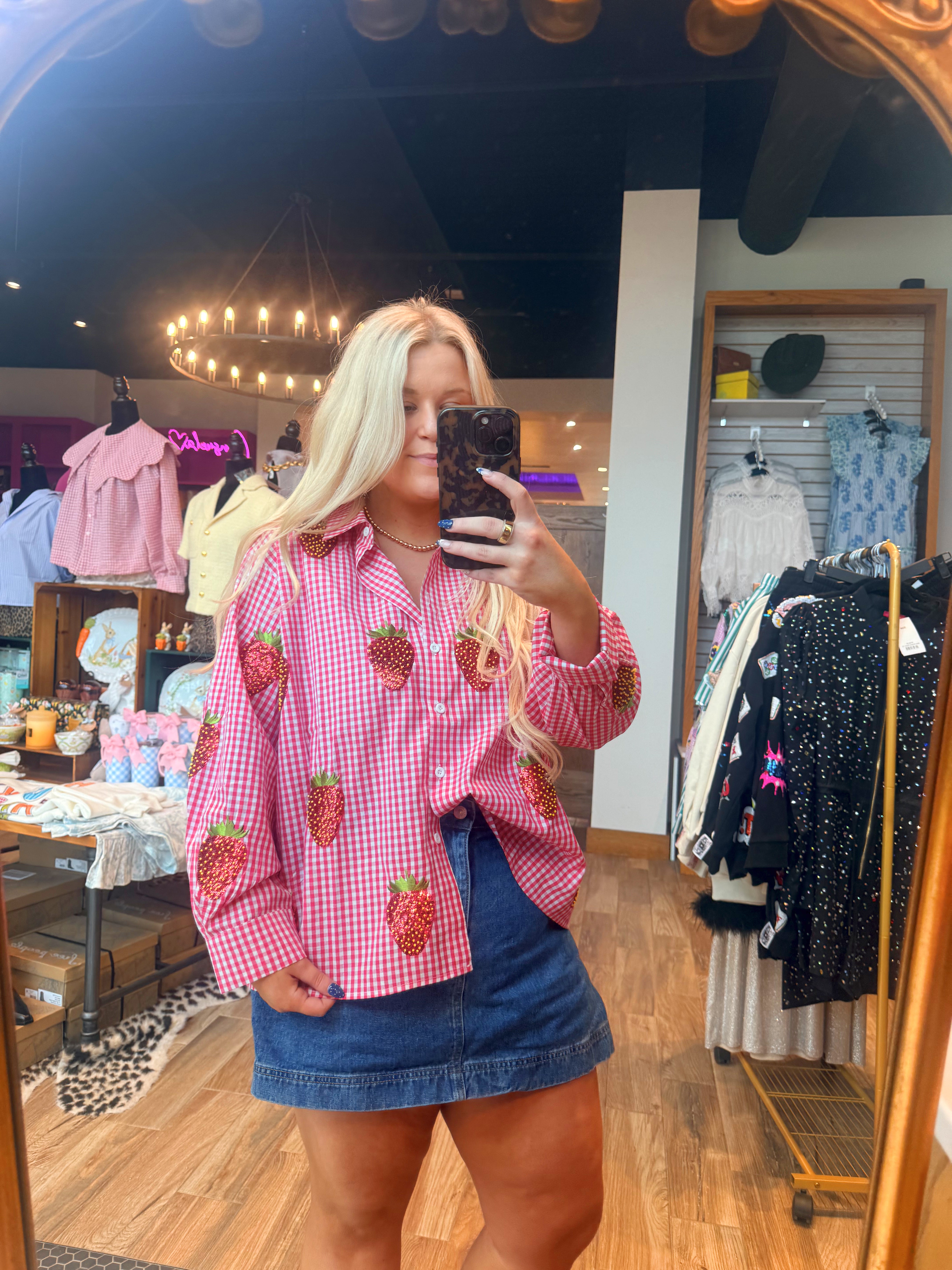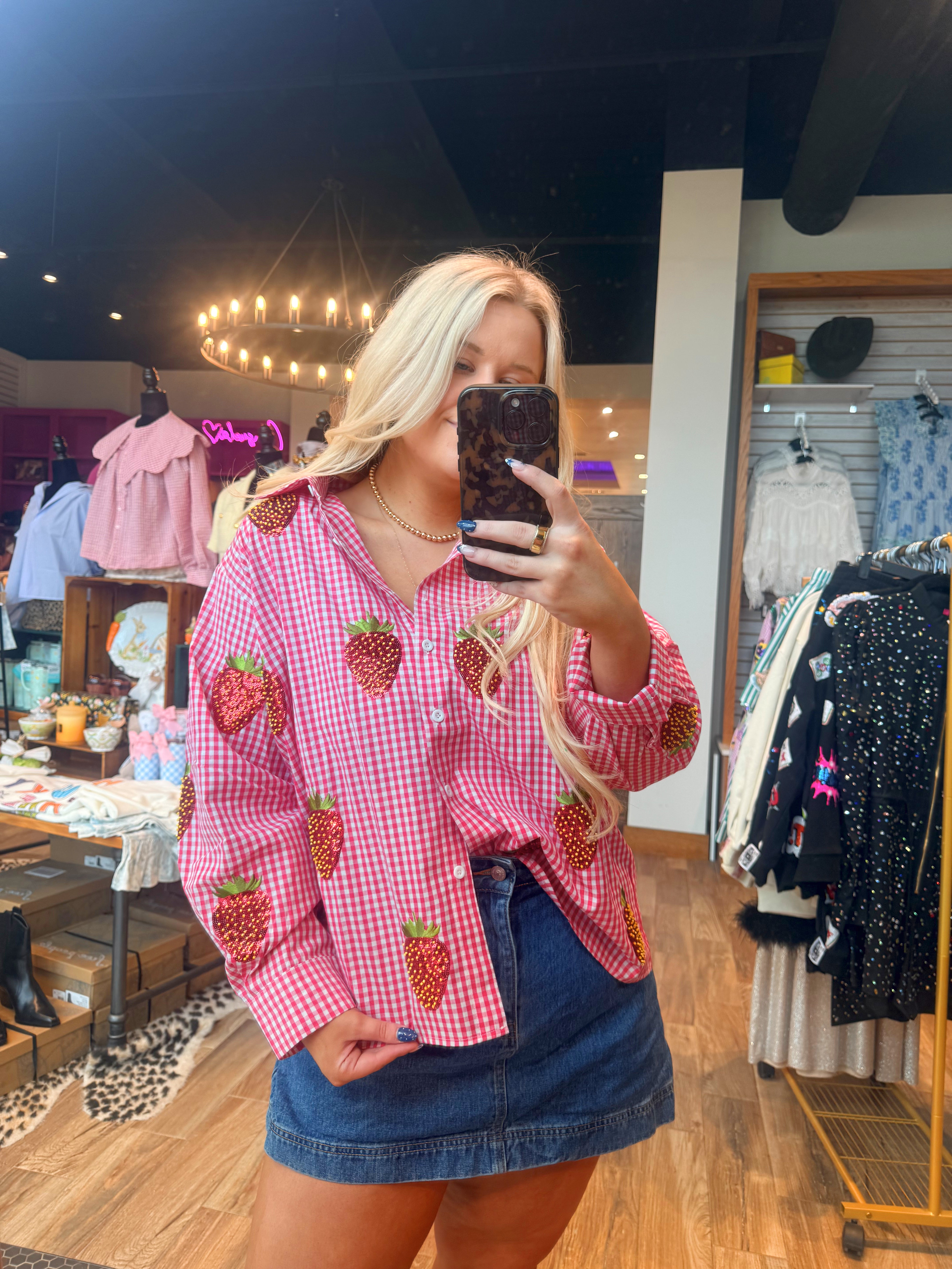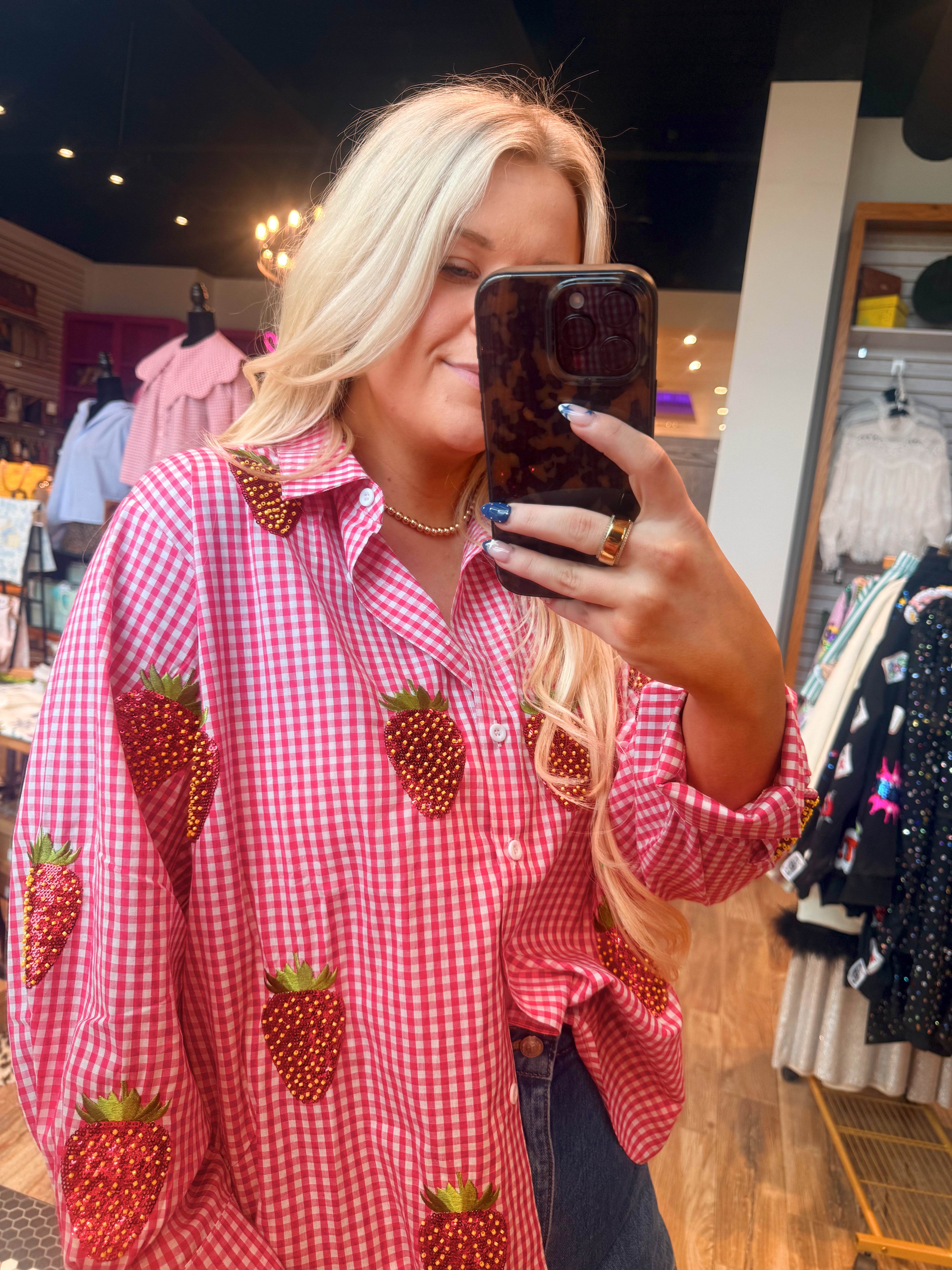 Red & White Gingham Beaded Strawberry Button Up Cotton Long Sleeve Top
