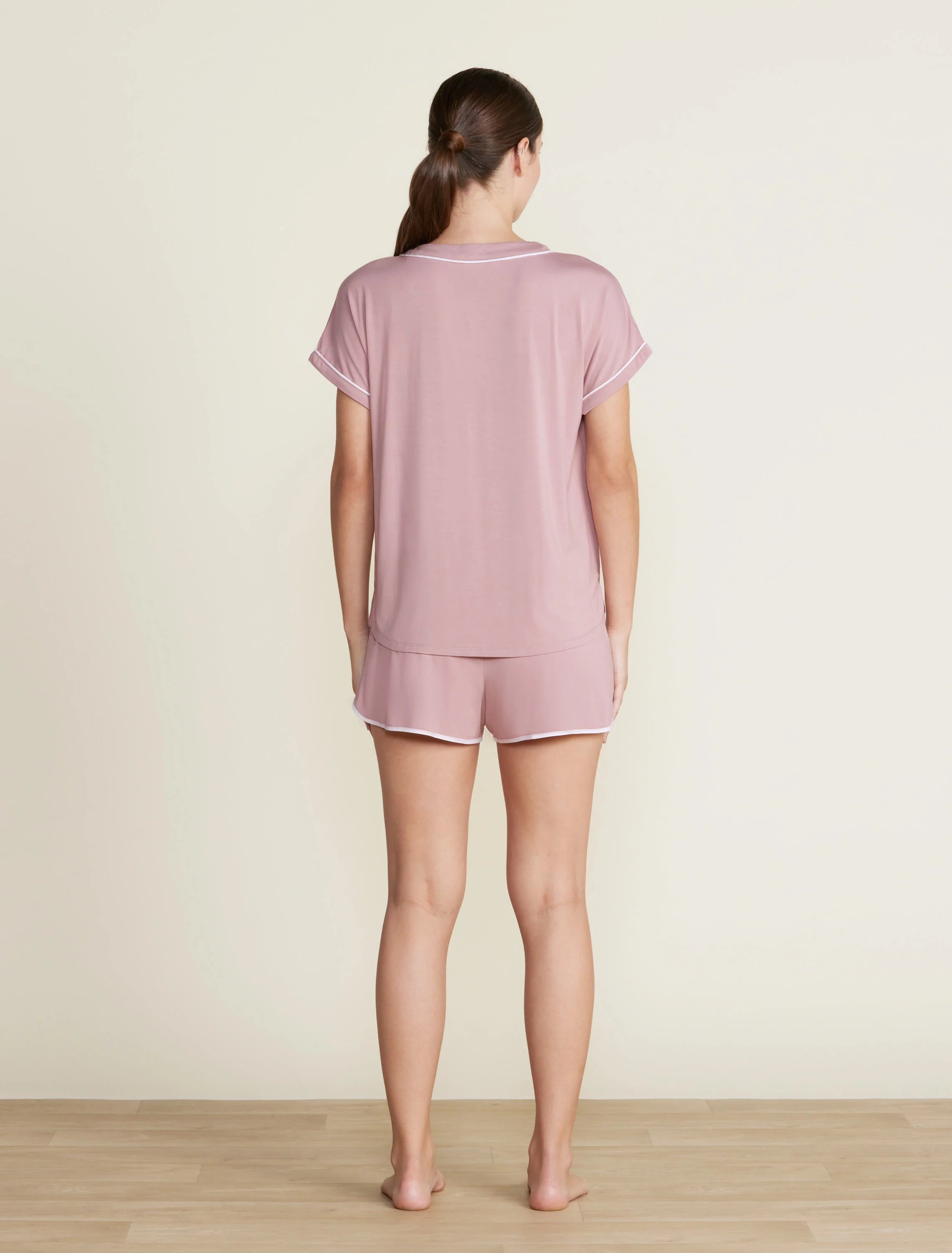 From our Barefoot Dreams Malibu Collection®, stay comfortable and stylish while lounging in our Soft Jersey Piped Lounge Set. Featuring a button-down dolman style tee with contrast piping and a patch pocket, and elasticated pull-on shorts with contrast binding at the hemline. Pairs beautifully with the Malibu Collection® Soft Jersey Piped Robe. Models are between 5'9" and 5'11" and wearing a size Small. Imported.