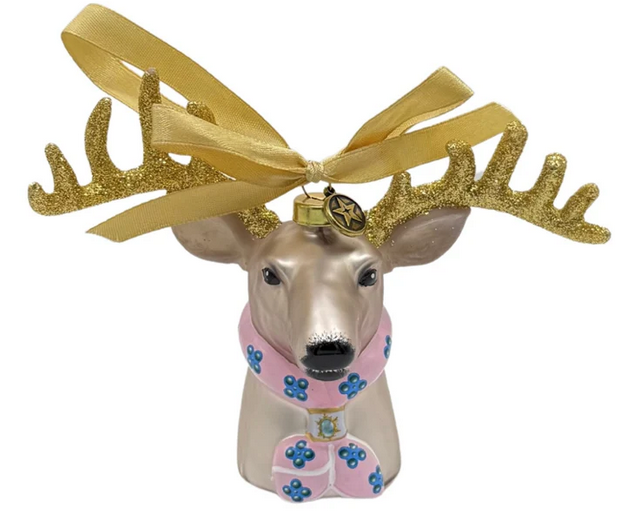 Add a bold and stylish touch of Texas wilderness to your holiday décor with this Trophy Whitetail Deer Hand-Blown Glass Ornament, featuring a charming twist—a pink and turquoise bandana tied proudly around its neck. This beautifully crafted ornament captures the rugged elegance of the iconic Texas whitetail deer with exquisite detail, from its majestic antlers to its glossy finish.