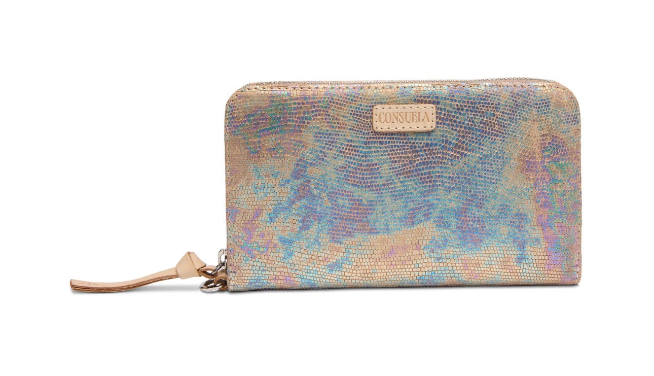 Function and versatility in the palm of your hand. Our Essential Wallet is a streamlined, large-capacity wallet with plenty of room for cards, cash, and receipts — plus a zippered center compartment for coins and keepsakes. We added a D-ring so you can easily clip it to any Consuela wristlet strap or anchor onto an inside lanyard for added security.