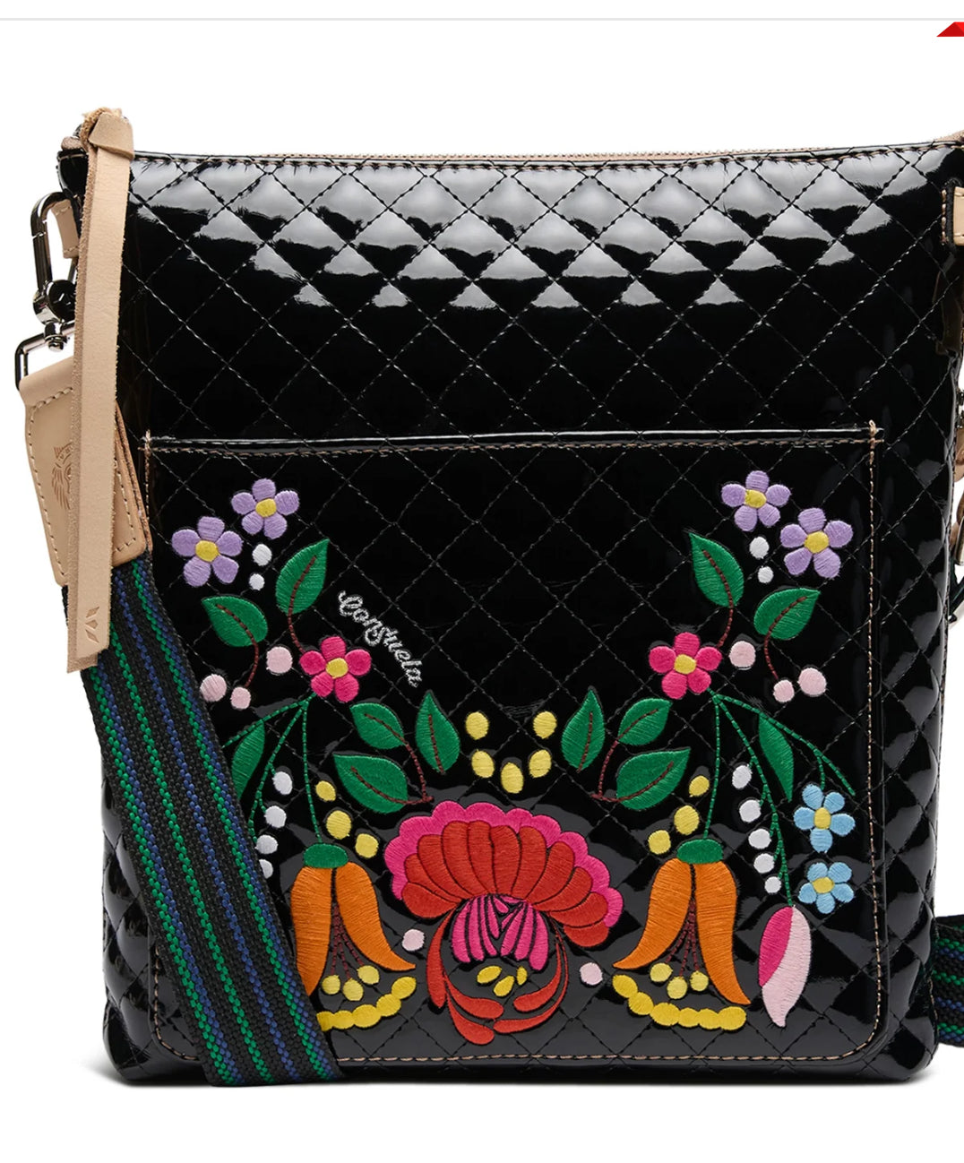- Iconic floral embroidery on black quilted exterior