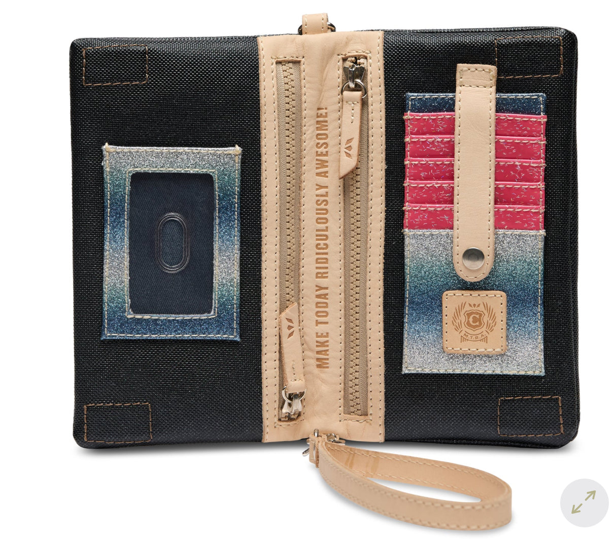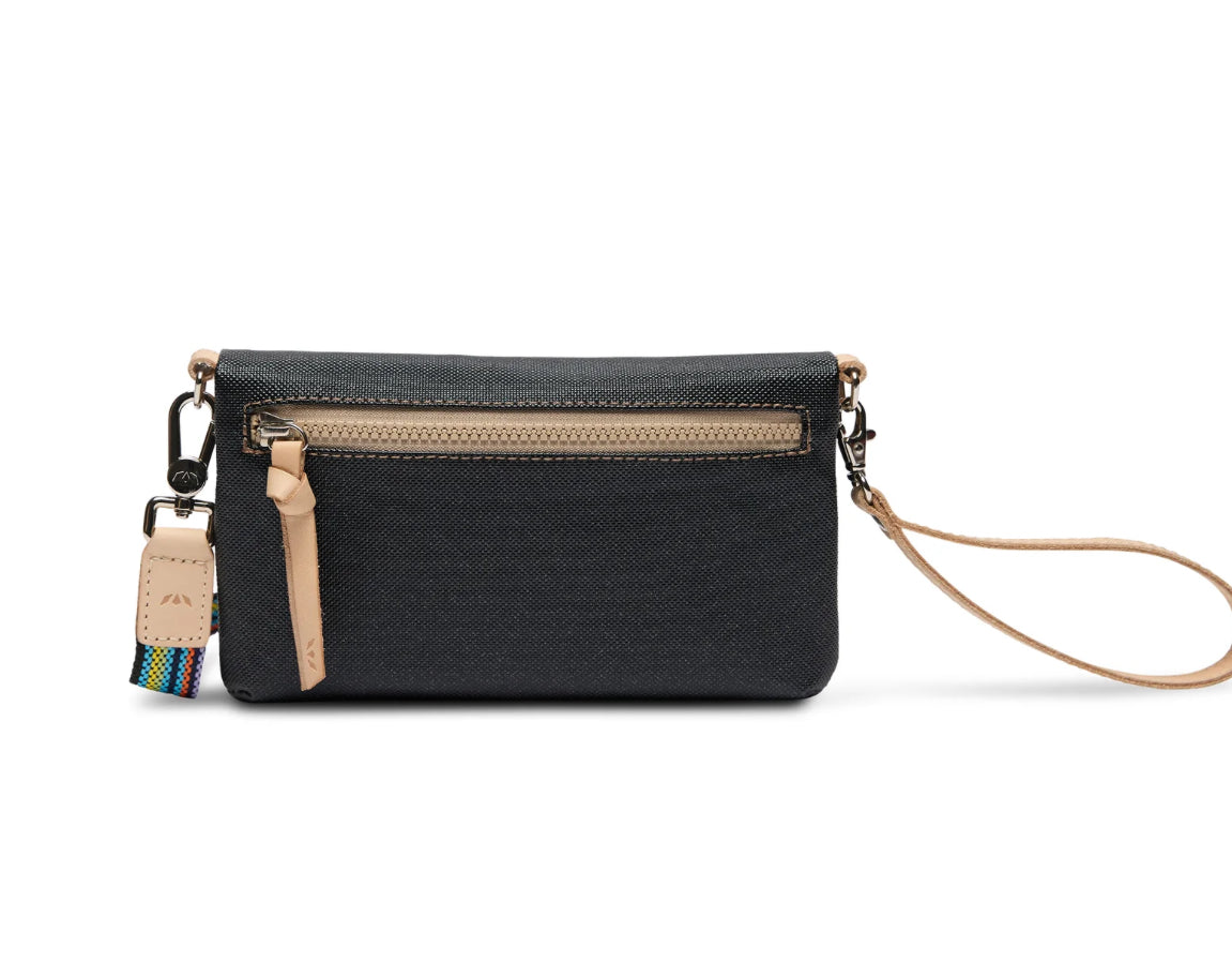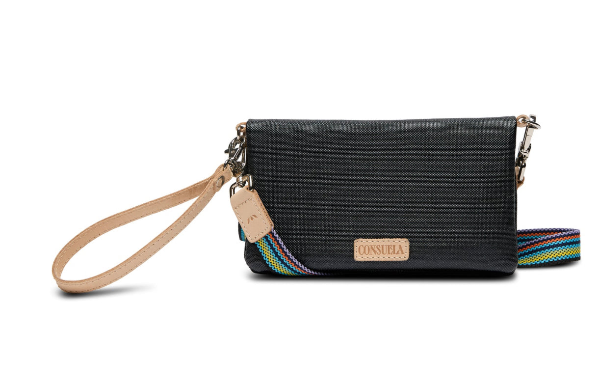 - Included detachable wristlet strap and adjustable woven crossbody strap