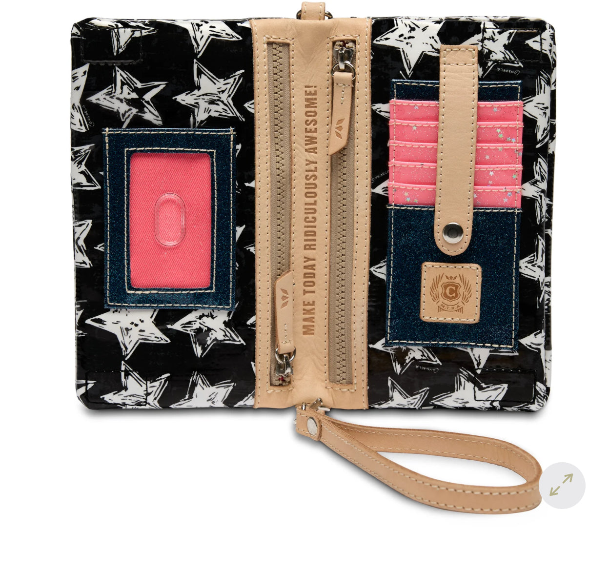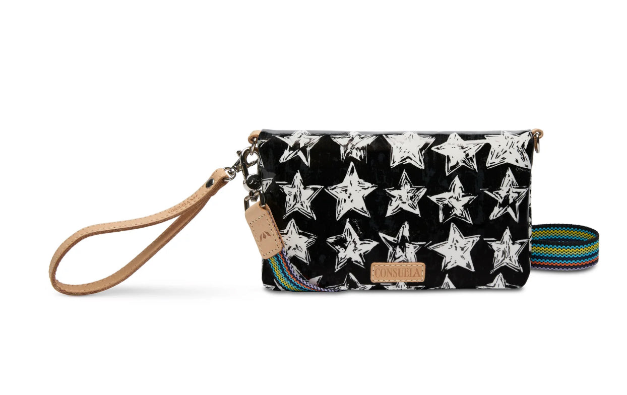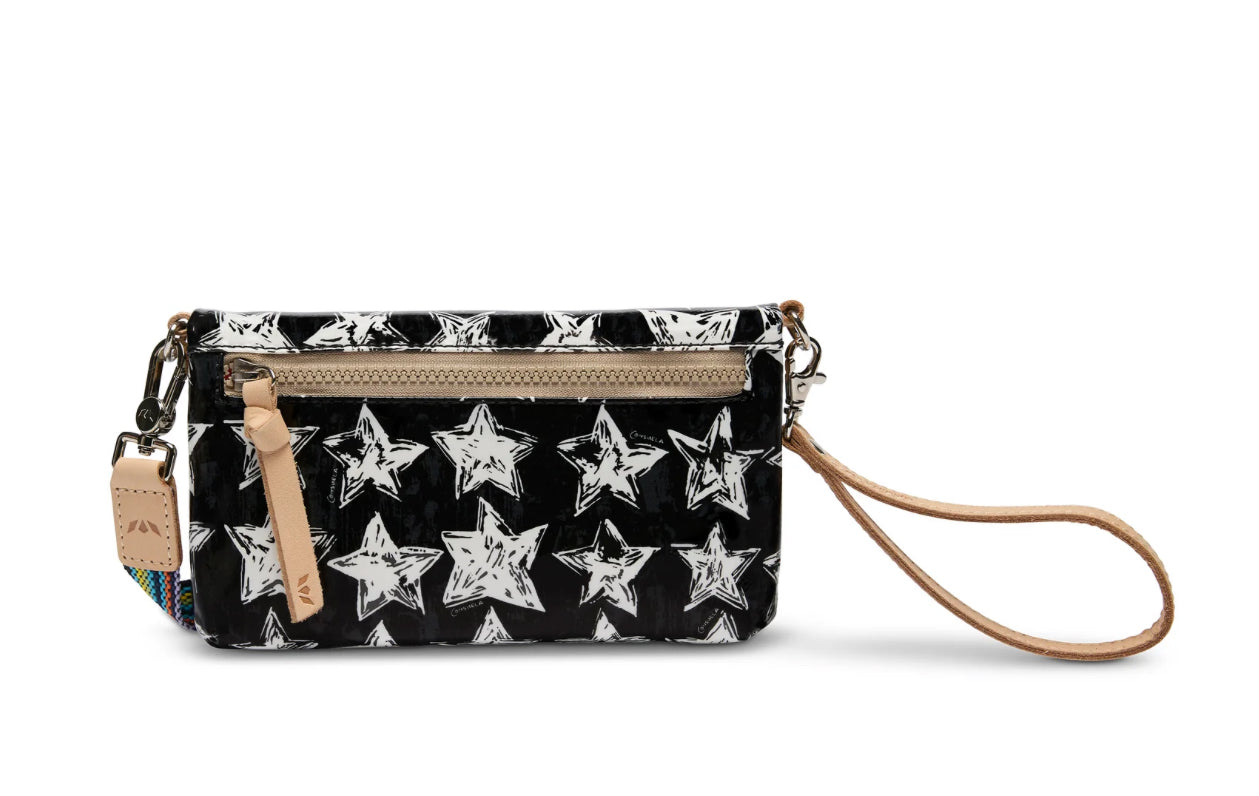 - Included detachable wristlet strap and adjustable woven crossbody strap