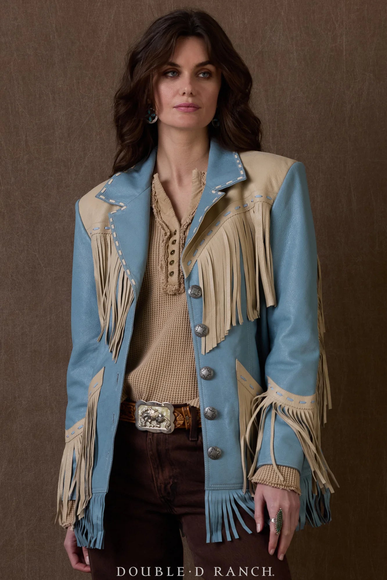 We are SO drawn to this dreamy jacket! The supple sheep suede is constructed to make the most of the complementing contrasts of the two different colors. The relaxed-shoulder silhouette hits just below the hip and is heavily adorned with long, lovely fringe at the yoke, the pockets, the sleeves, and even the hem. It’s finished with contrast leather lacing and custom concho buttons. Talk about a timeless statement piece!