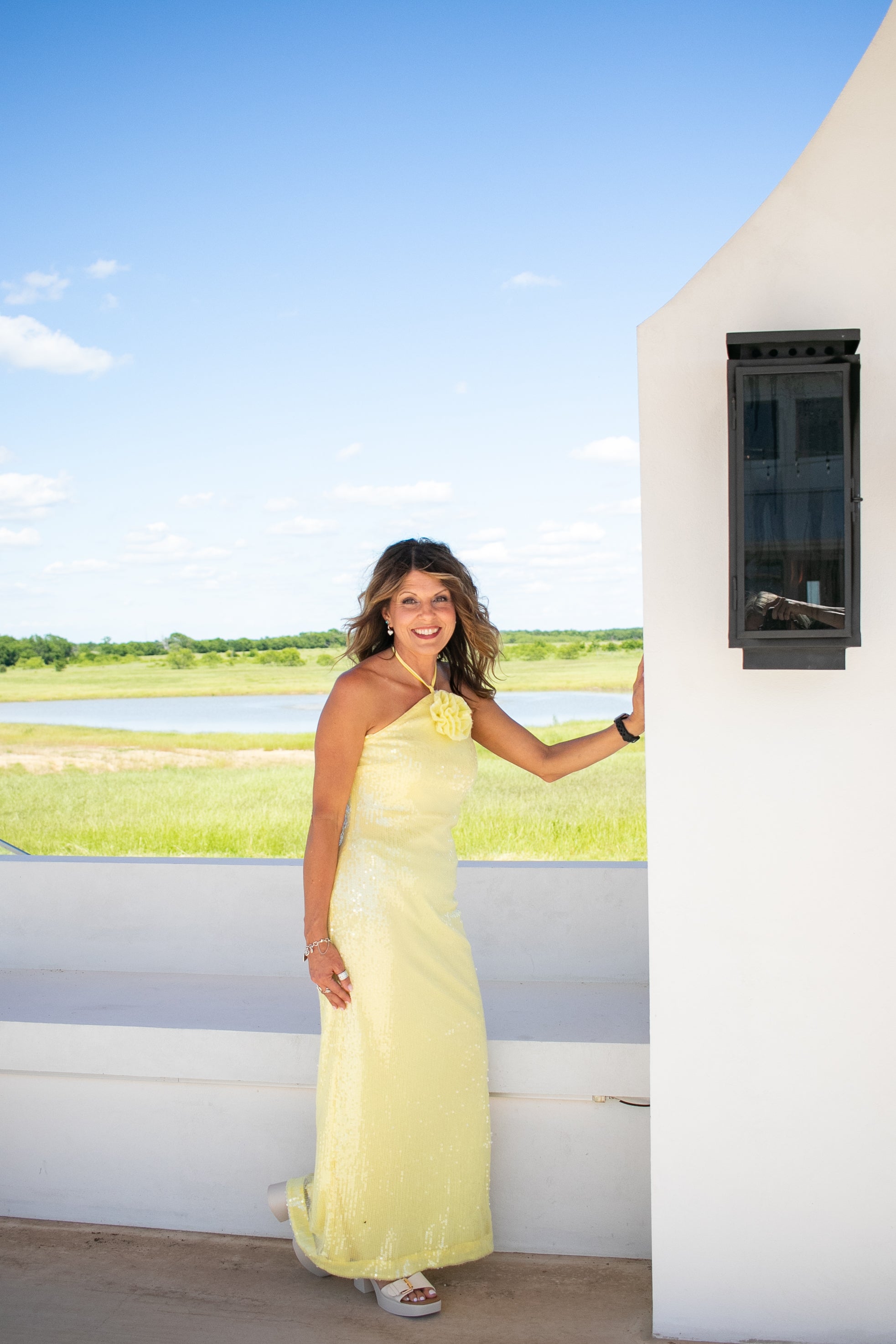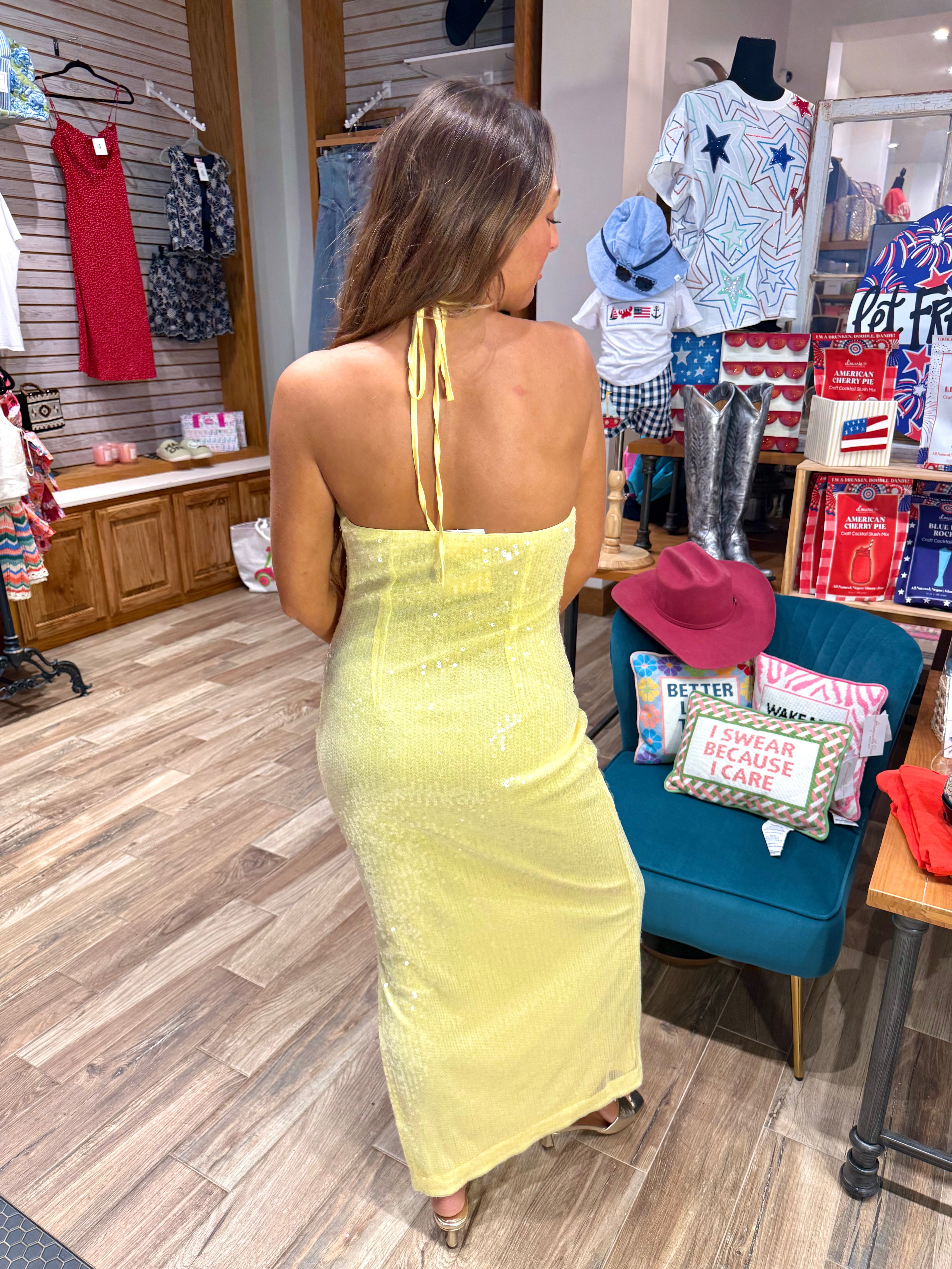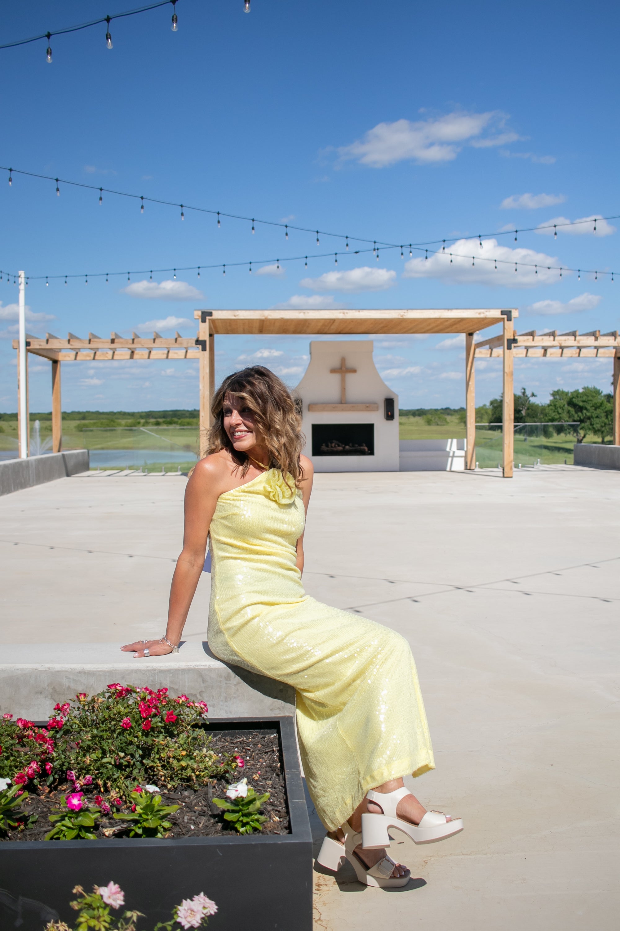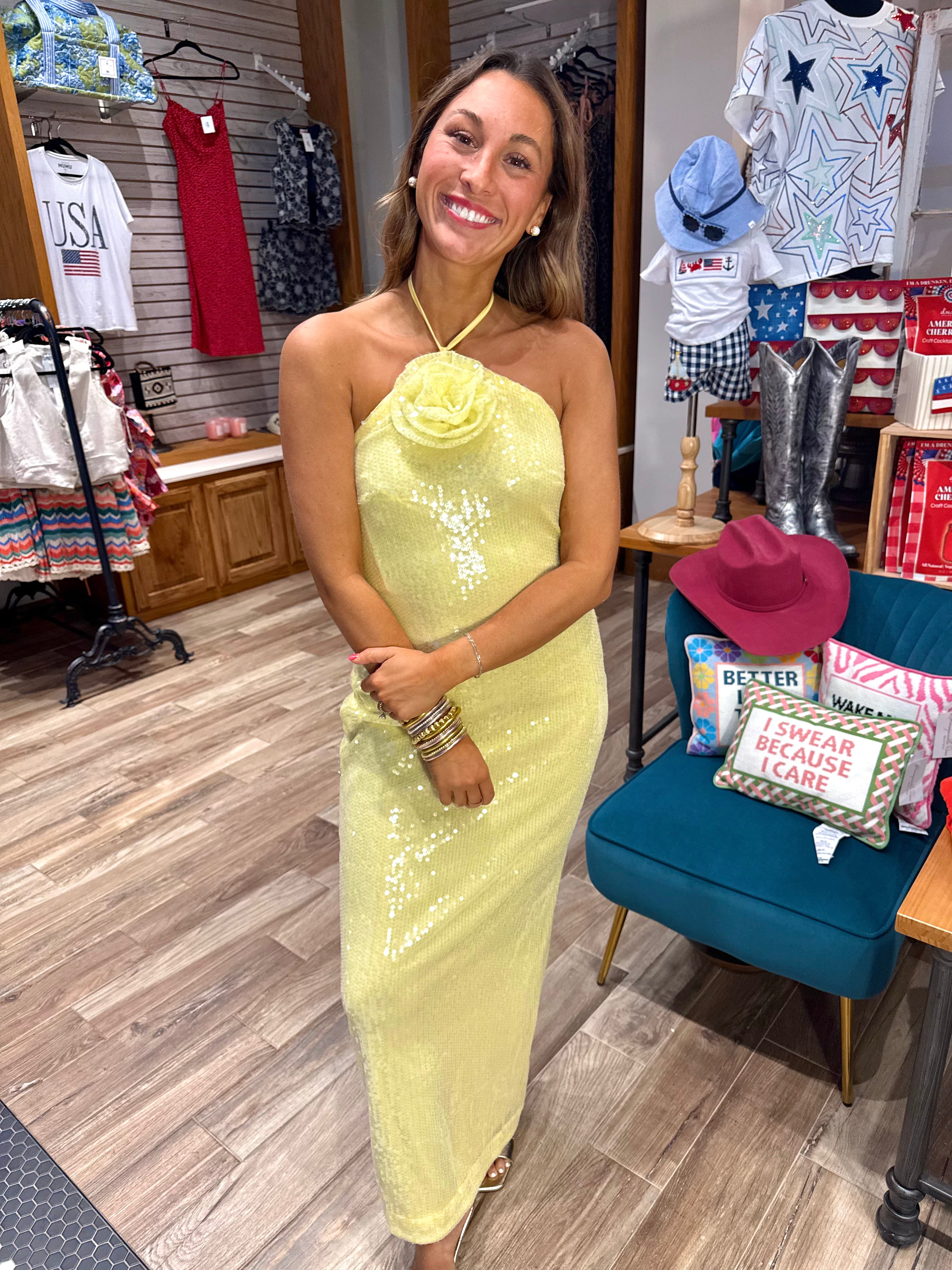 Full sequin maxi dress with a beautiful floral rosette fit for a fabulous soiree!