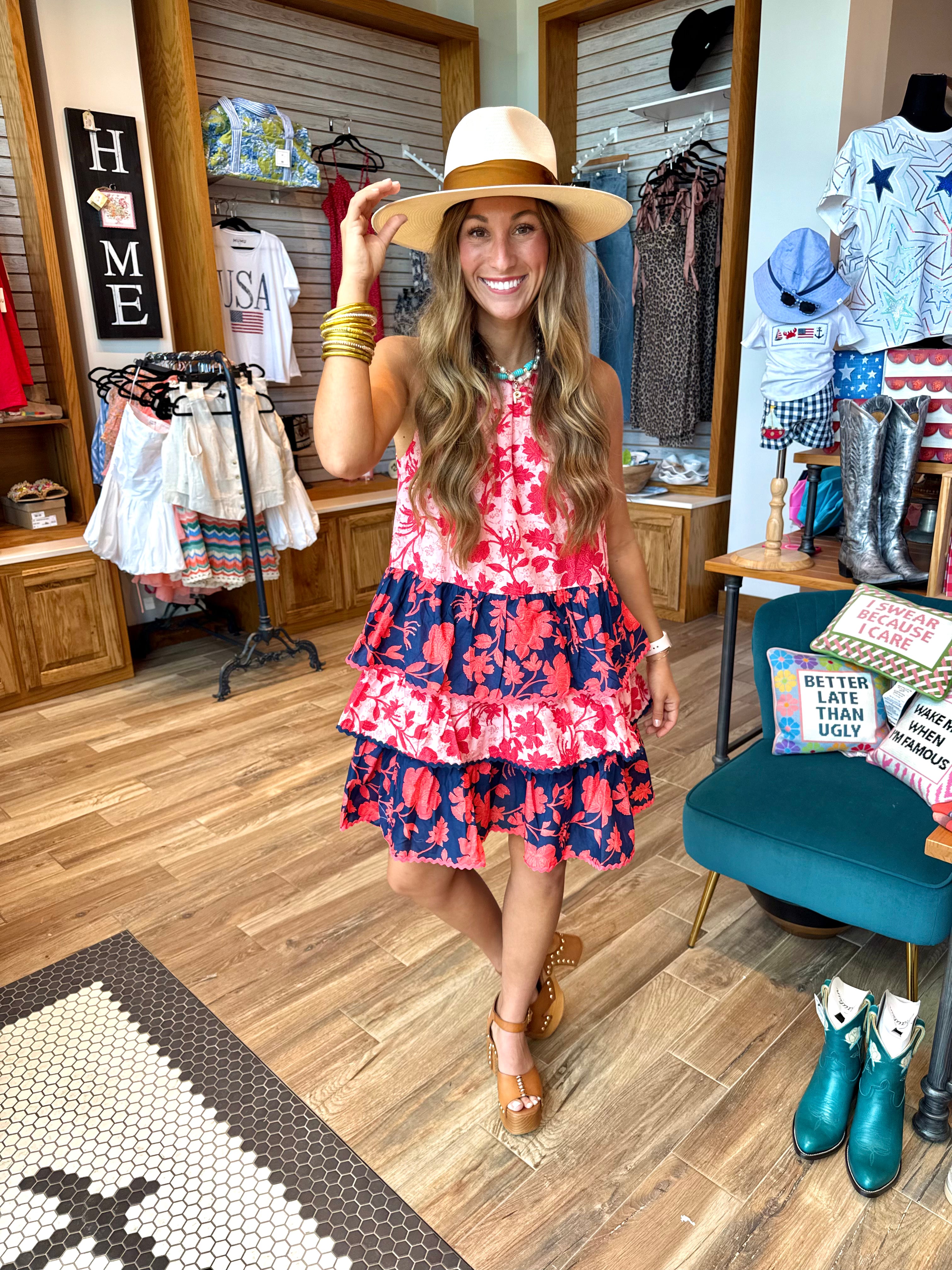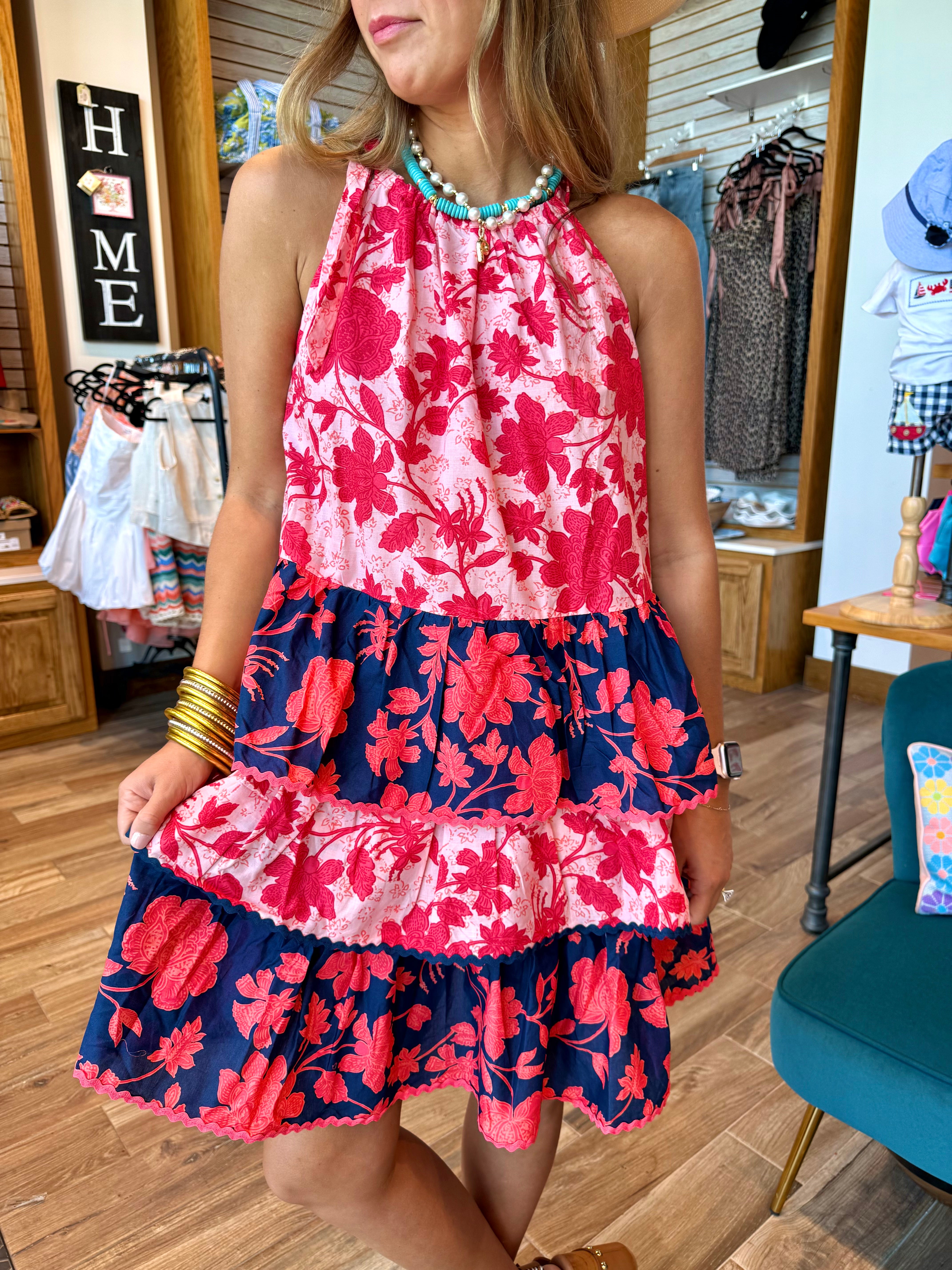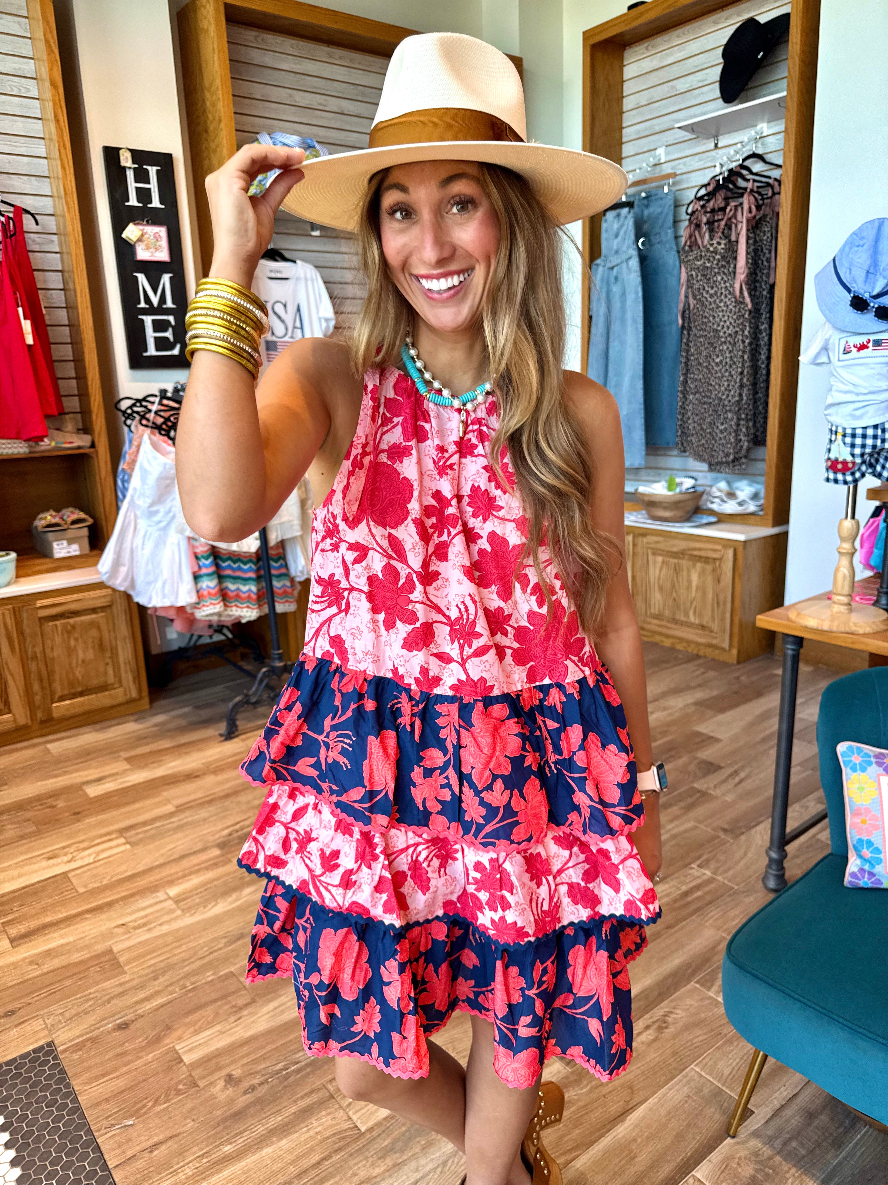 The Gianna is an adorable high neck dress with ruffle skirt detail in shades of pink, orange and navy! This dress is so fun to accessorize with fun shoes, hats and jewelry!