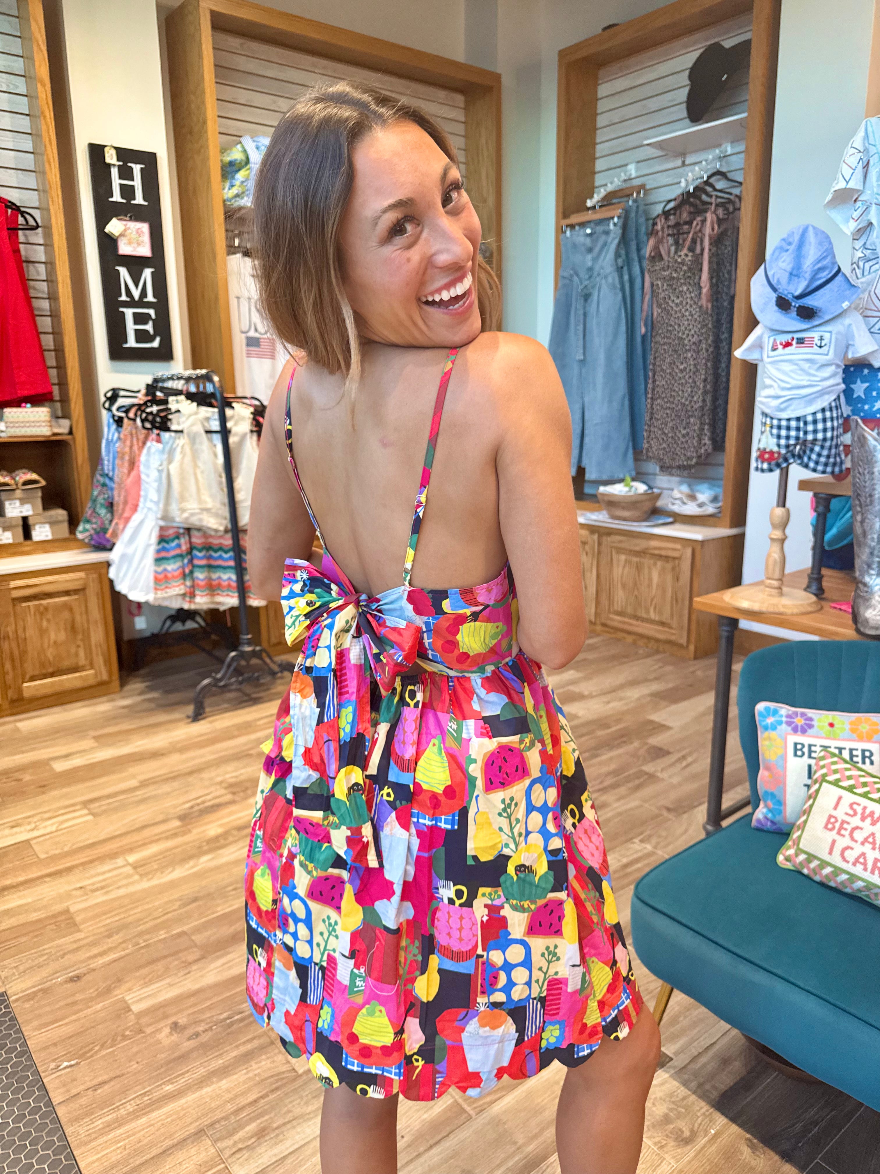 The Harlie Dress is a fun abstract print mini dress with thin spaghetti straps, scalloped neckline, pockets, and adjustable tie back