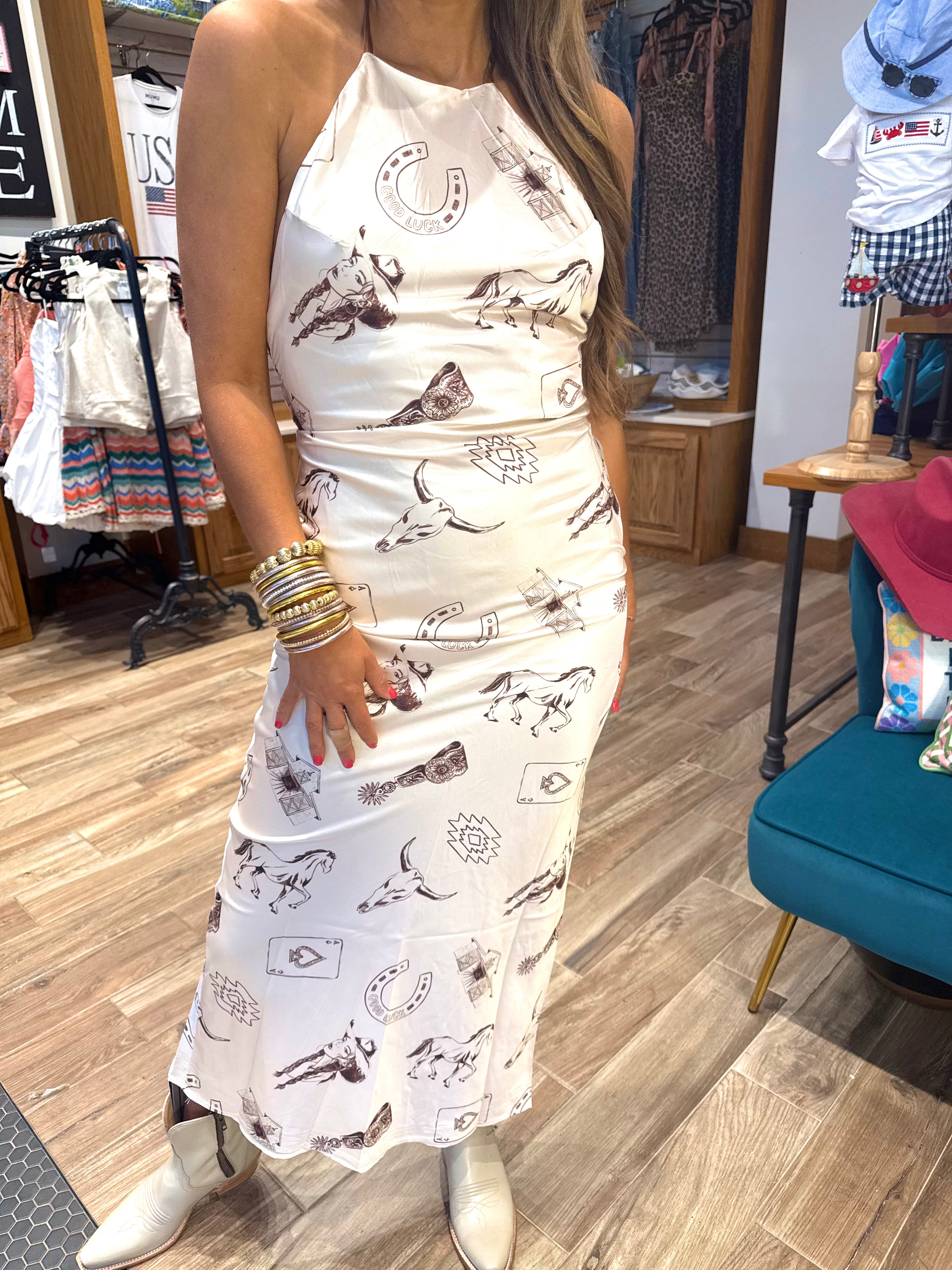 The Modern cowgirl satin slip dress is a rich cream color with chocolate brown western motifs!