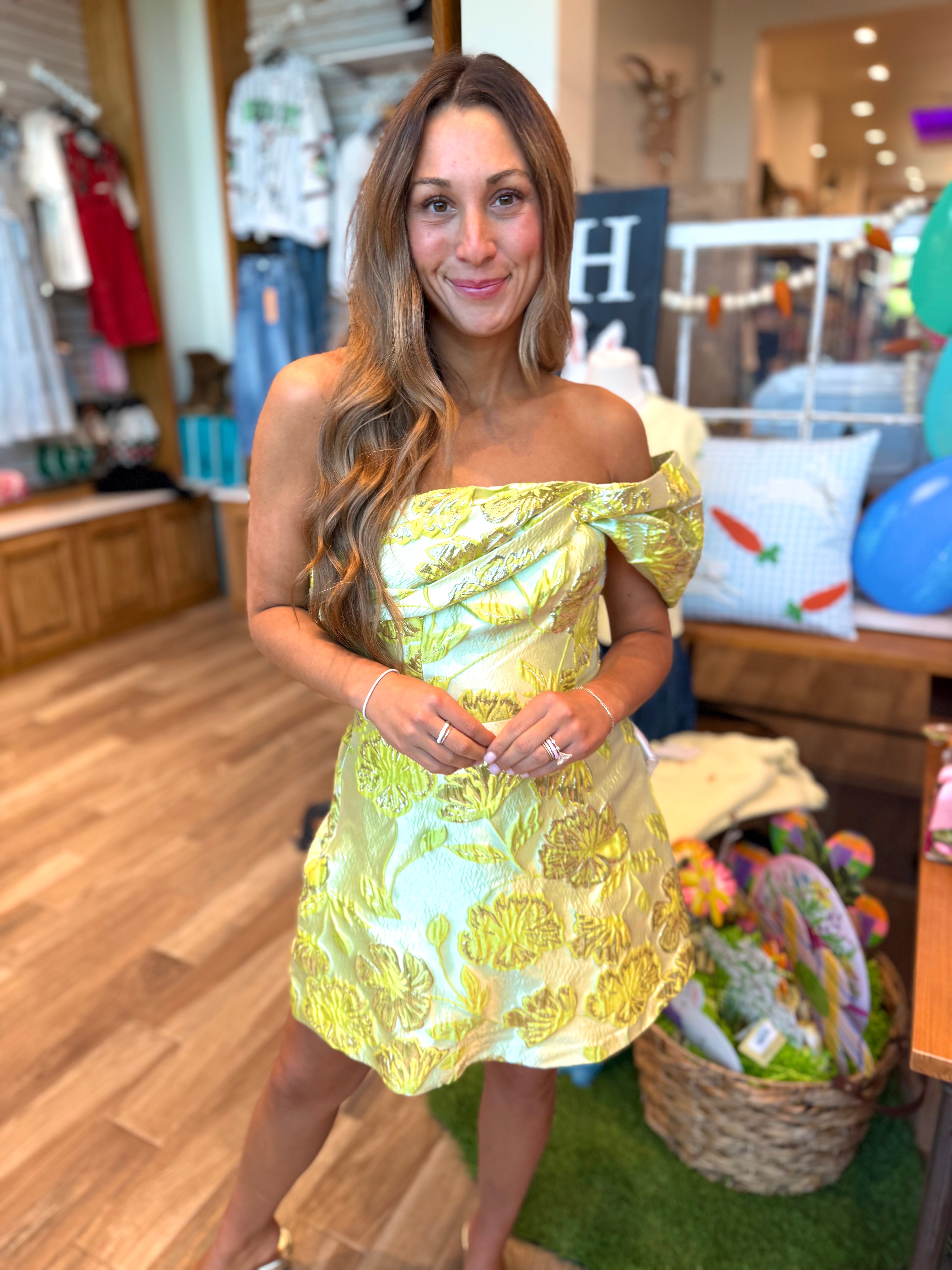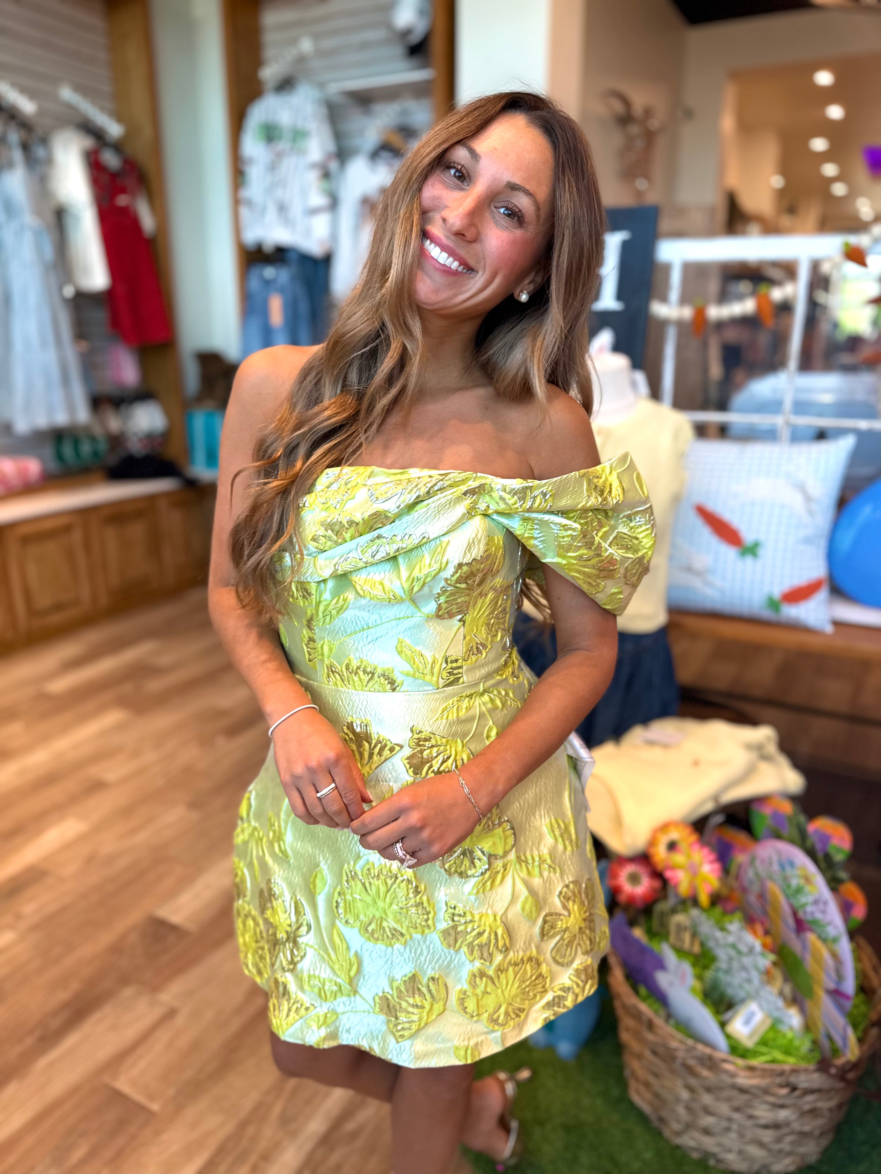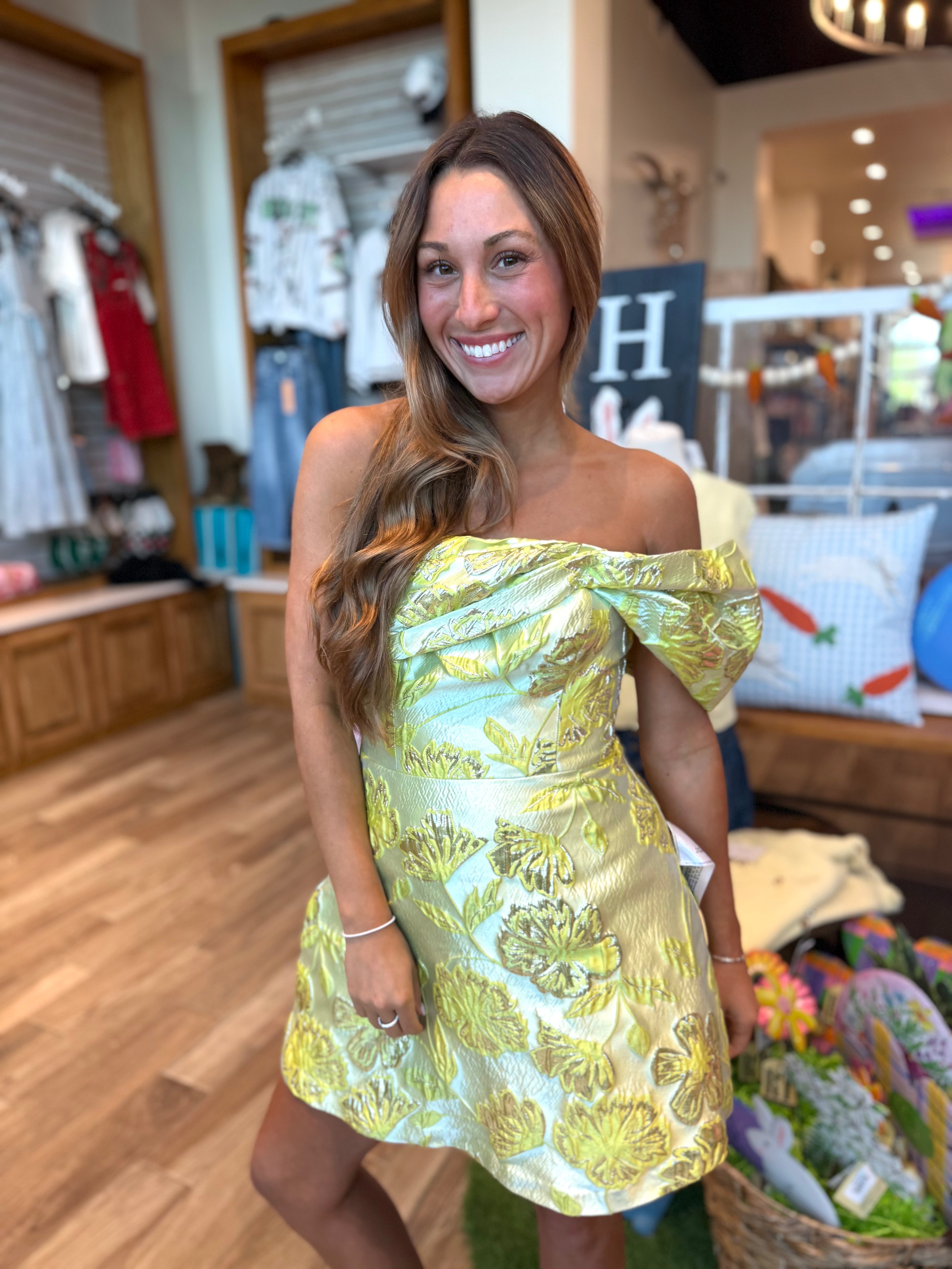 Meet the Olive, a strapless A-line mini dress featuring an off-the-shoulder sleeve design. Perfect for any Spring or Summer occasion!