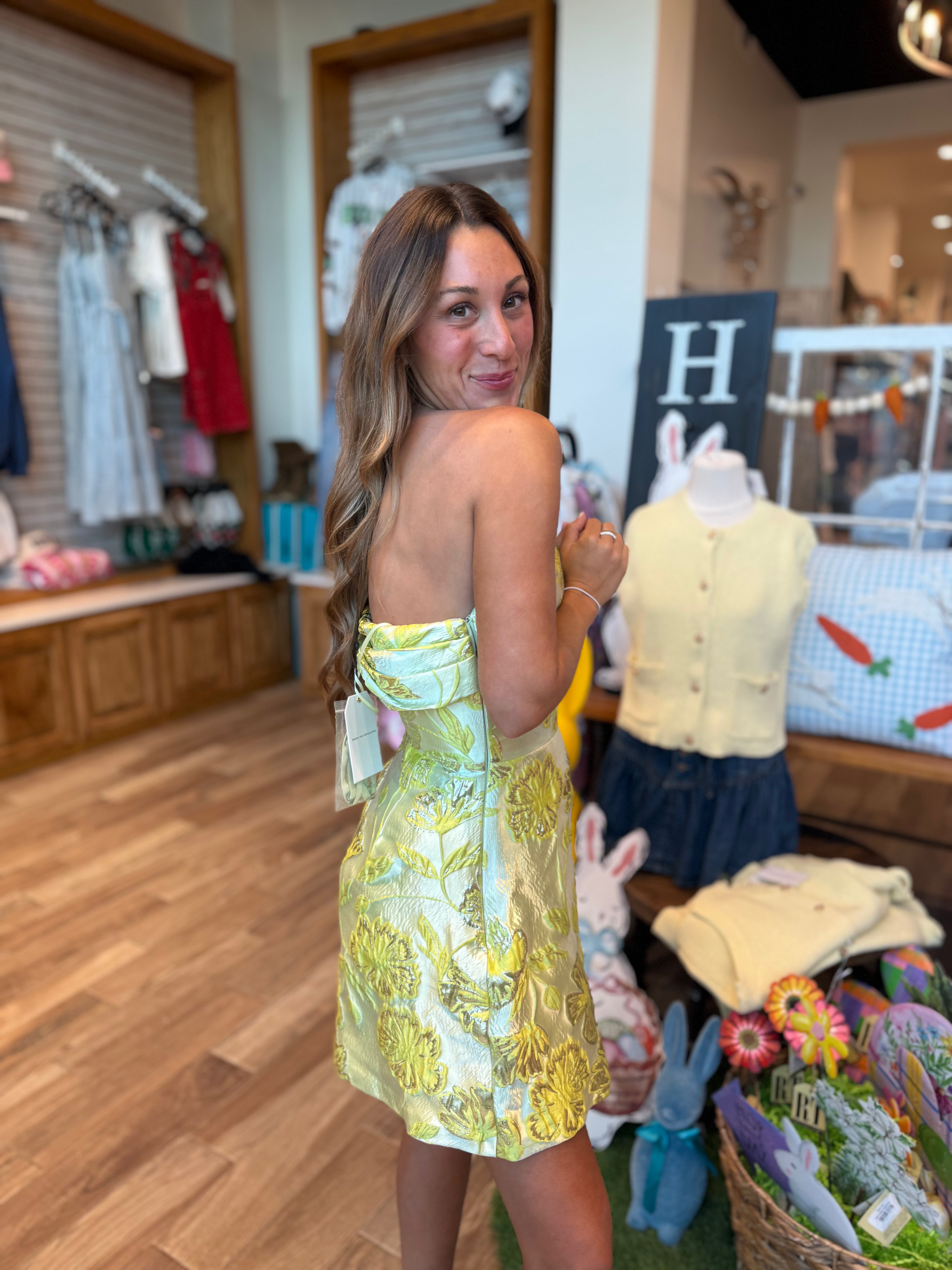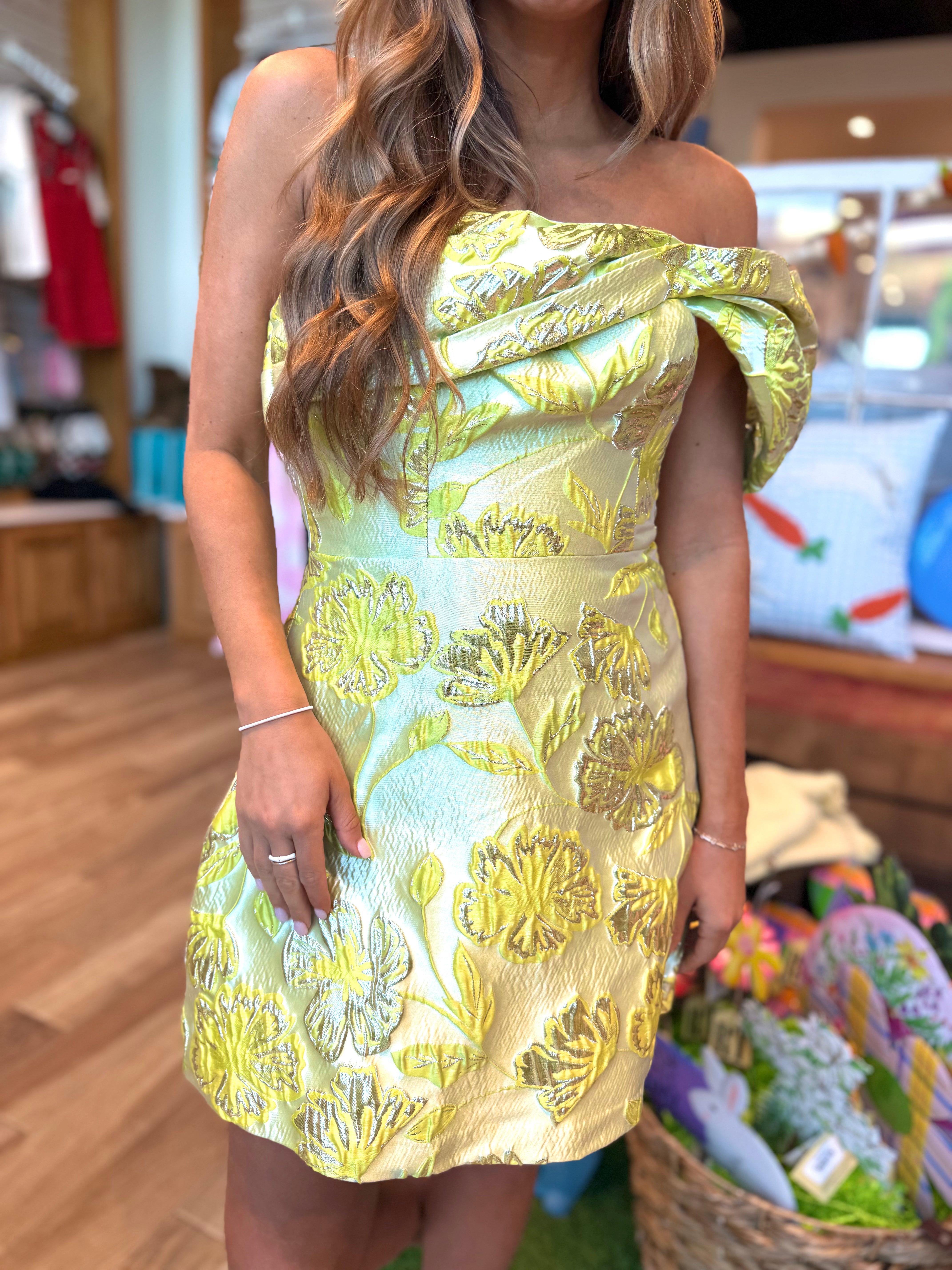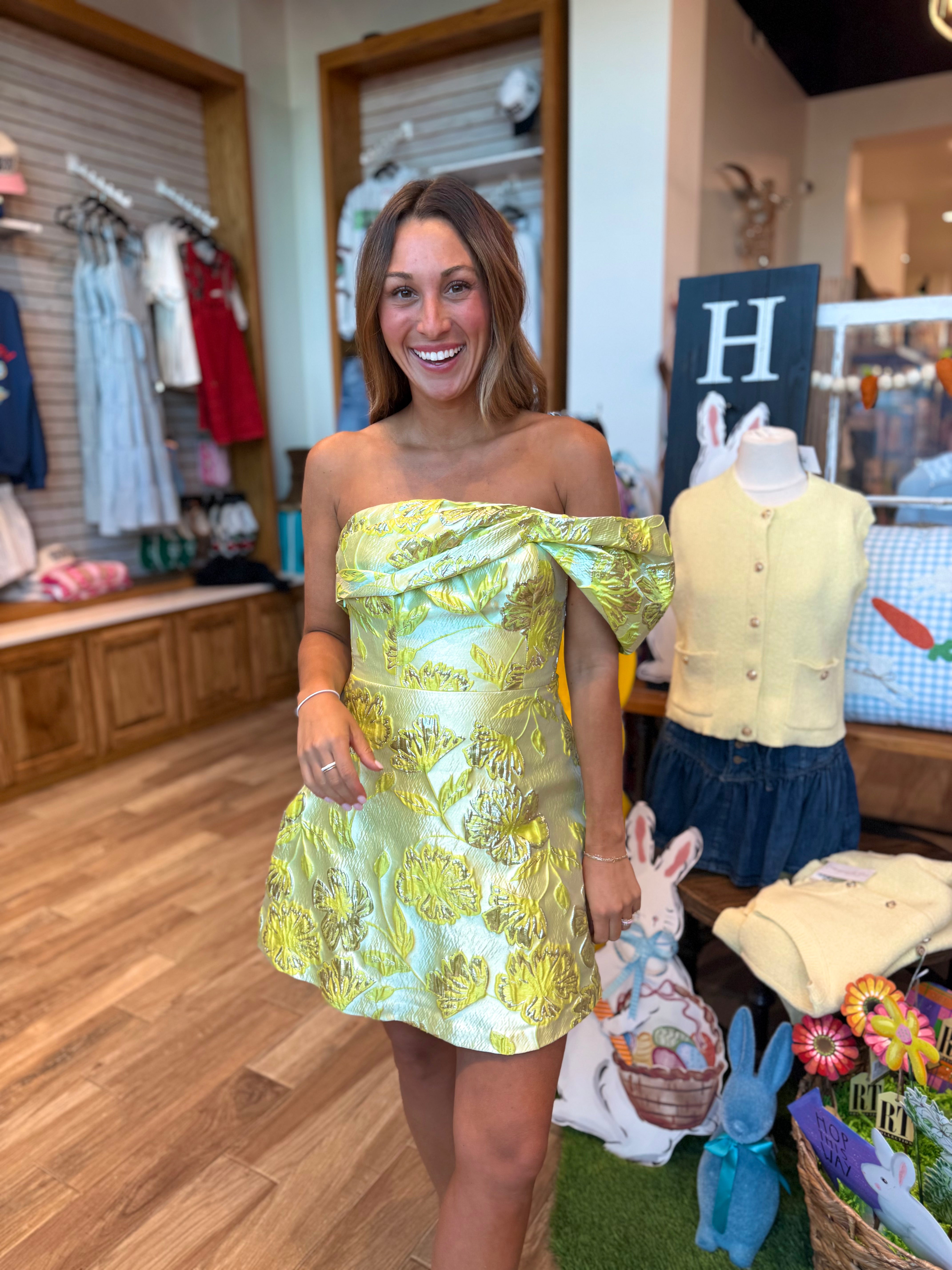 Meet the Olive, a strapless A-line mini dress featuring an off-the-shoulder sleeve design. Perfect for any Spring or Summer occasion!