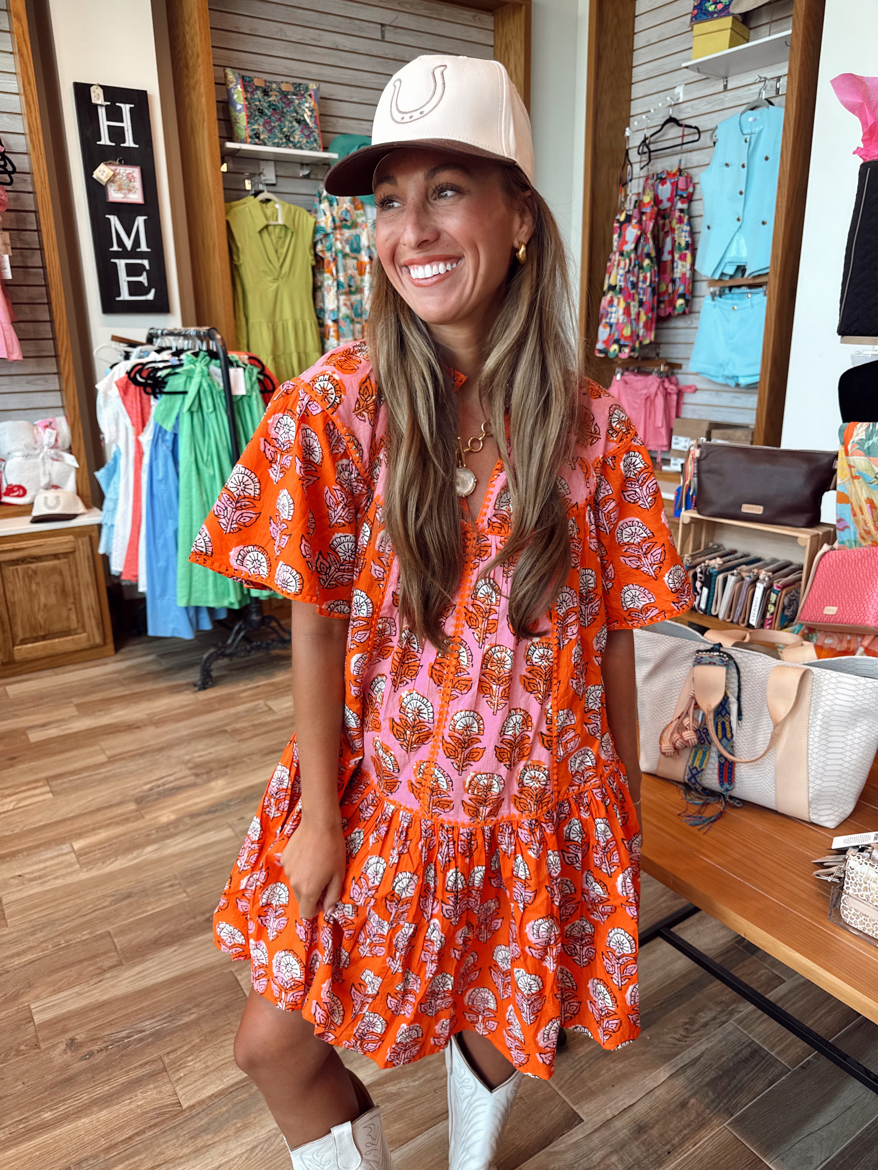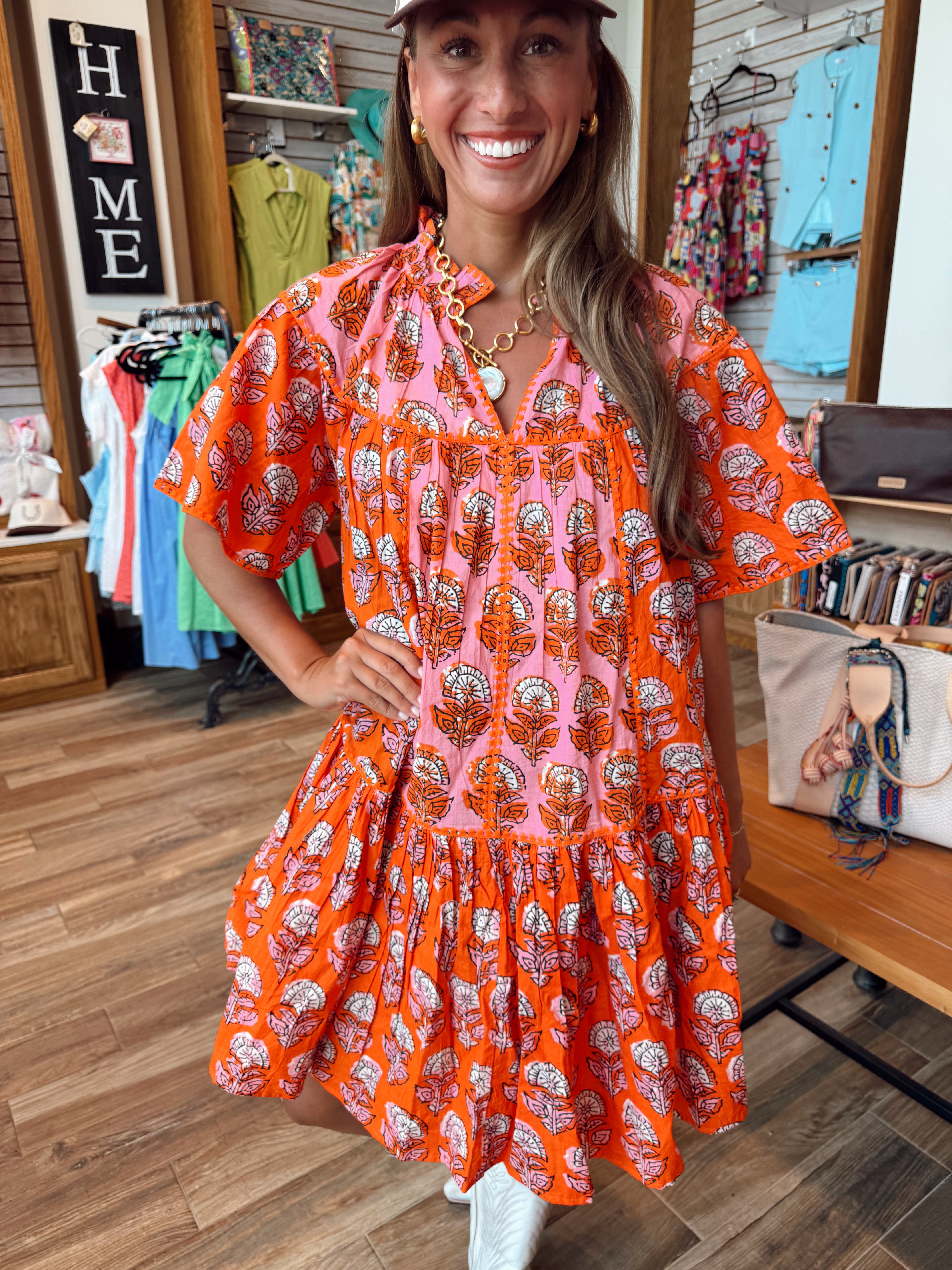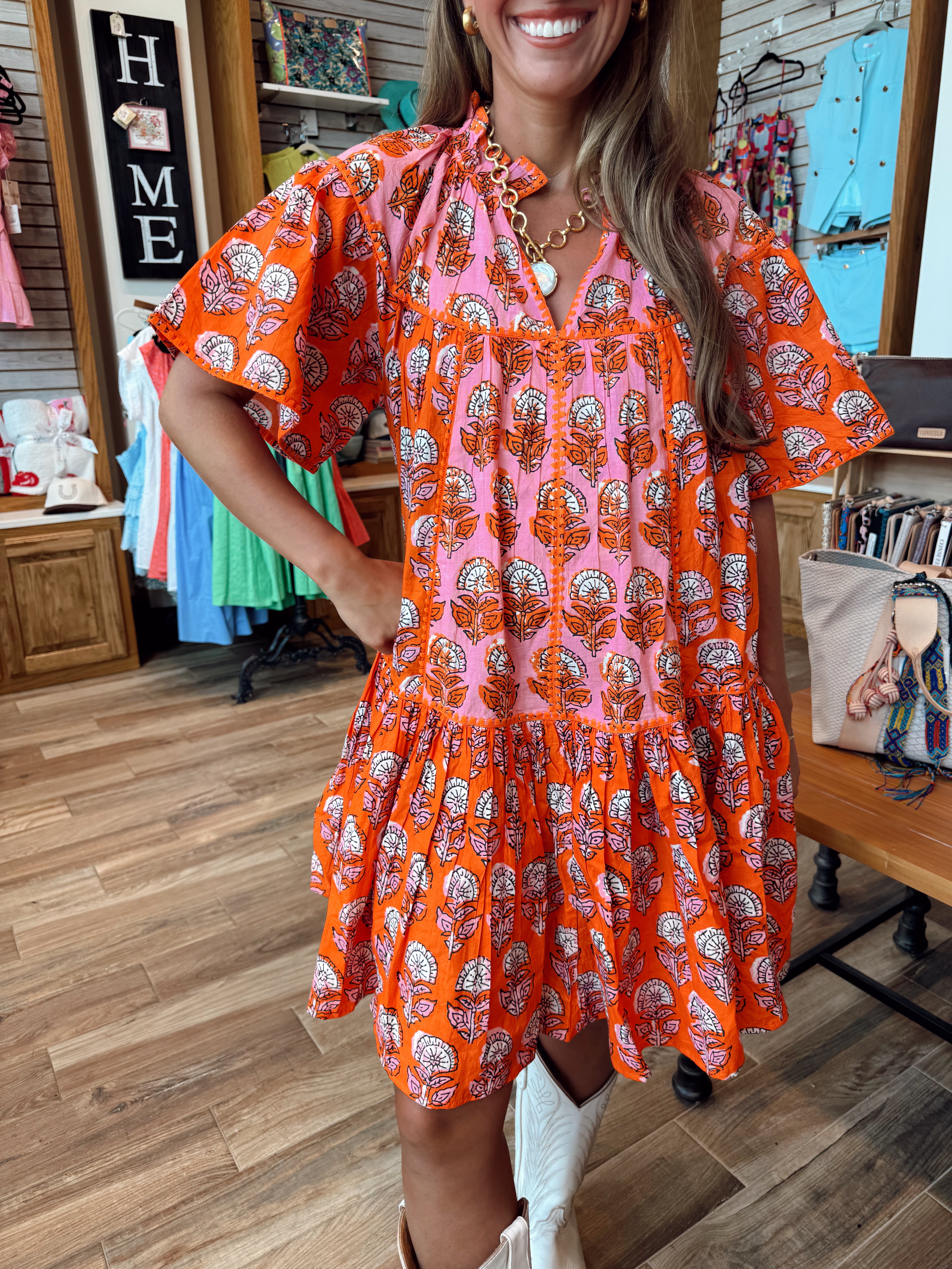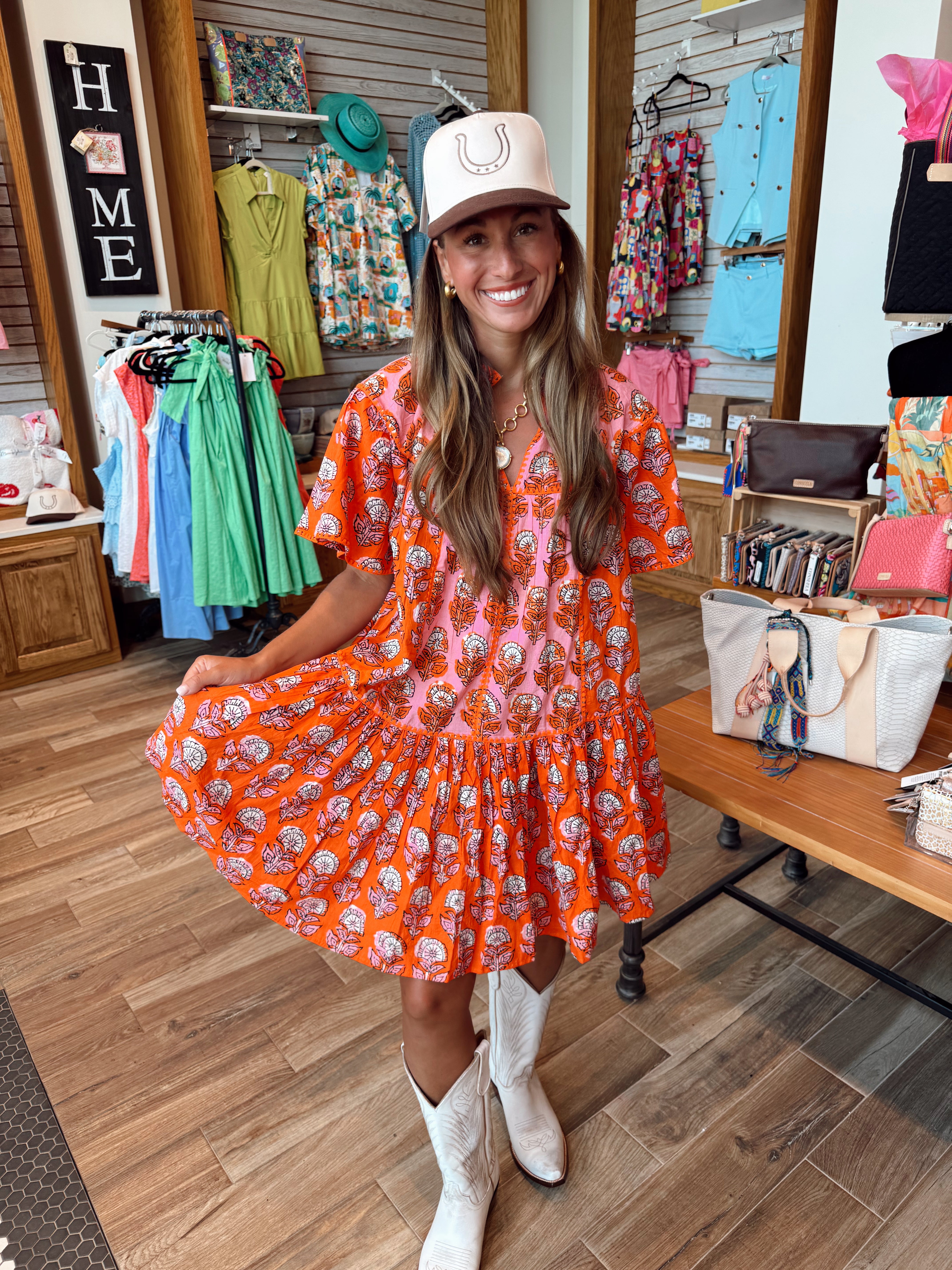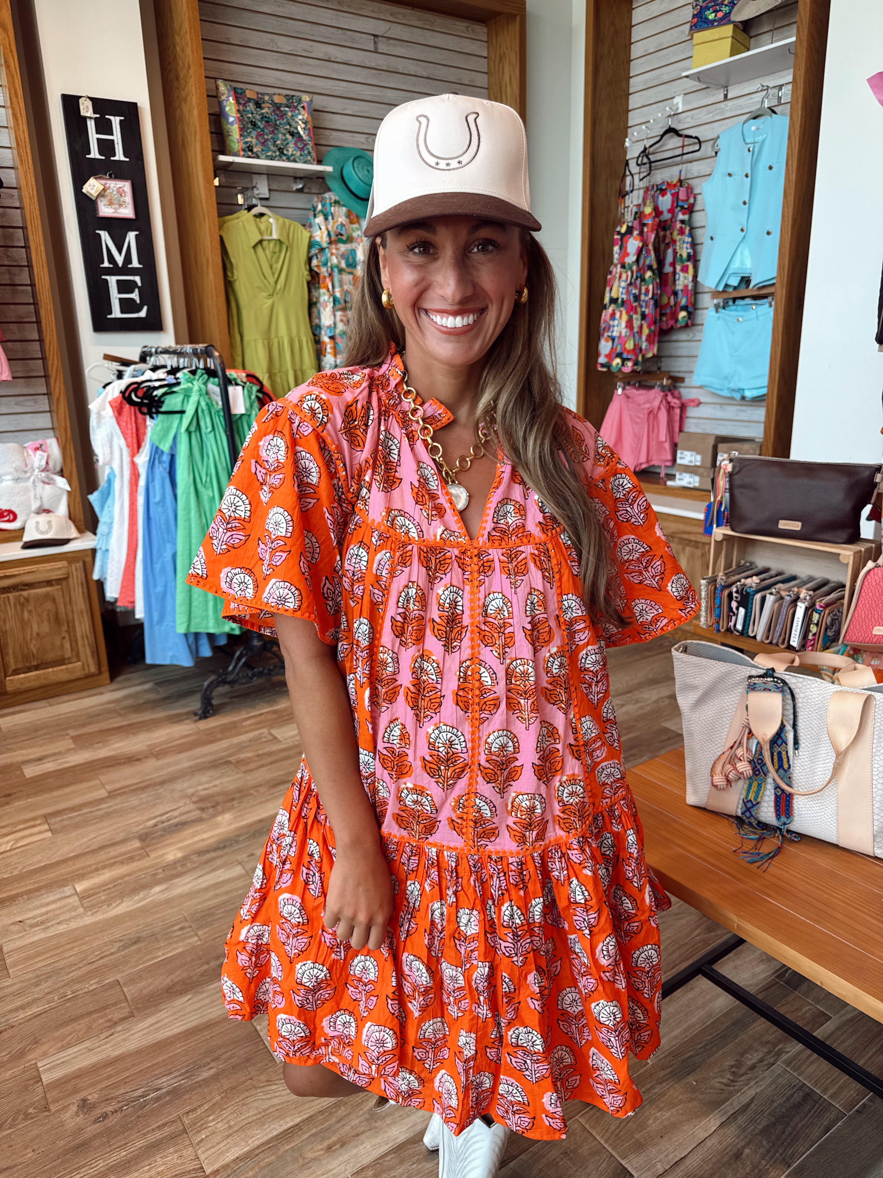 Bold, breezy, and full of charm! From Uncle Frank this vibrant orange and pink mini dress features a playful paisley print, flutter sleeves, and a flouncy ruffle hem. The relaxed fit and gathered neckline make it an easy pick!