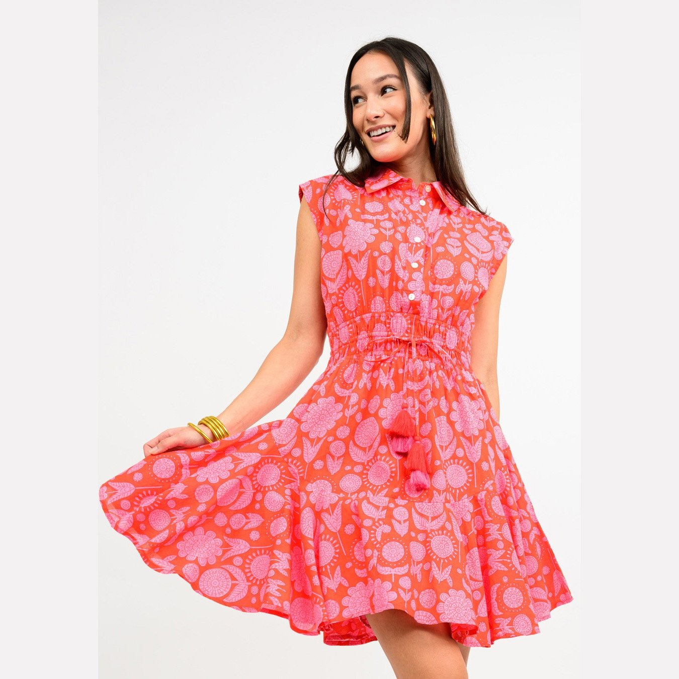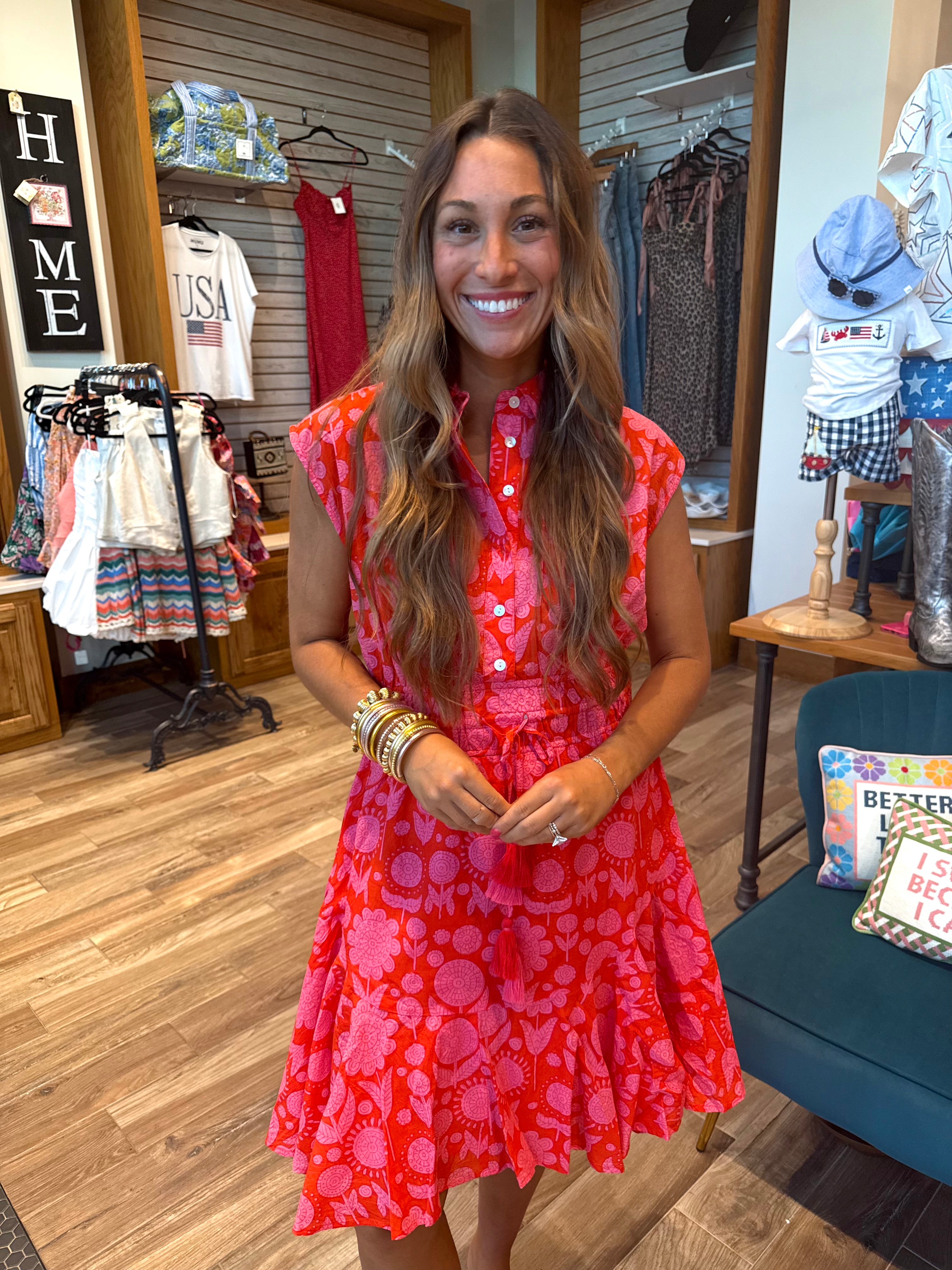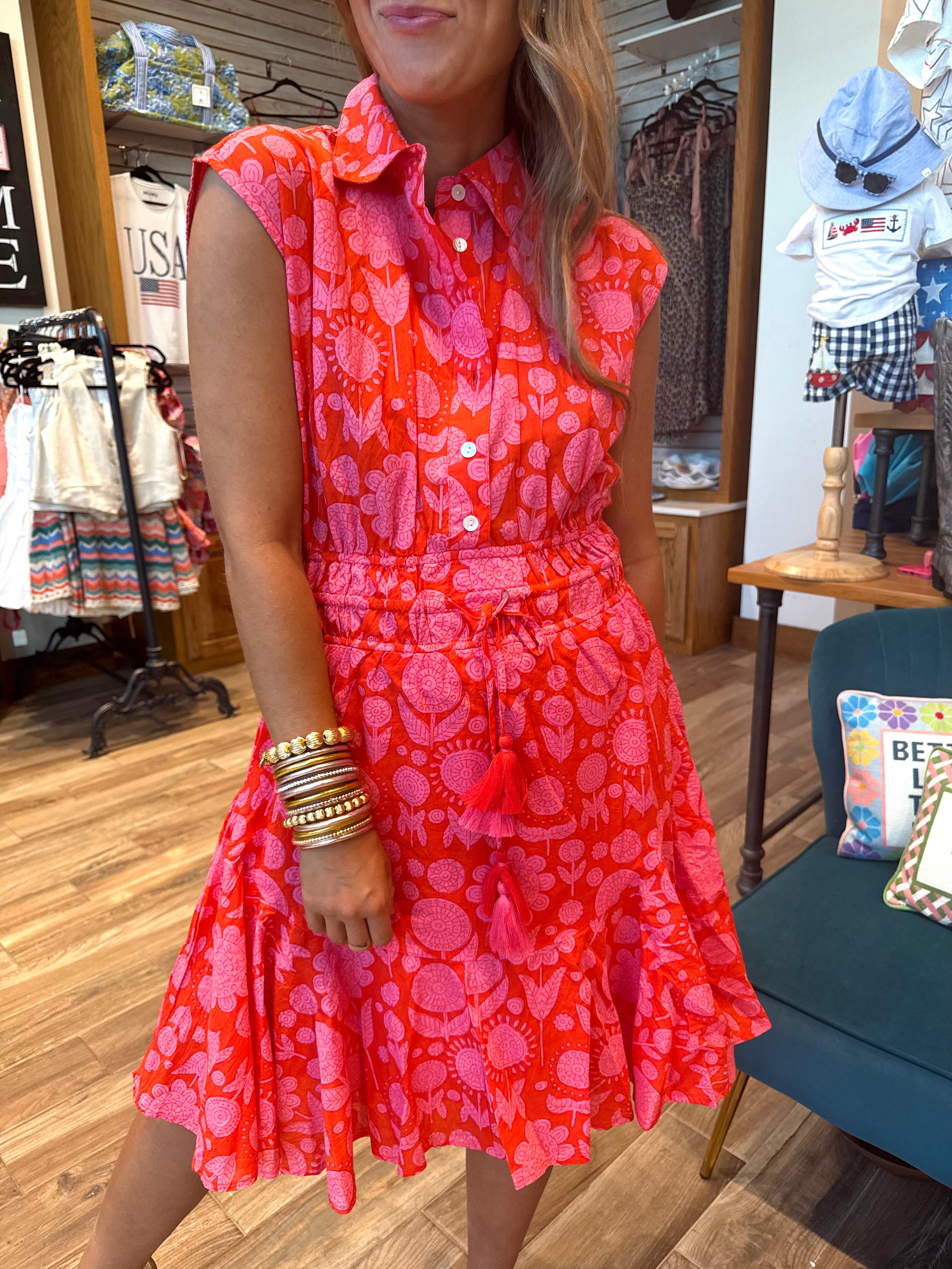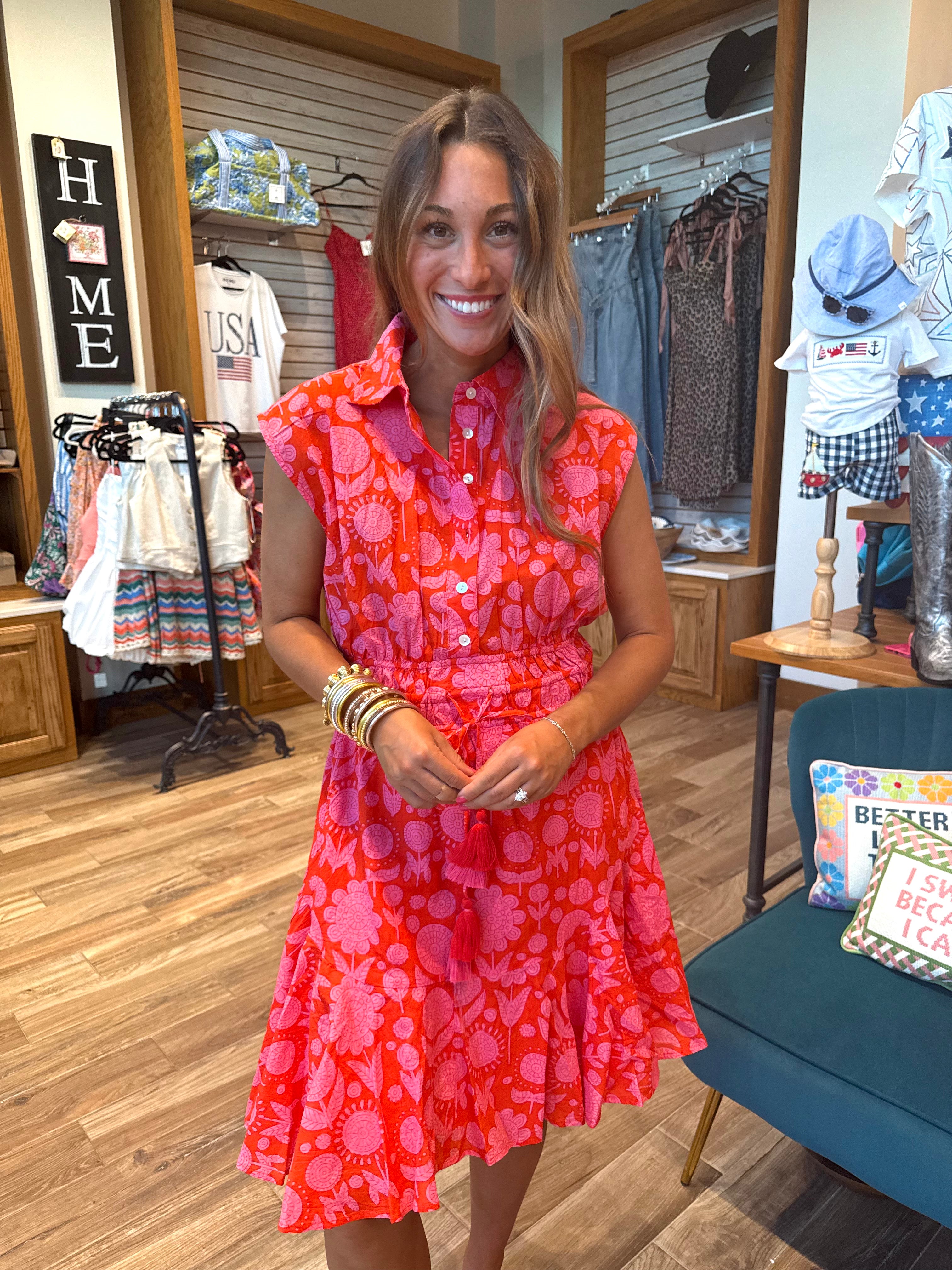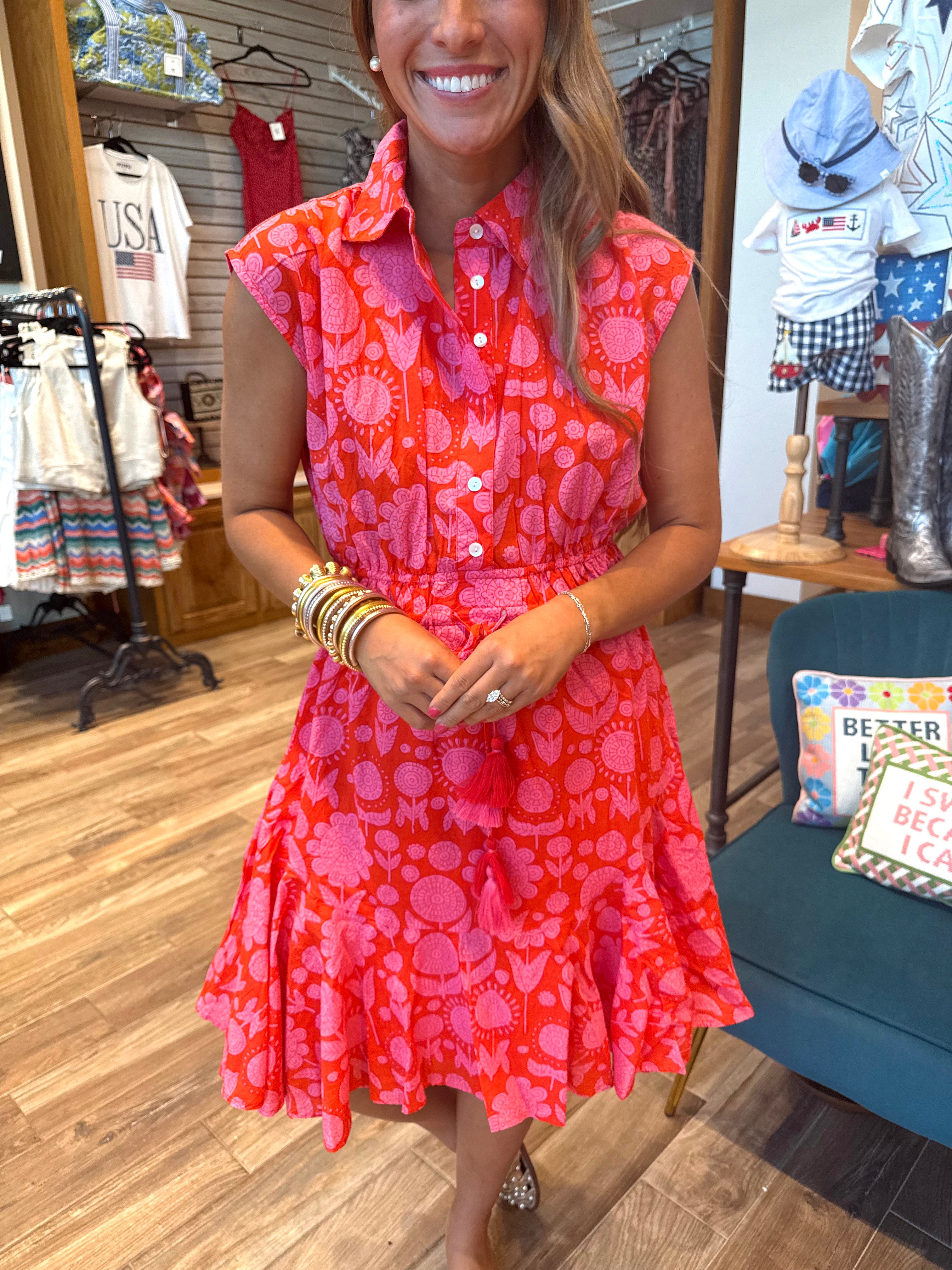 Stunning summer shirtdress by Uncle Frank, the swing and cinched shirtdress in red and pink color combination has flutter short cap sleeves, a high collared neckline with front buttons, tassel details and an above-the-knee length.