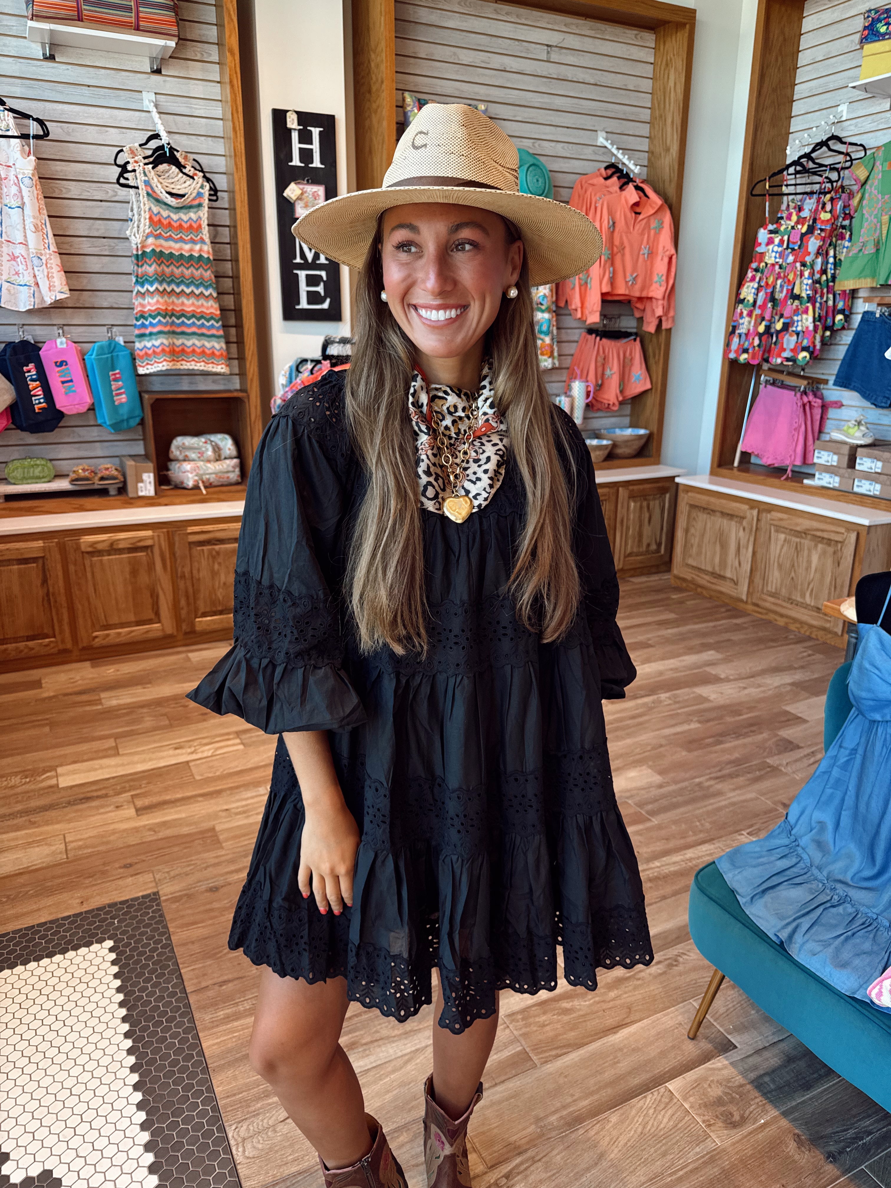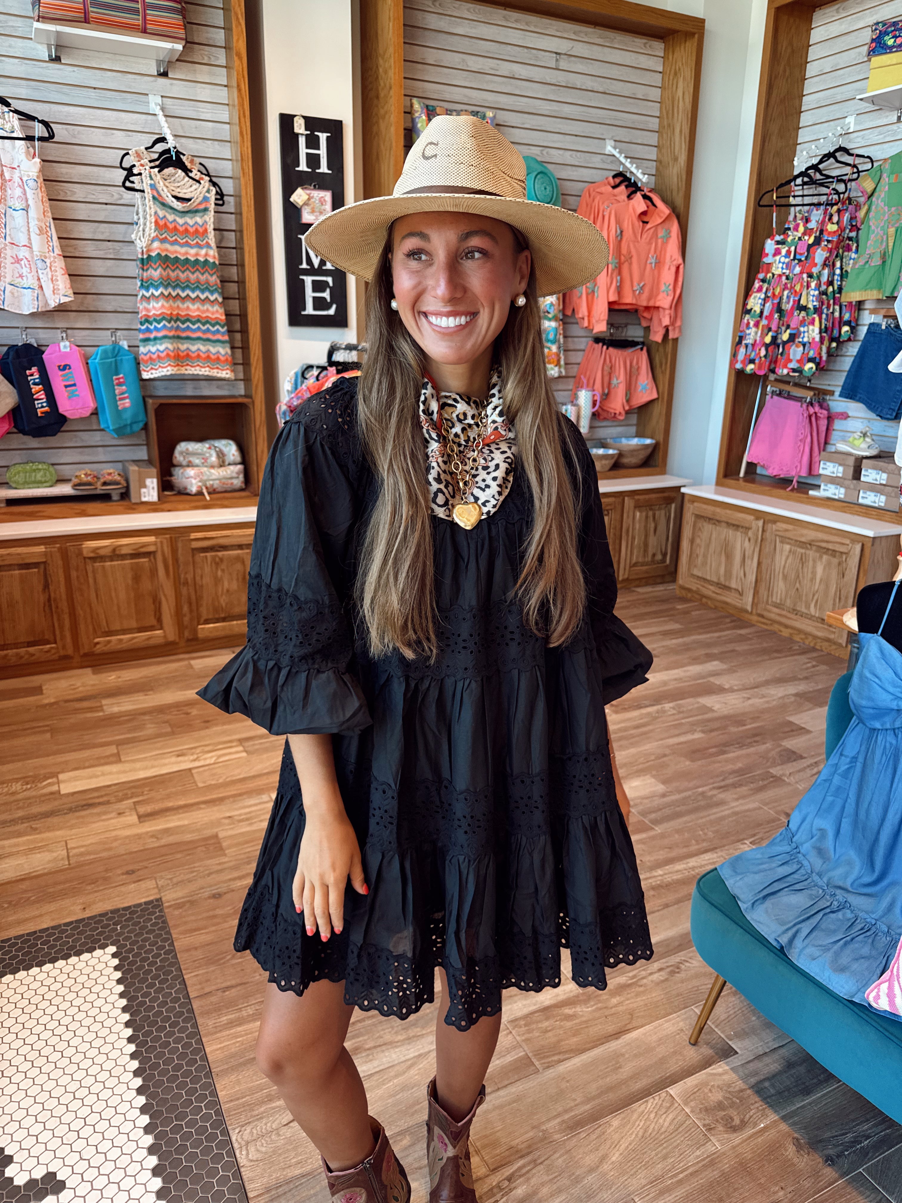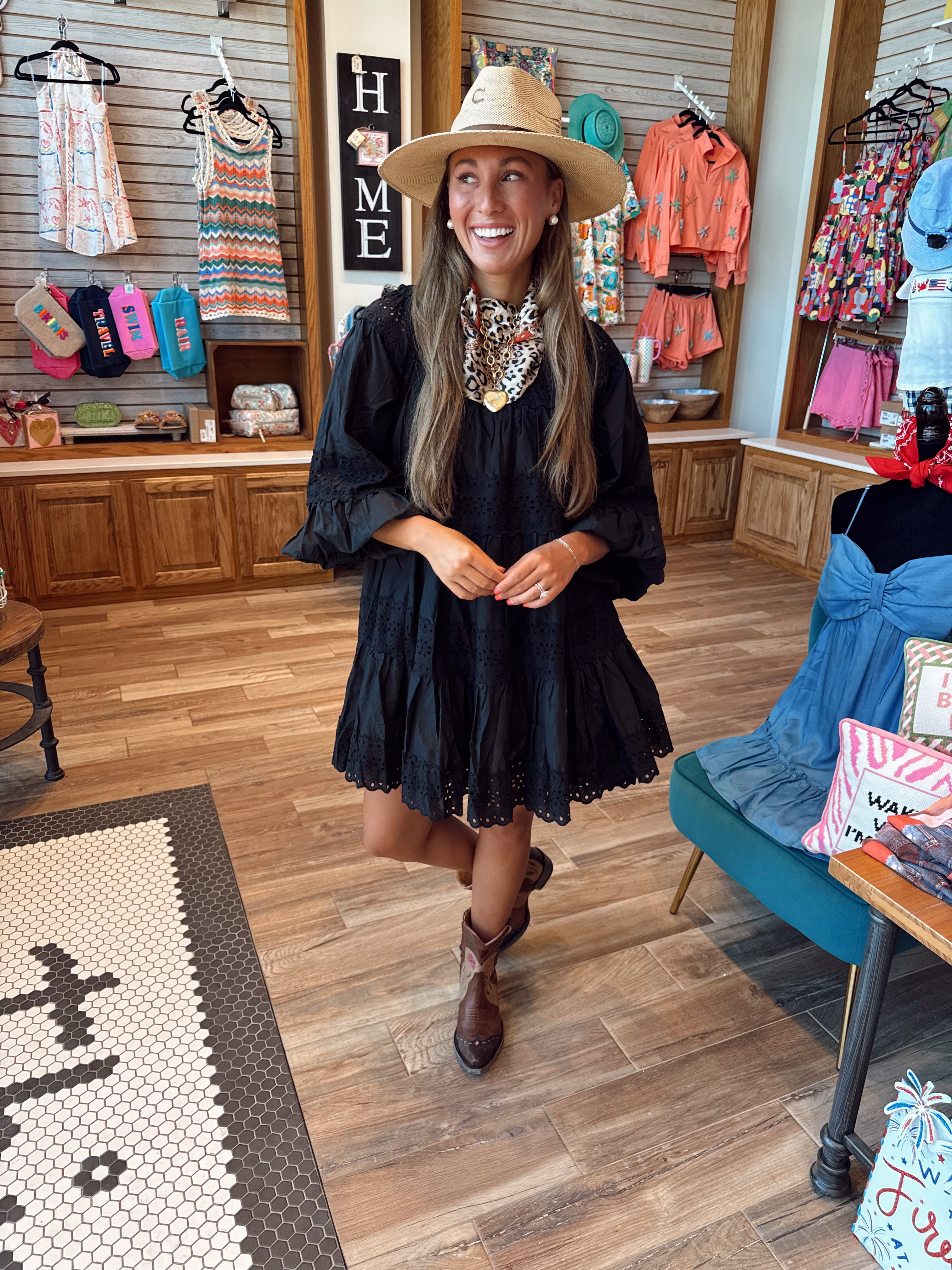 One of our favorite summer transitioning styles! A great little black dress with eyelet detail and a flowy swing style!