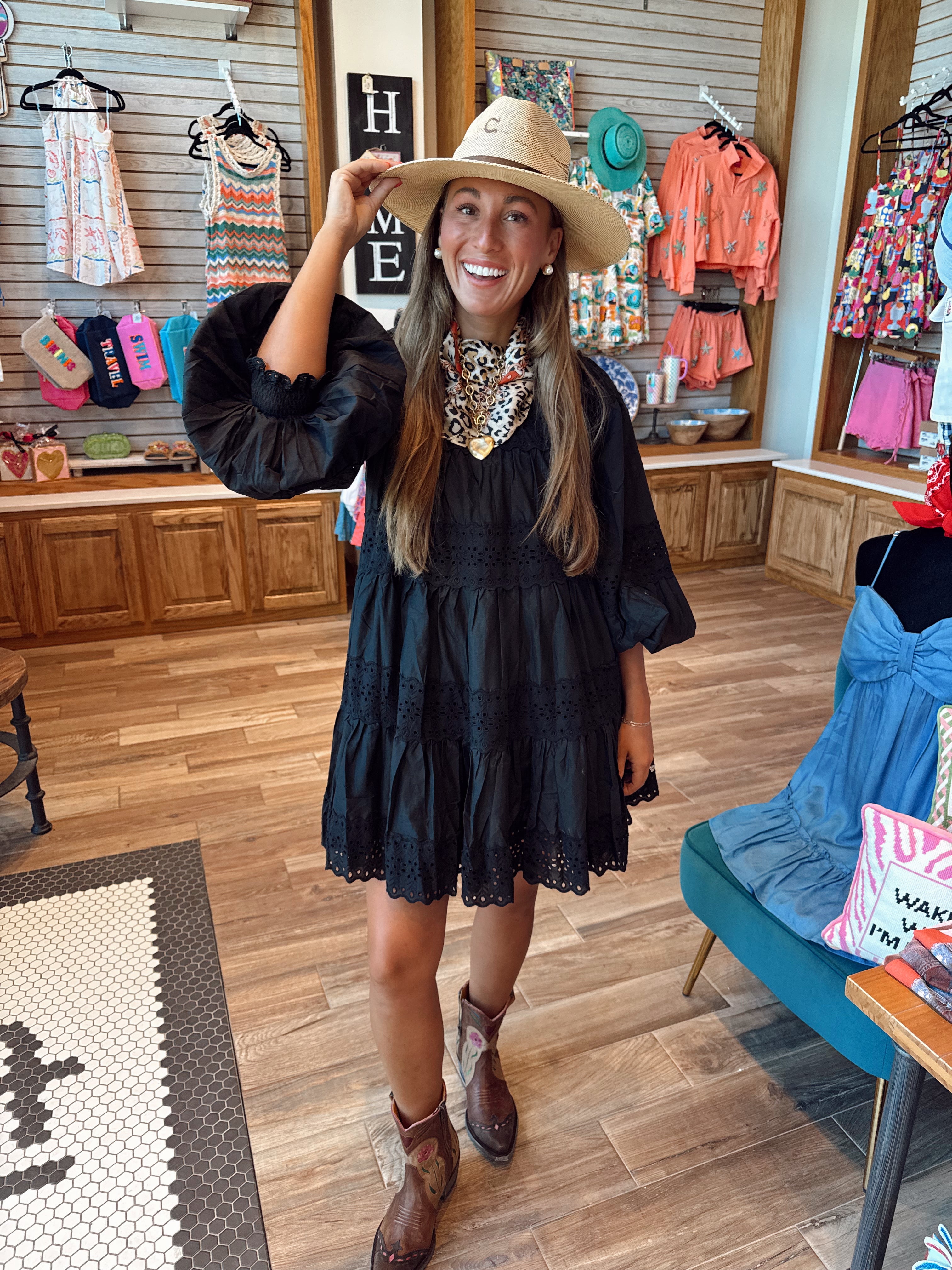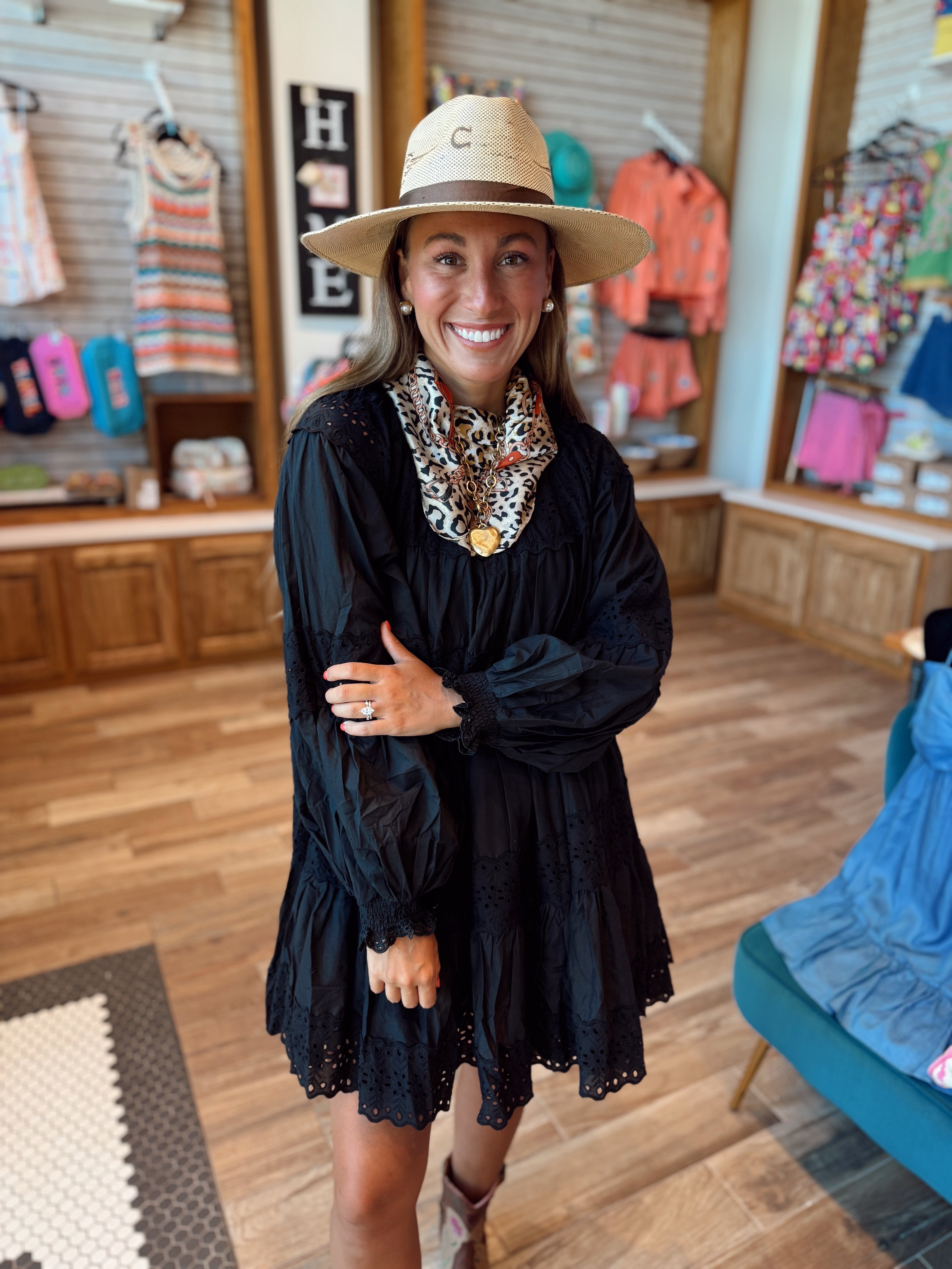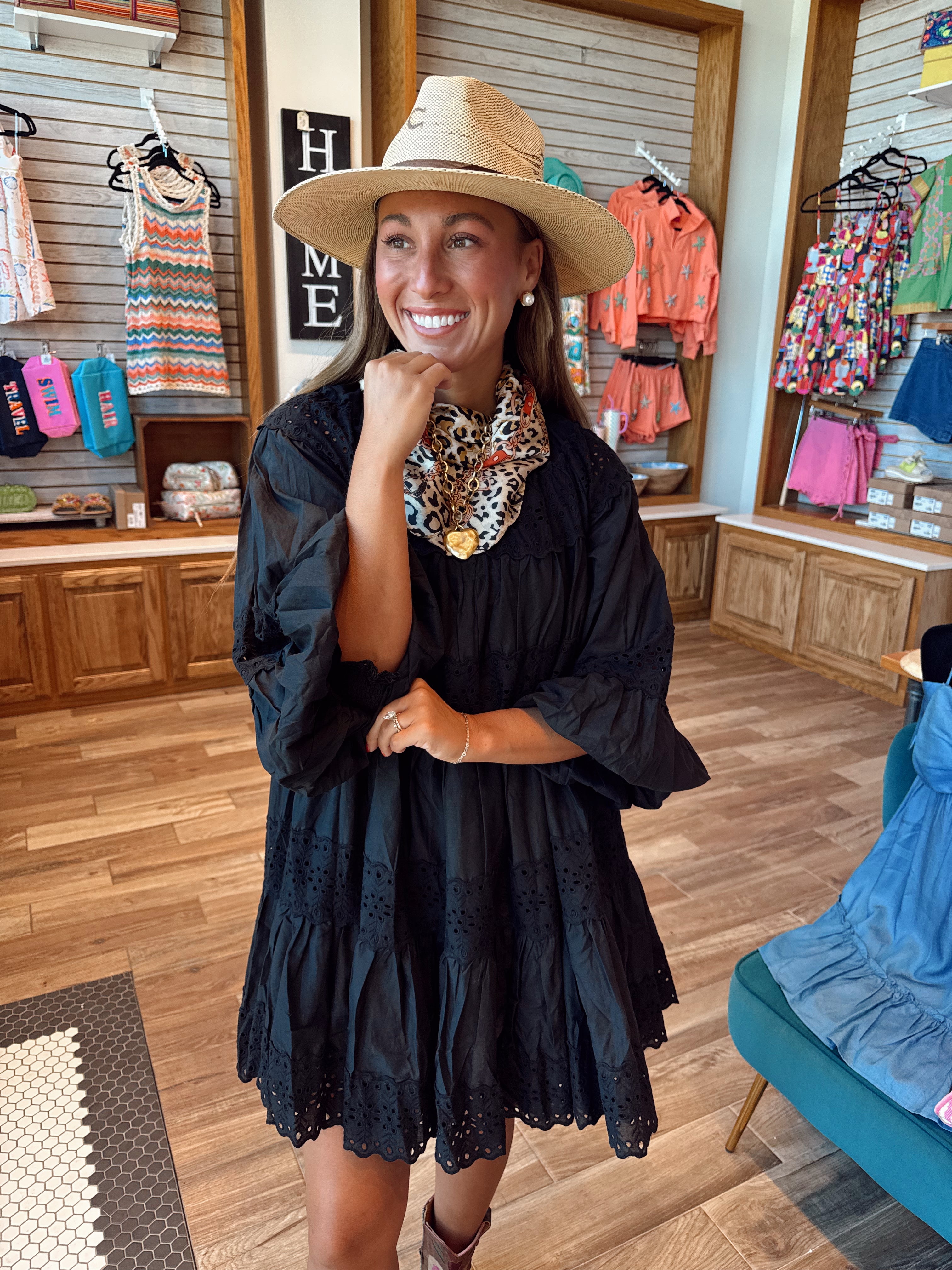 One of our favorite summer transitioning styles! A great little black dress with eyelet detail and a flowy swing style!