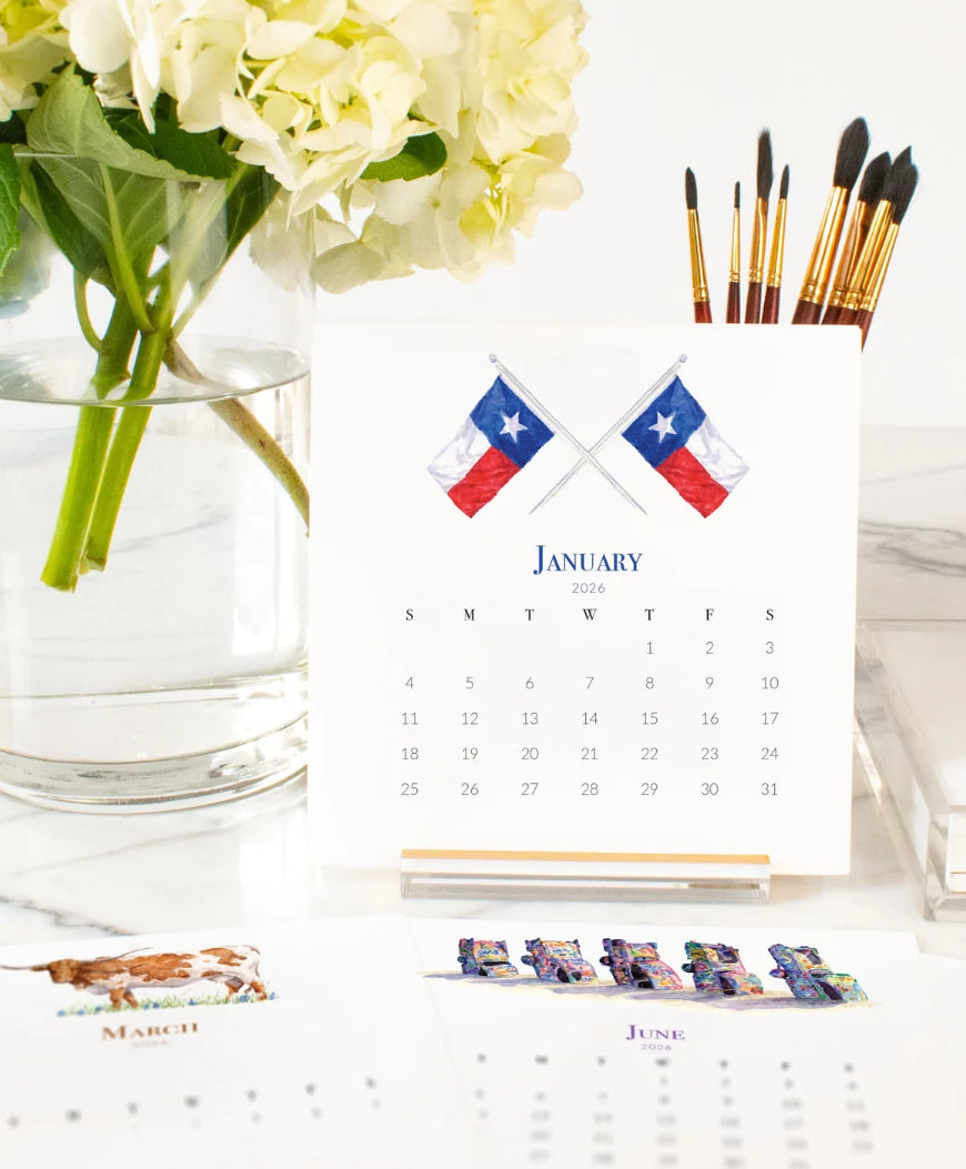 Our best-selling bespoke calendars are back! This handmade Texas-themed desktop calendar is the perfect gift for the whole year! Each monthly placard features the art of Taylor Paladino and is embellished with glittering foil in our studio in Dallas. A beautiful custom-designed acrylic and gold foil easel is included to highlight the month's artwork on your desk, shelf, or counter with a classy and minimalist flair! Each month includes a gift from us to you: a treasured family recipe, cards to send for meaningful occasions, and plenty of other fun surprises.
