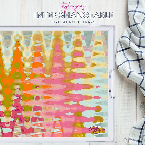 Acrylic trays are all the rage and are definitely on trend. Why should you settle for one design when you can have TEN designs and change them out on a whim? The TAYLOR GRAY acrylic tray is an extra-large 11x17 tray that perfectly fit our 11x17 insert designs. The pocket on the bottom of the tray allows the inserts to be easily interchanged and protected.