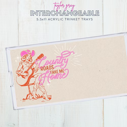 Acrylic trays are all the rage and are definitely on trend. Why should you settle for one design when you can have FIVE designs and change them out on a whim? The TAYLOR GRAY acrylic trinket tray is perfect and petite tray with a pocket on the bottom of the allowing the inserts to be easily interchanged and protected.