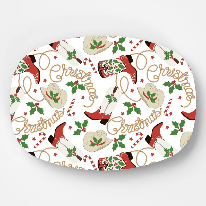 Our brand new platters make a great addition to our entertaining items. They look and feel like melamine, but are BETTER!! This Cowboy Christmas pattern is perfect for holiday entertaining.