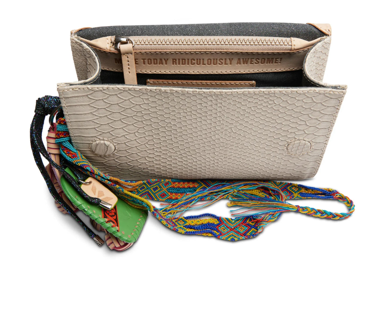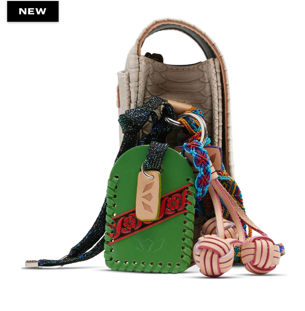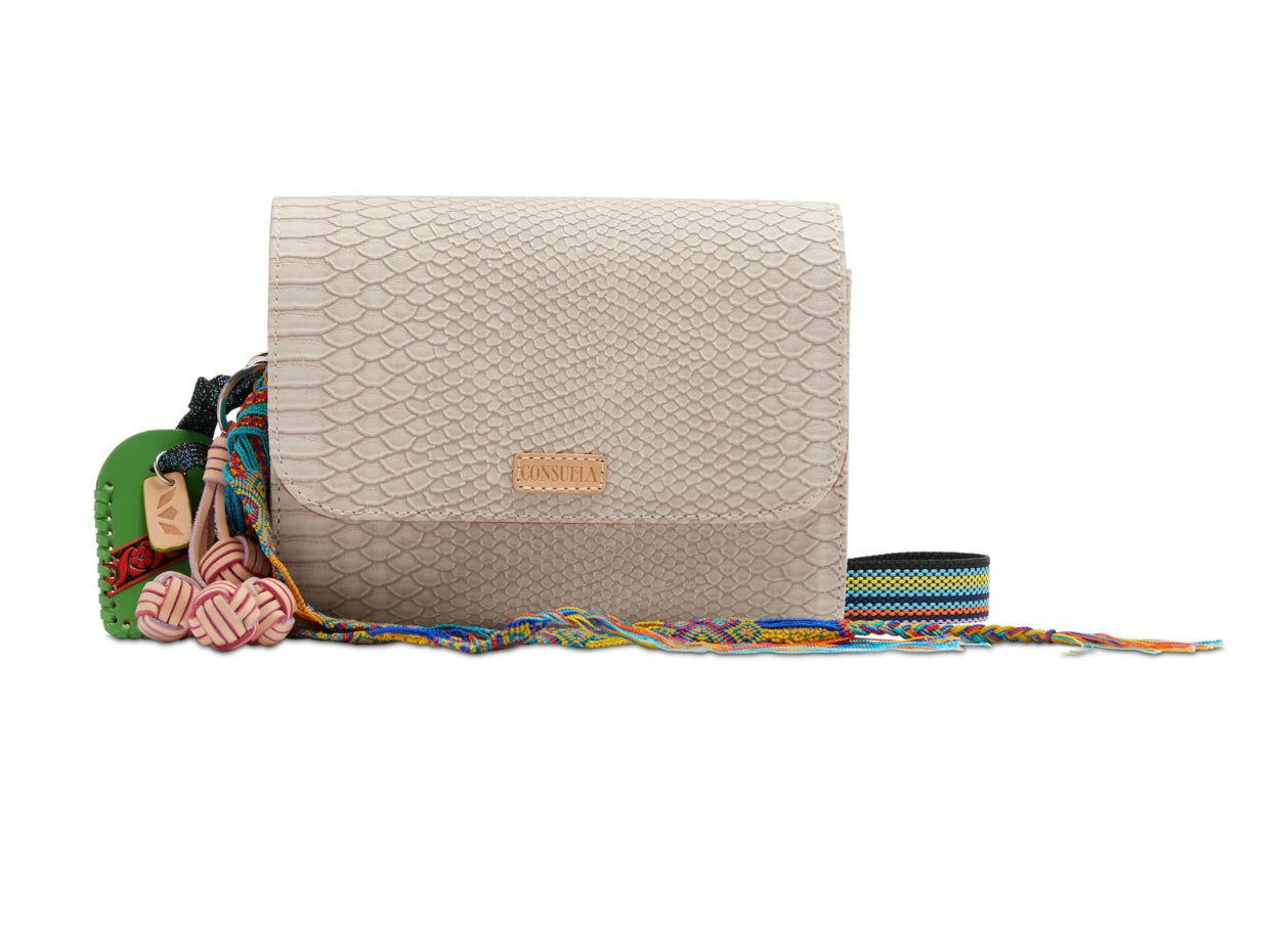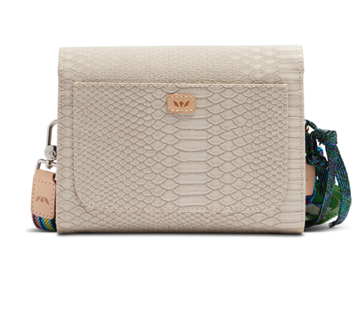 - Adjustable woven crossbody strap