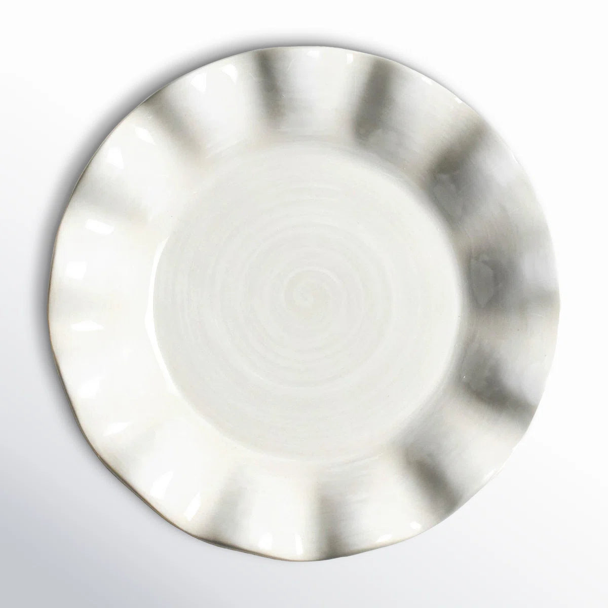 From the shape fashioned from a ball of clay to the colors, patterns, and textures. Light cream and white hand-painted brush strokes grace the artisanal look of the platter. The gentle curves of this Signature ruffle edges bring forth a casual elegance to your dinner table. With its versatile bold size, the Signature Ruffle 8" Salad Plate can be used as a charger or a serving dish. Priced per each.