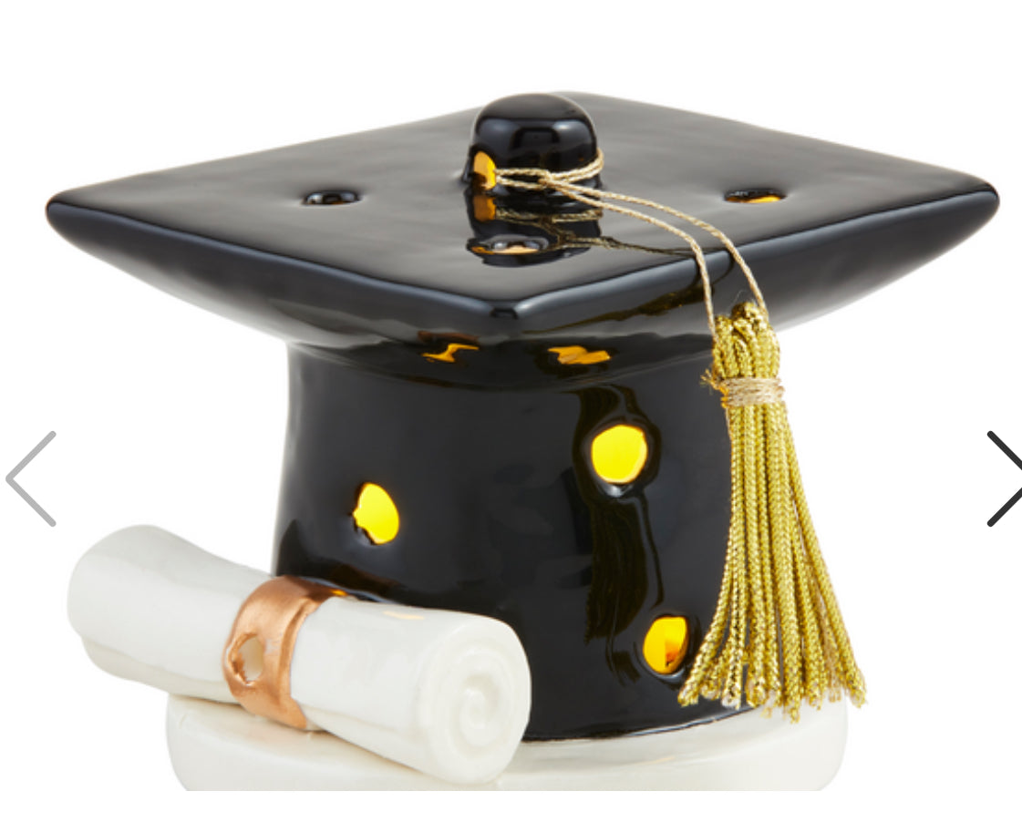 Celebrate your academic achievements with this charming Graduation Cap Light-Up Sitter. Crafted from high-quality hand-painted ceramic, this delightful piece features intricate cut-out details that allow the LED light to shine through, creating a warm and inviting glow. Perfect for adding a touch of elegance to any room, this decorative sitter is both stylish and functional. The included battery ensures that your light-up sitter is ready to illuminate your space right out of the box. Measuring 2 1/2" x 3 1/2" in diameter, this compact yet eye-catching piece is made from durable dolomite, making it a lasting keepsake of your special day. Whether displayed on a shelf, desk, or mantel, this graduation cap sitter is a wonderful way to commemorate your accomplishments and inspire future successes.