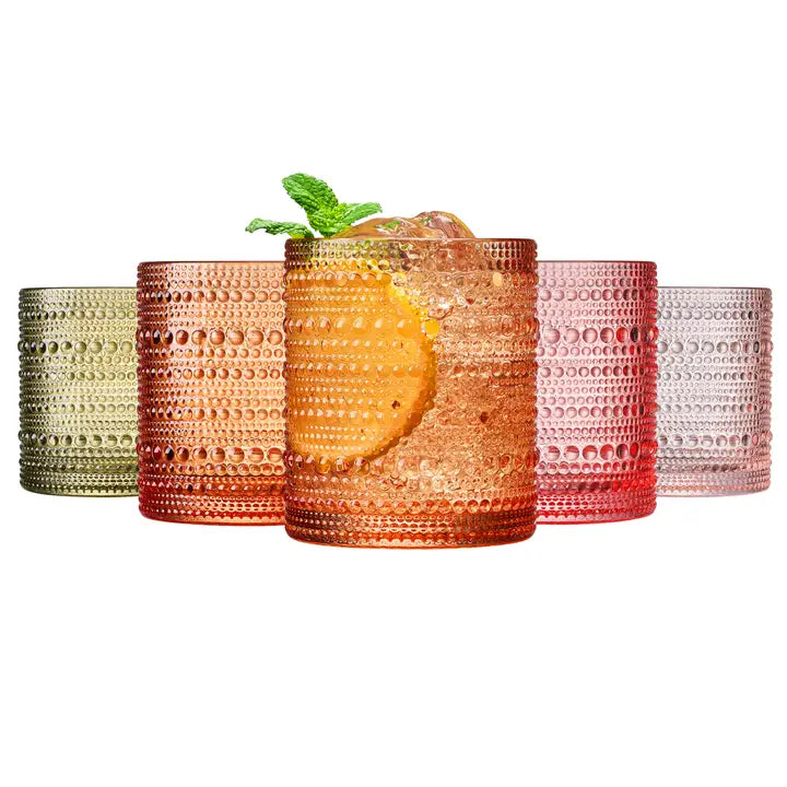 Introducing the Beaded Hobnail Tumbler Drinking Glasses Set, a beautifully designed collection of six vintage-inspired glasses perfect for adding a touch of elegance to any occasion. Each glass in this set holds 11 ounces and features a stunning hobnail texture, giving it a unique, retro look that blends perfectly with modern decor. The Vintage Sunset Colored hues of these glasses evoke a warm, muted charm that enhances the presentation of your favorite beverages, from whiskey to wine, cocktails to water.