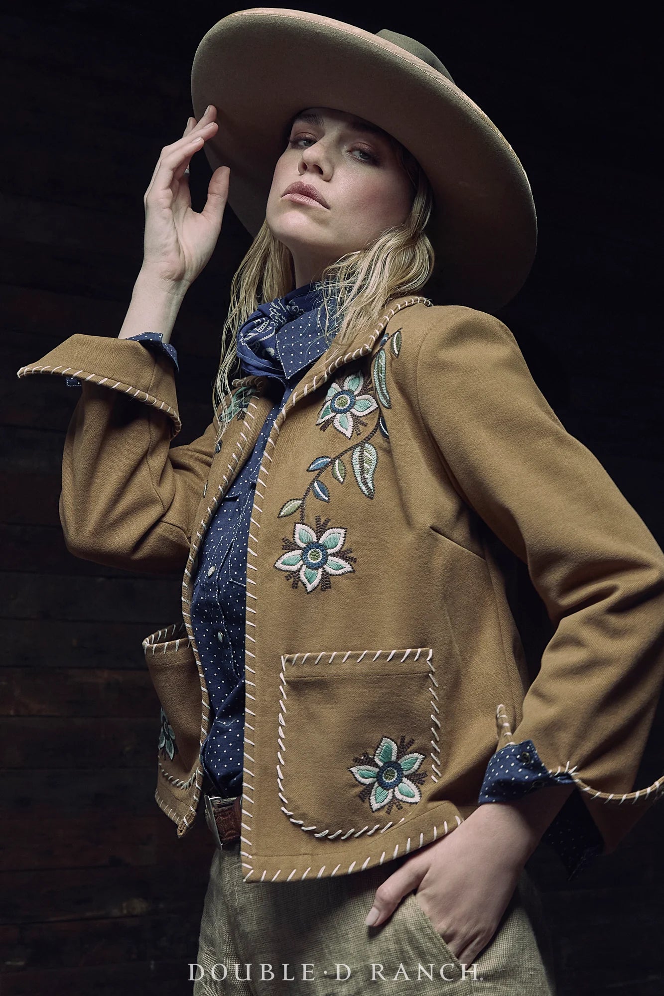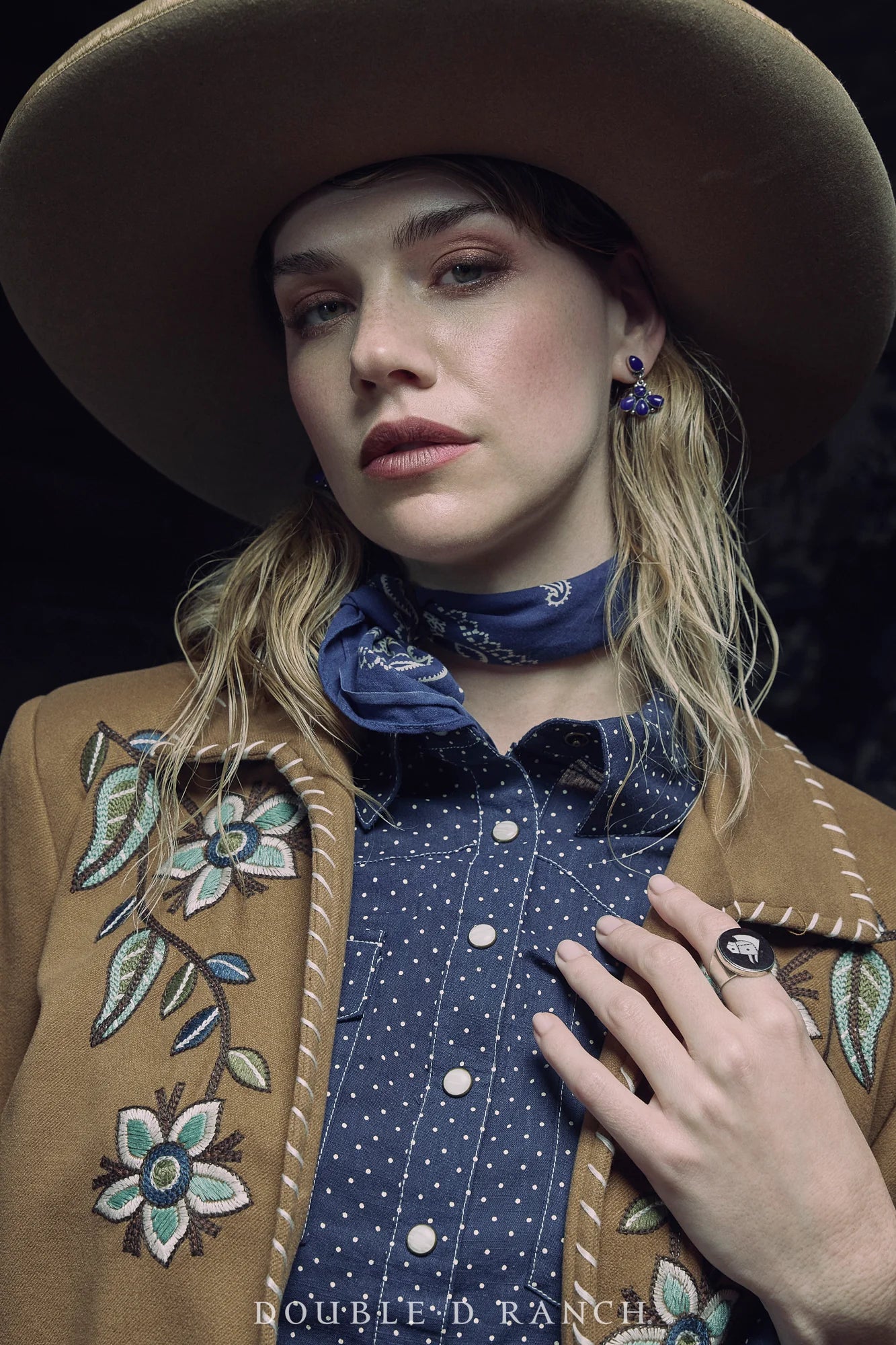 An exquisite alternative to your leather biker, this beauty has all the aesthetic and embellishments you expect from Double D Ranch, but brought to life on a luxe blended fabric that’s perfect for transitional seasons and an easy outfit upgrade. The warm caramel ‘elk horn’ brown is complemented by lovely light blue floral embroidery and a bucking bronc ridin’ cowboy on the back. It’s finished with contrast whipstitching for a little touch of twang!