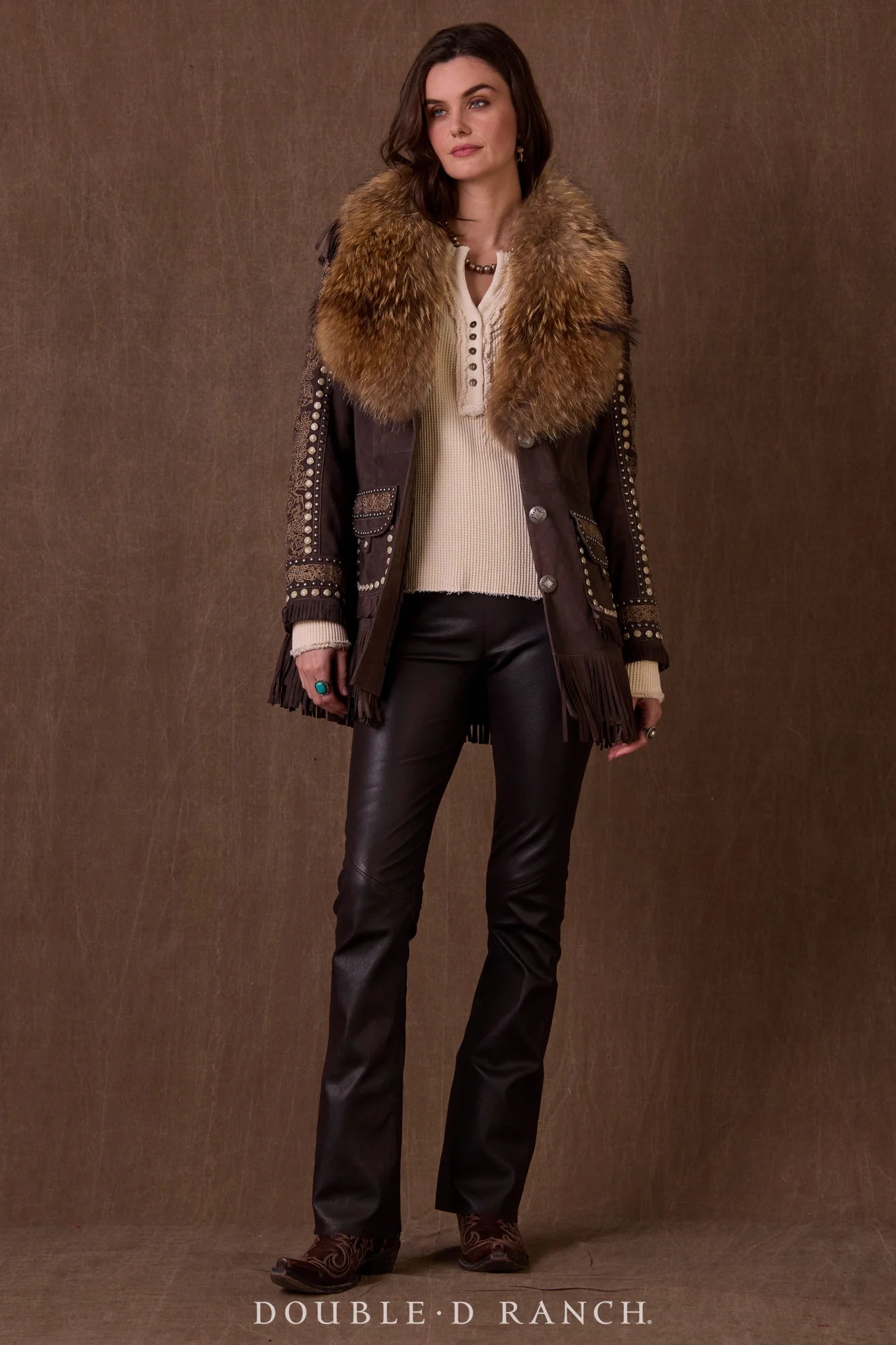 An instant collector, this stunning statement jacket is timeless enough to be a lifelong mainstay in your wardrobe, yet remarkable enough people will definitely remember it. The gorgeous sheep suede is in this season’s signature shade of ‘bronco’ brown, embellished with intricate embroidery and beadwork, accented by chic pearl snap trim. The elevated hits-below-the-hip silhouette is finished with fringe and complemented with a head-turning full volume fur collar.