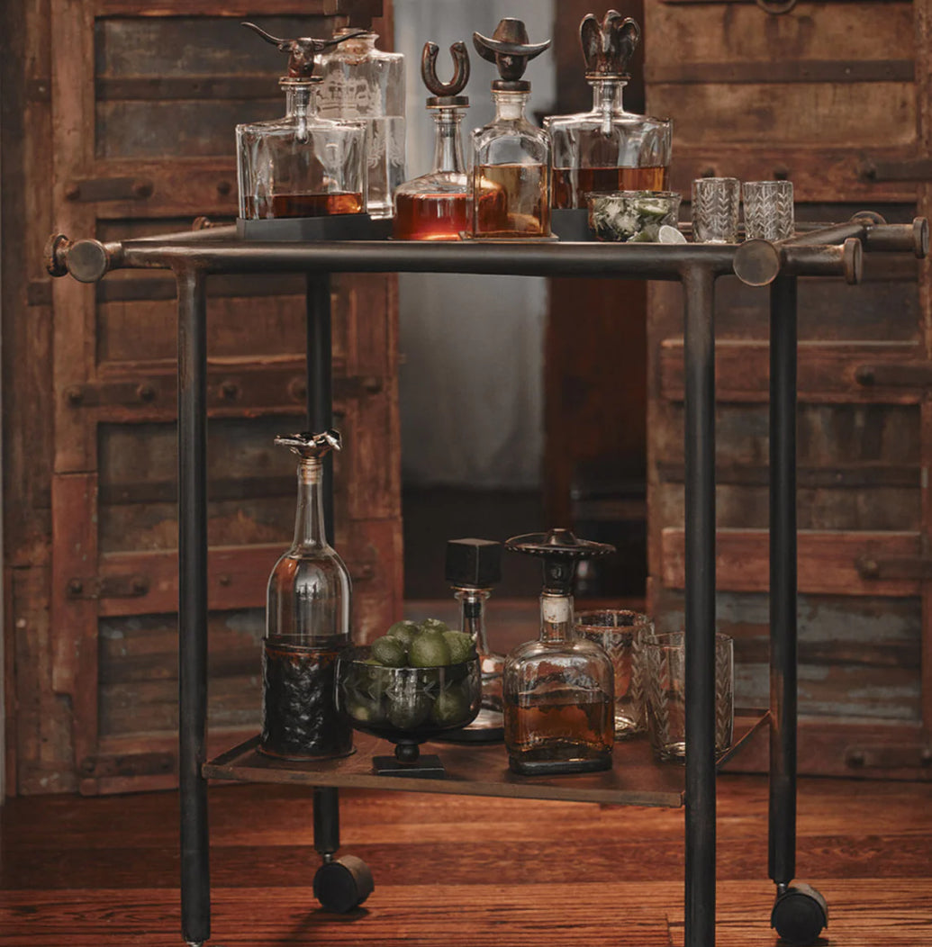 The Gioberto Bar Cart by Jan Barboglio adds a touch of elegance and versatility to any setting, featuring a wax cast iron frame with a tray top and handles.