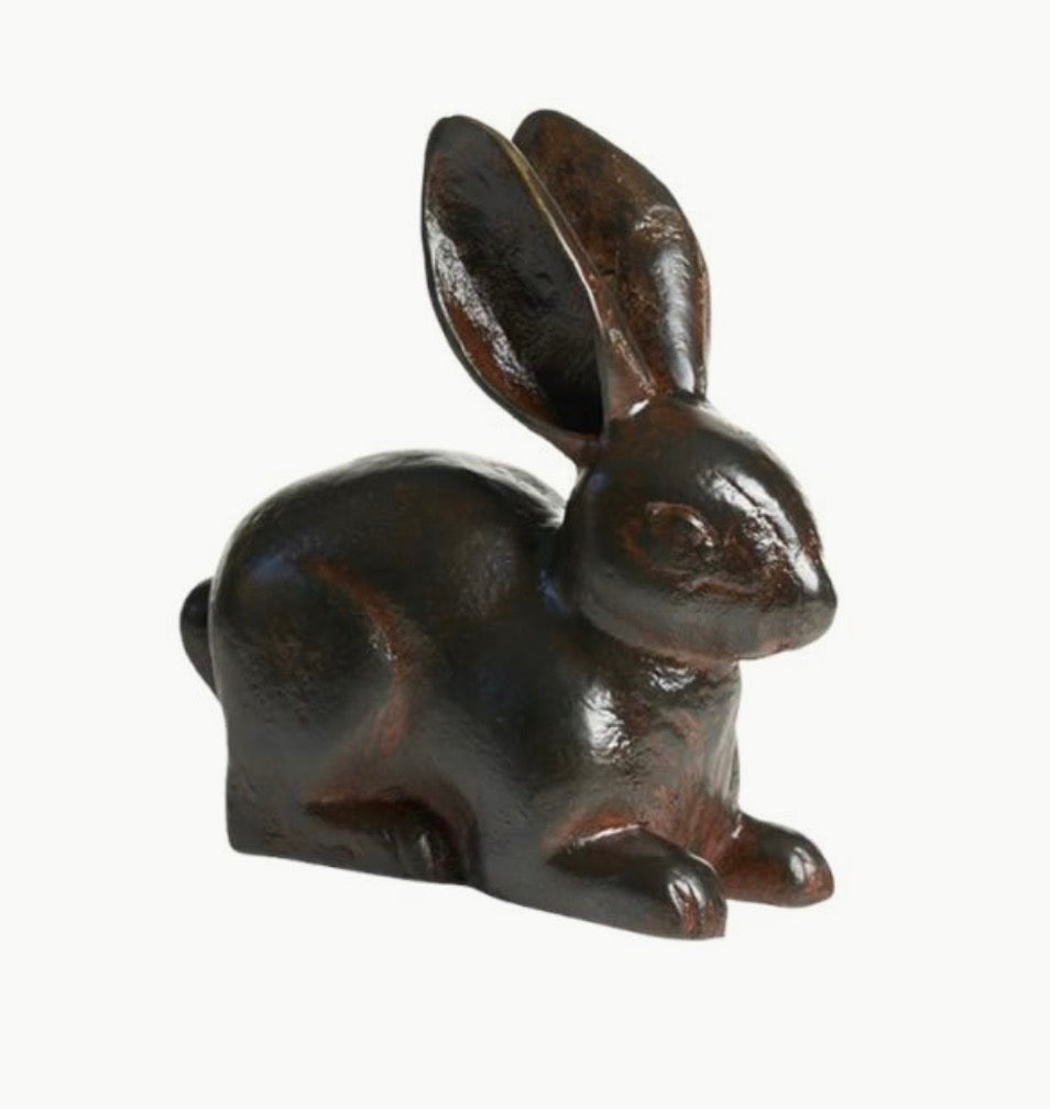 Hippity hop...cast iron bunny rabbit with large ears...collect one or a family...doorstop, centerpiece, or in the garden. Care instructions: Wipe with a clean, dry cloth. Outdoor use will accelerate the iron aging process.