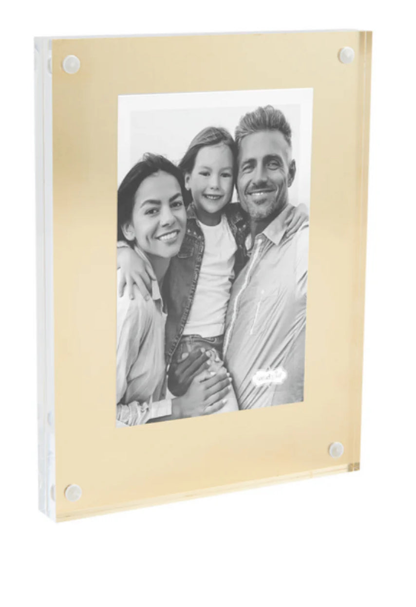 The Brass Acrylic Frame offers a stylish and modern way to showcase your favorite photos. With its sleek acrylic block design and brass detail, it adds a touch of elegance to any space. The frame measures 4" x 6" or 5" x 7" and features a magnetic acrylic surface, making it easy to switch out photos as desired. Whether you're displaying a cherished memory or creating a gallery wall, this frame is the perfect choice.