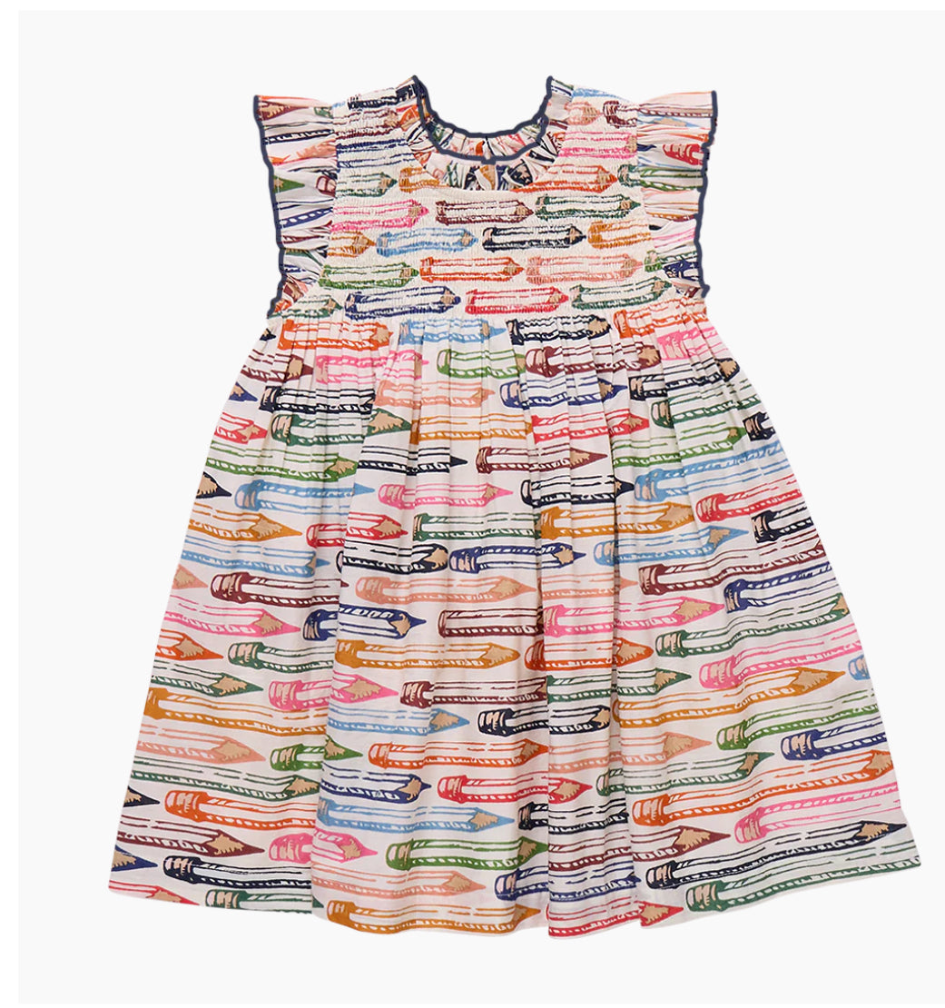 School Supplies! Our graphic Colored Pencils print will make your art teacher swoon! This vibrant pattern brings our flock favorite Stevie Dress to life in vivid color. This collection staple boasts a fluttery ruffled arm, subtle ruffle at the neck and vintage inspired smocking at the chest. Invisible zipper closure at the back.